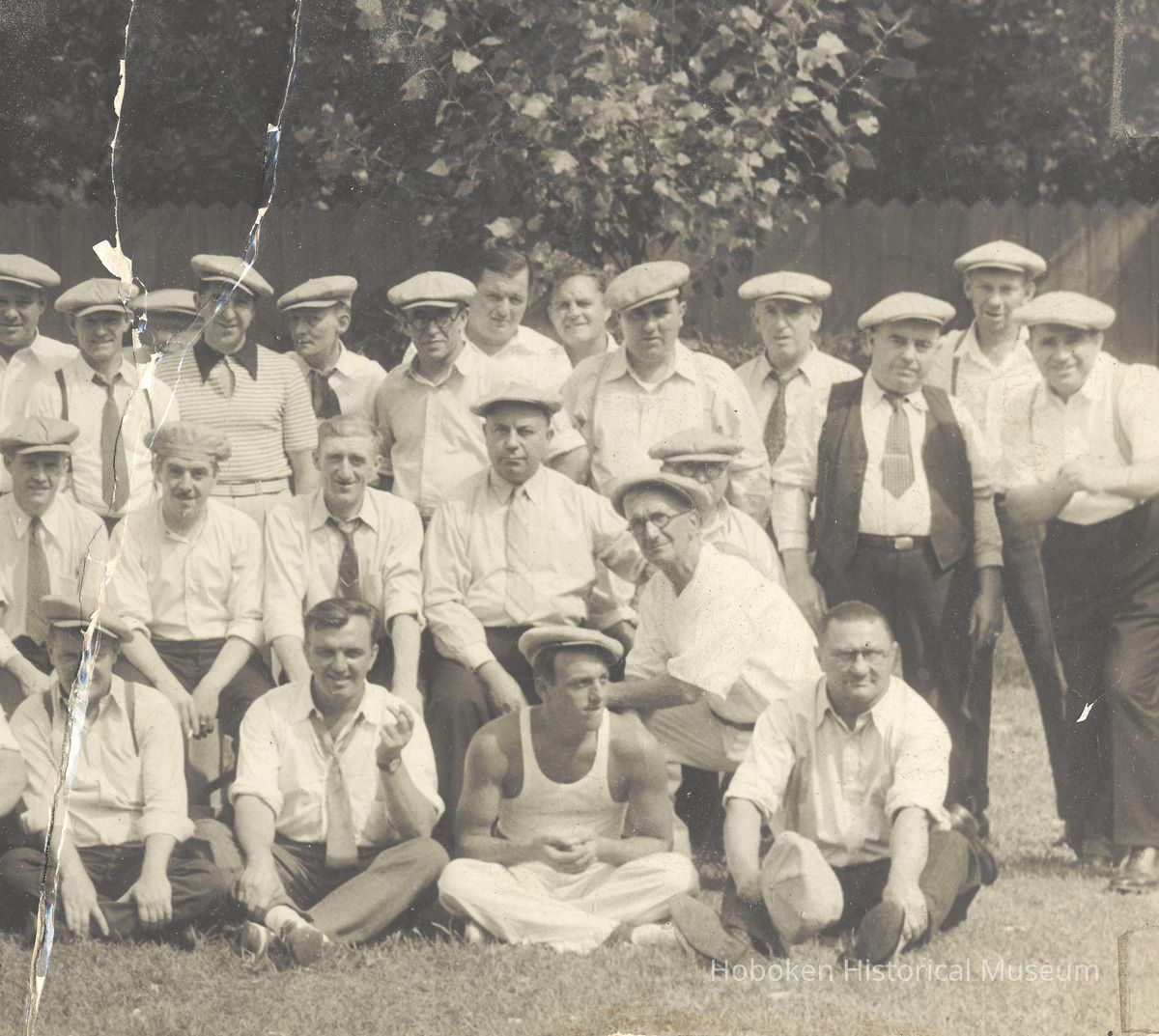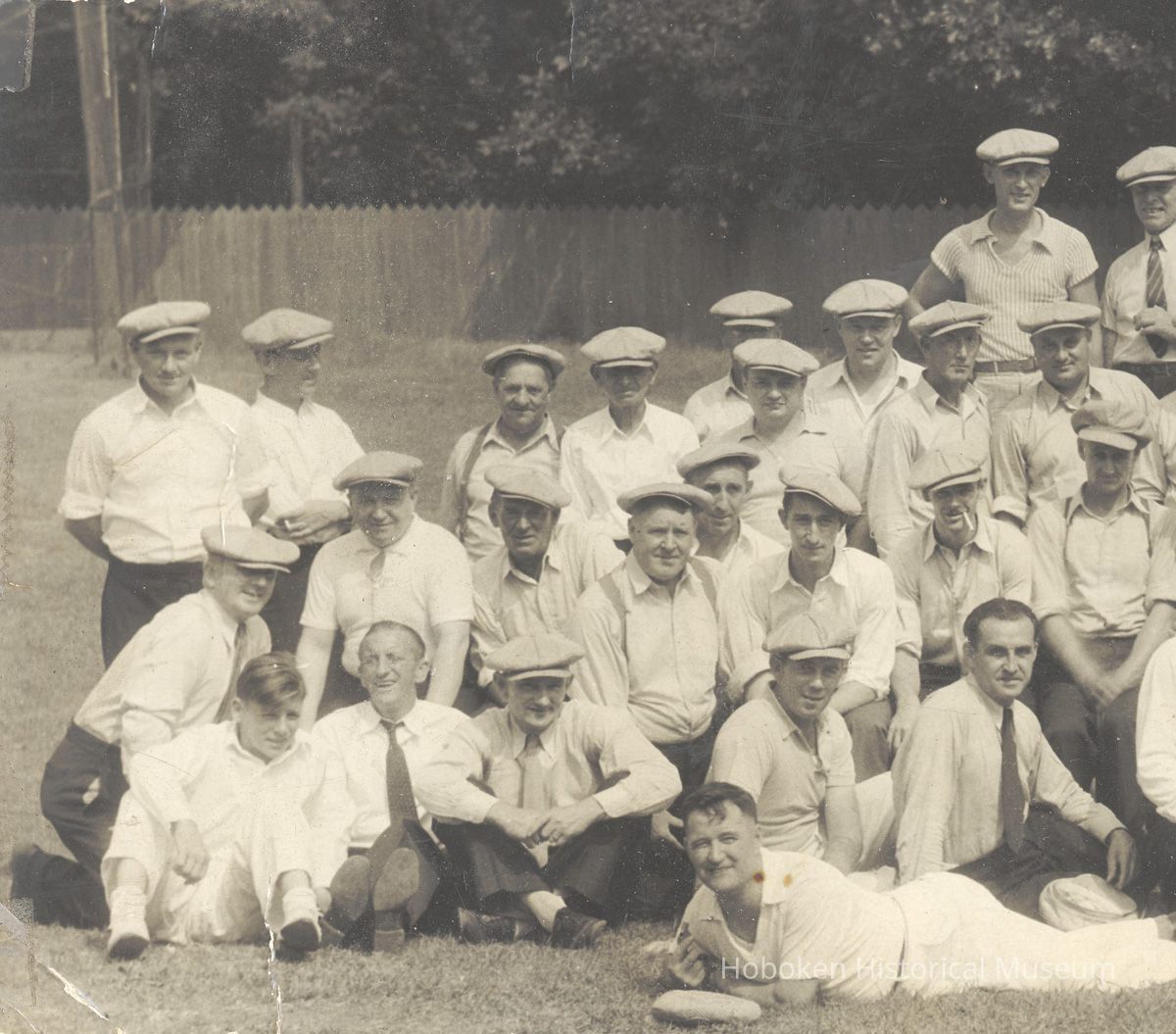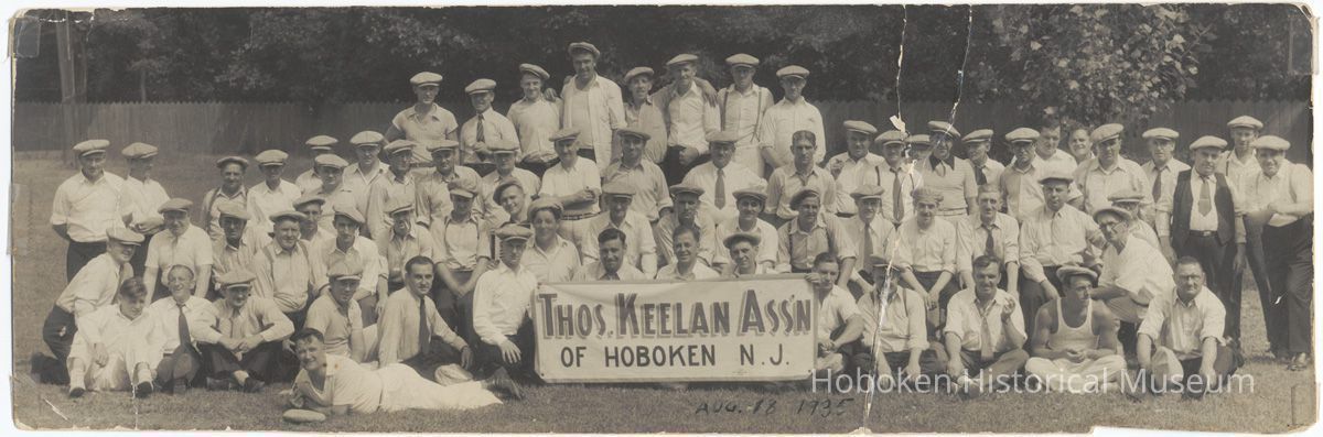 B+W panoramic group photo of members of the Thomas Keelan Association of Hoboken, N.J., no place (Fairlawn, N.J.?), August 18, 1935.