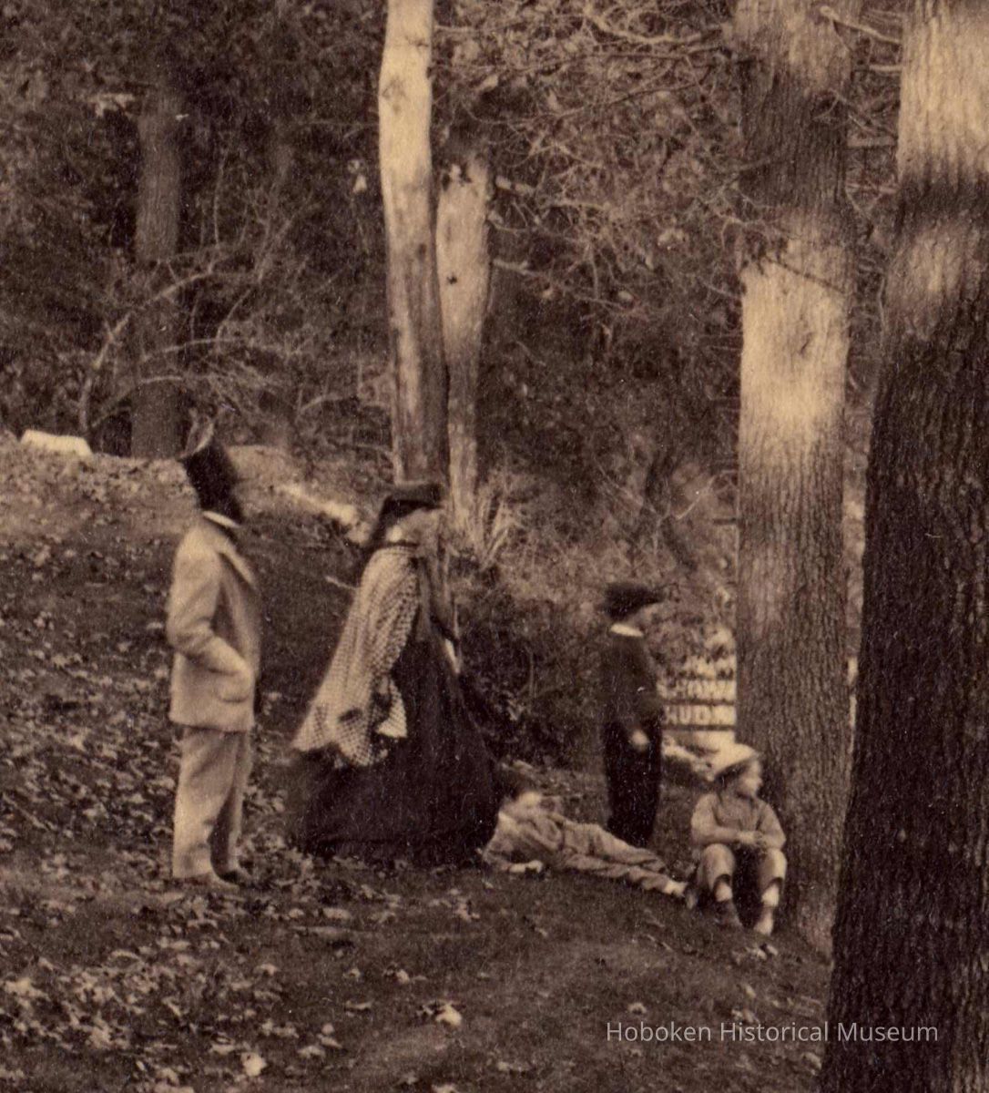 The view is looking apparently northeast on what is believed to be Castle Point area (estate of the Stevens family), possibly from about Sixth Street. A man, woman and three children are seen looking towards New York. None are identified. The sign seen between two children is not fully legible; one word appears to be "Hudson." A wood fence runs east-west on the hill. Note telegraph / telephone wire poles are seen below along River Walk.