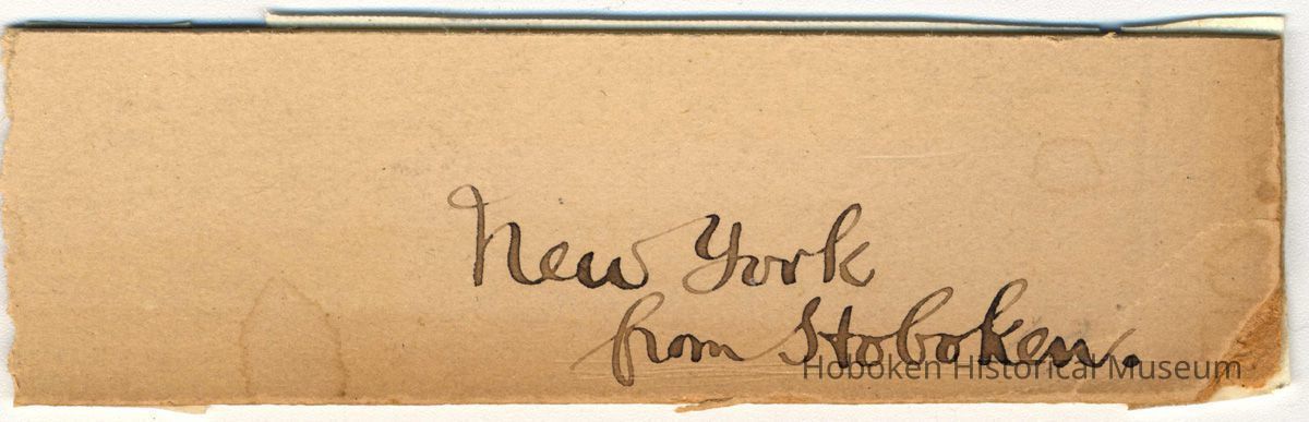 With: remnant of original mounting board, ca. 1" high x 3-1/4" wide, with a contemporary ink title "New York from Hoboken" on the front.