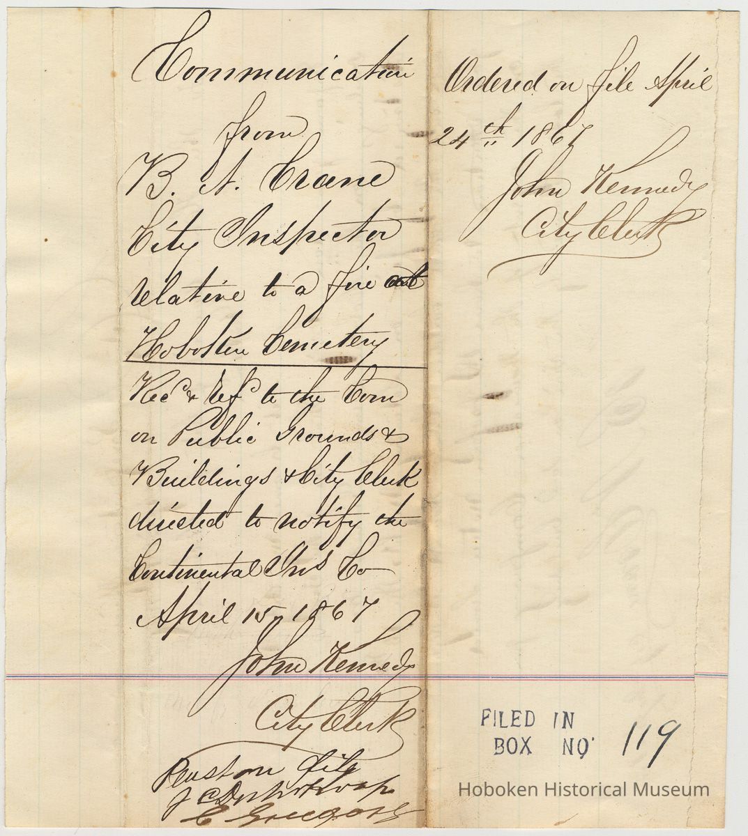 Letter from City Inspector B.N. Crane to City Council, Hoboken, April 15, 1867 informing them of house at Hoboken Cemetery ground destroyed by fire on the 13th; requesting the insurance company be notified of the loss. Holographic ink on lined paper, 7" x 8"; folds. City Clerk John Kennedy file notes and numbers.