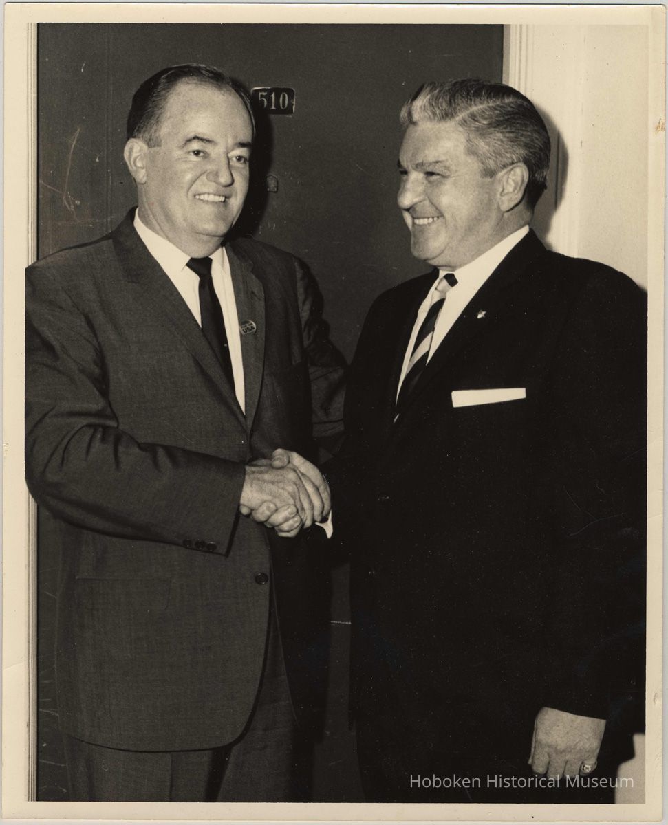 B+W photo of John J. Grogan (right) shaking hands with Hubert H. Humphrey, n.p., n.d., ca. 1960-1968.