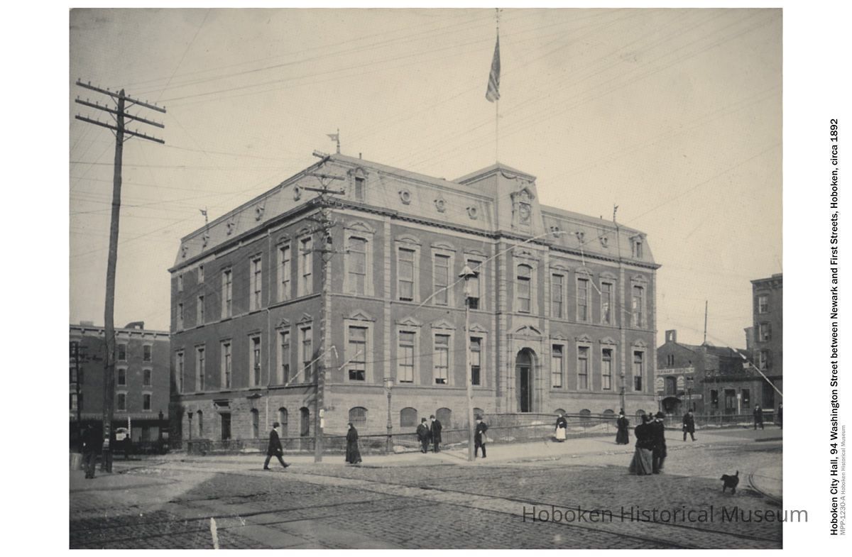 Hoboken City Hall as seen in a photo from 1892. The image is a photographic print of a published photographic image with a printer's screen evident.