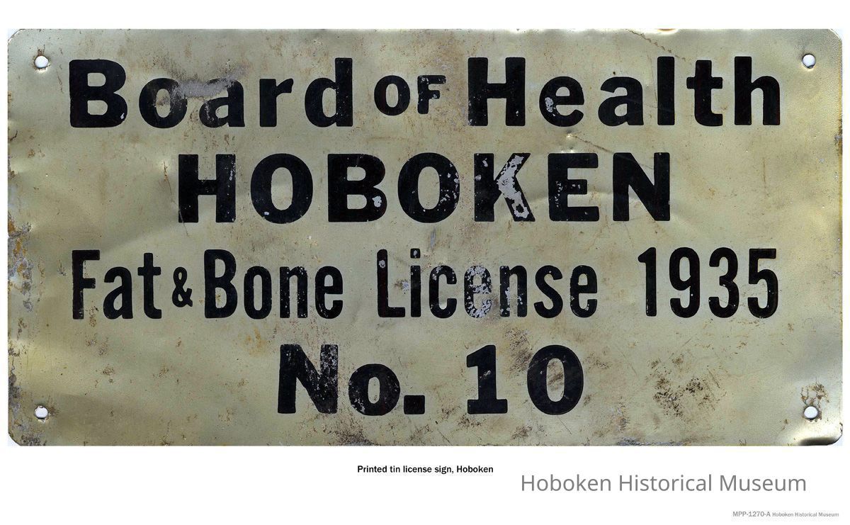 Photo of Board of Health, Hoboken; Fat & Bone License 1935, No. 10. Image only associated with this record; see object record 2003.064.0001 for original item a printed metal sign.