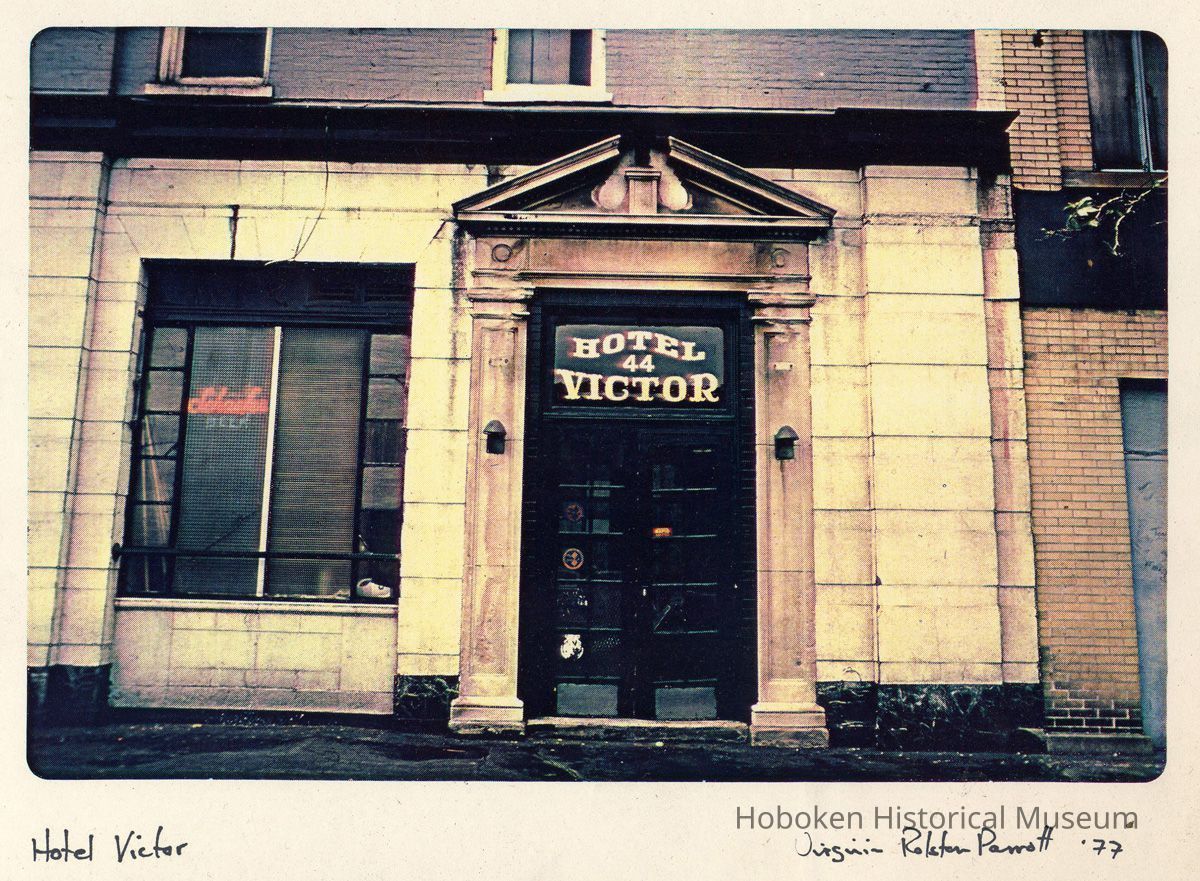 Color image of exterior view of the entrance to the Hotel Victor, 44 Hudson Place, Hoboken, 1977. Color photocopy from slide transparency, 6-1/4" x 9-1/2" wide image. Photo taken by Virginia Rolston Parrott. Print is ca. 11" wide x 8" high mounted on 1/4" foamcore board. Title, signed and dated by the photographer in lower margin. Reverse is blank.