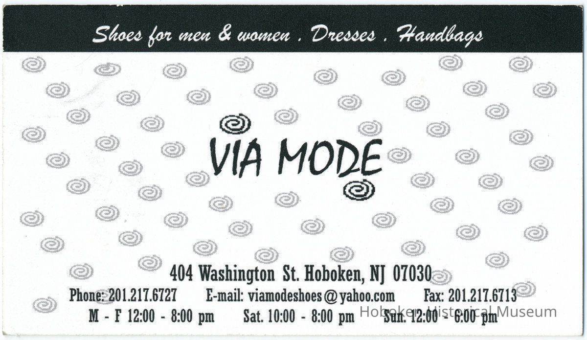 Business card: Sole Search, 801 Washington St. & (verso) Via Mode, 404 Washington Street, Hoboken, (2006).
