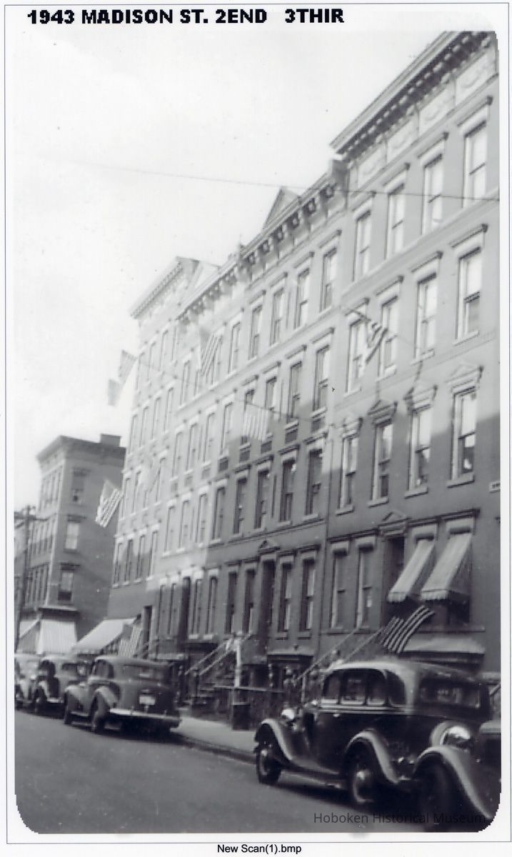 Black-and-white digital print of photo of buildings on east side of Madison Street, 200 block, Hoboken, 1943.