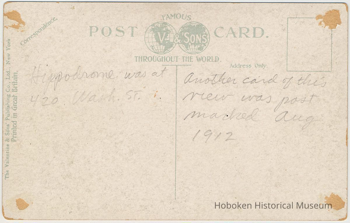Date(s) Created: 1905-1908 Date(s): 1905-1908 Copies: Digital files for prints and physical files of duplicated prints: Museum Print Program (MPP) Series 1001-1999. Prints in this series were originally in Jim Hans books labeled "1-A" and "1-B" Location of Originals: Original is in Museum Print Program under accession 2007.040; Historic Hoboken images purchased in bulk in 2007 from Jim Hans.