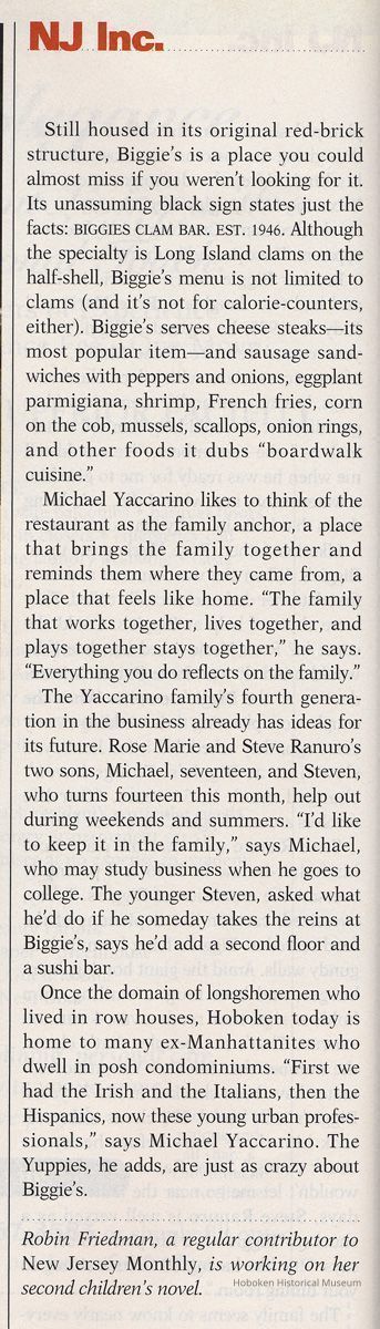 Article: Biggie's Clam Bar. New Jersey Monthly, November 2002, pp. 51, 53-54.
