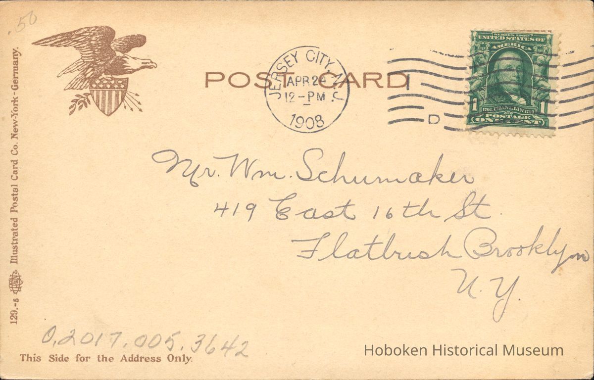 Postcard: Van Vorst Park, Jersey City, NJ Postmarked Apr 24, 1908 Colorized 3 1/2 x 5 1/2"