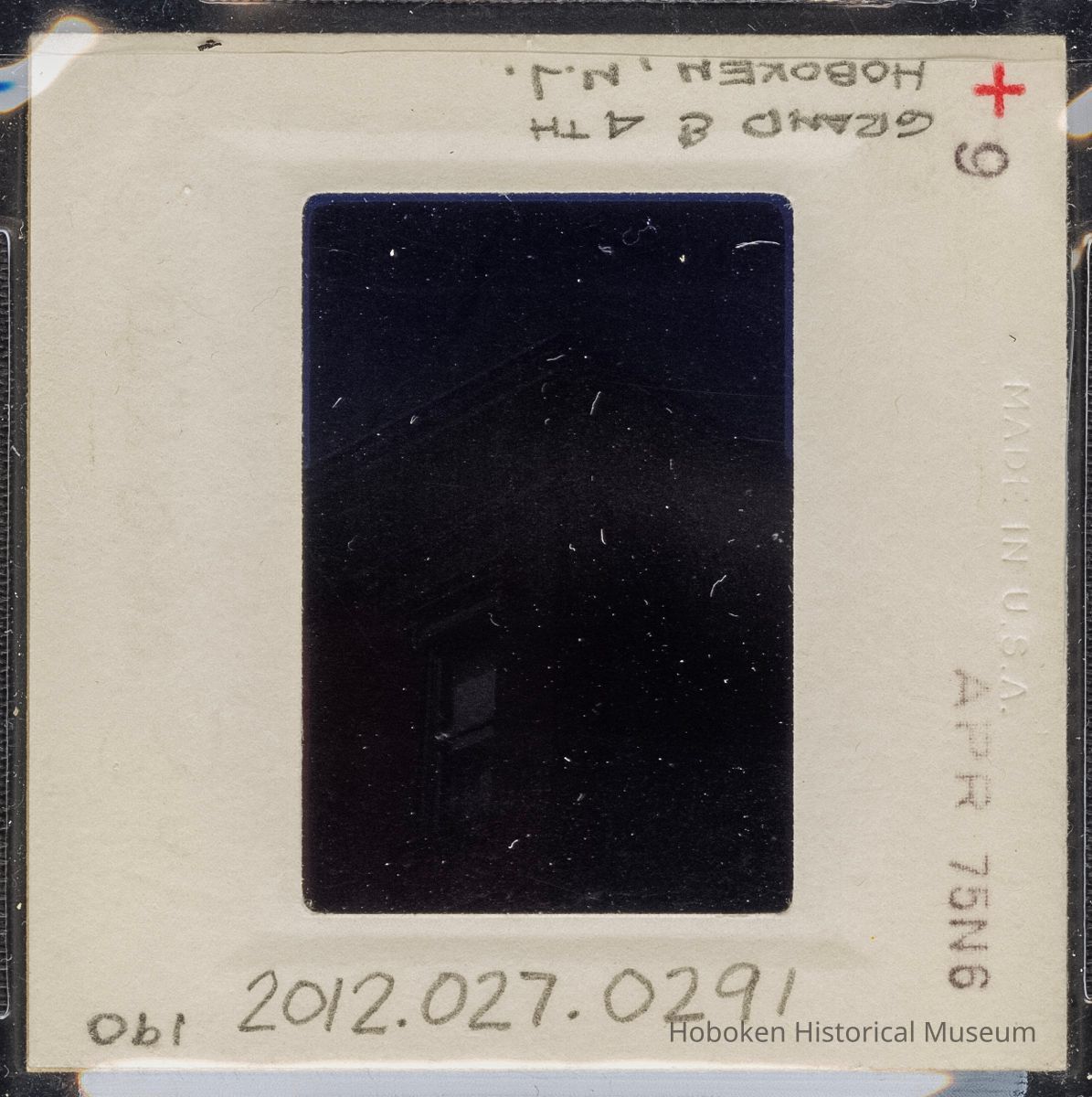 Color slide of detail view of cornice, brackets, dentils, frieze and window heads at 400 Grand on the NW corner with 4th