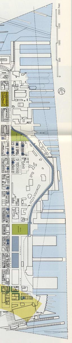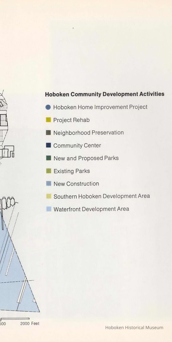 Map of Hoboken, digital reference images, as printed on pgs. 18-19 of booklet Hoboken ...Reaching Out to Tomorrow. Community Development Agency, Hoboken, May 1975. Map as printed, 8-3/8" high x 22" wide. cf. archives catalog 2003.026.0002. PDF on file.