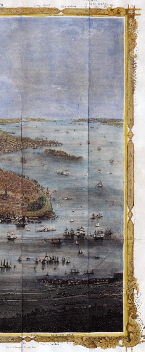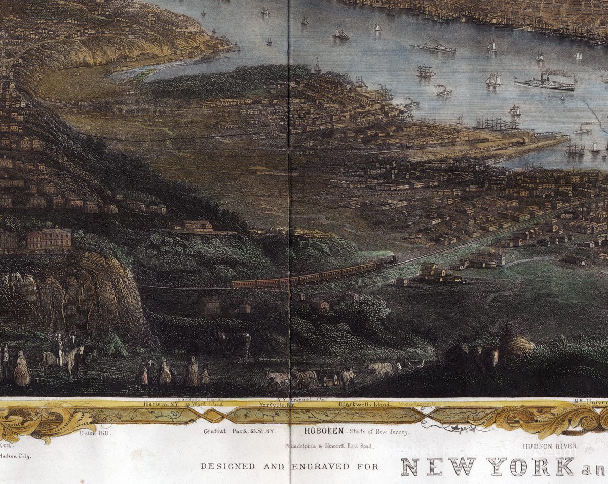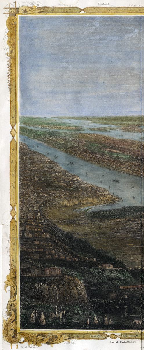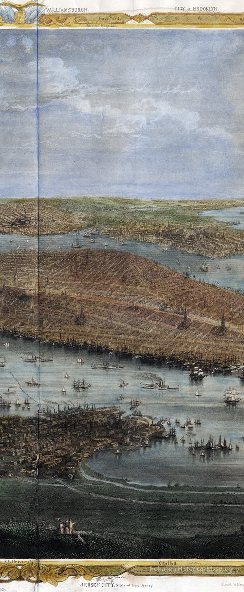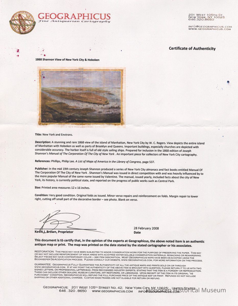 Map: New York and Environs. (A bird's-eye view of New York from the southwest which includes the western shore of the Hudson; Hoboken is seen at the lower left.) From the 1868 edition of Joseph Shannon's Manual of the Corporation of the City of New York. (Commonly known as "Shannon's Manual"; on the map it is called "The New York Manual 1868.") Map by W. C. Rogers & Co., Lithographers (not so marked on work; established by reference source; see notes.)