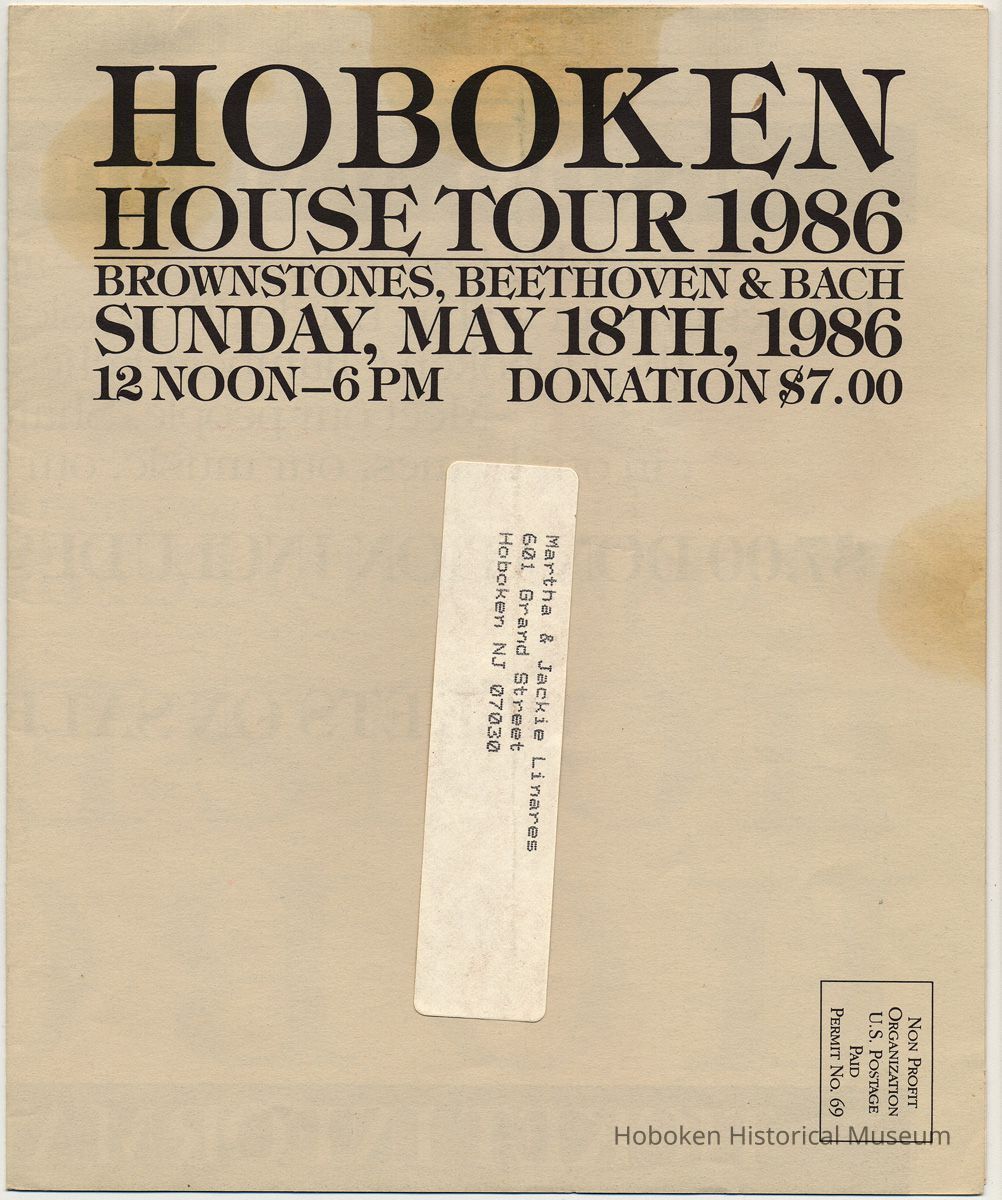 Poster & guide: A New Hoboken House Tour. Brownstones, Beethoven & Bach for the Benefit of the Hoboken Chamber Orchestra. Sunday, May 18, 1986, Noon-6 PM. Printed sheet 14" wide x 17" high with poster on inside; folded to 8-1/2" x 7" wide for a [4] page guide with map.