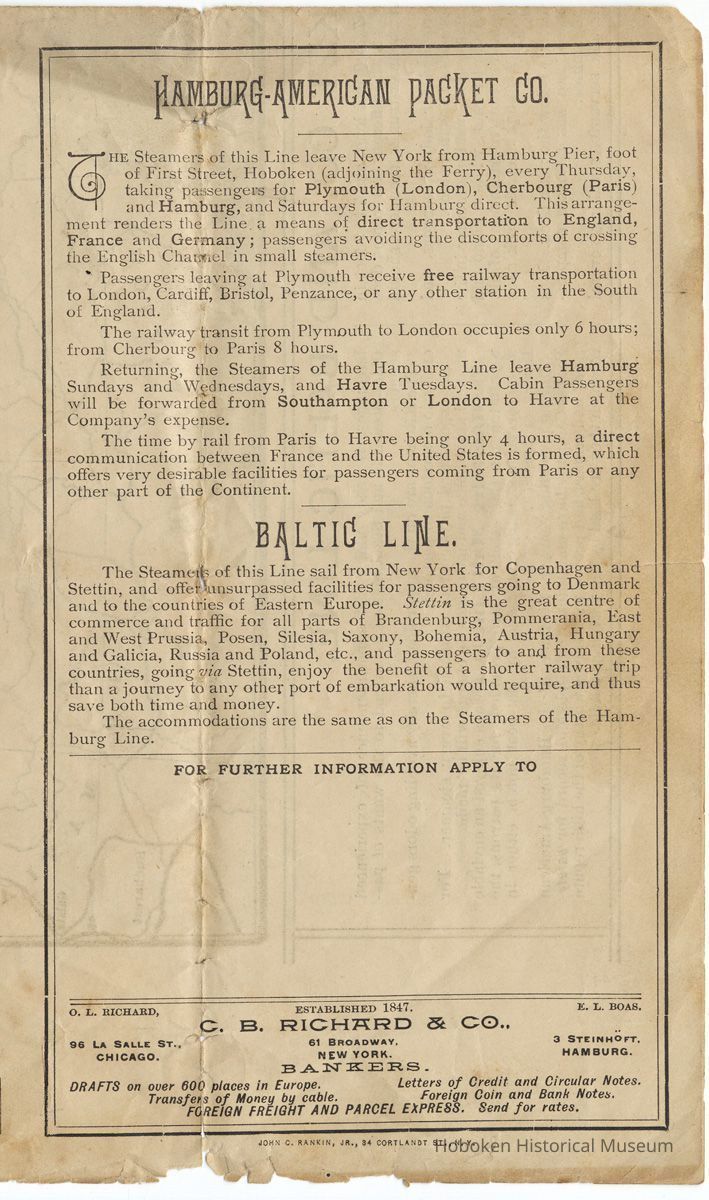 right third: description of the lines and services. Here it is noted that the "steamers of this Line leave New York from Hamburg Pier, foot of First Street, Hoboken..."