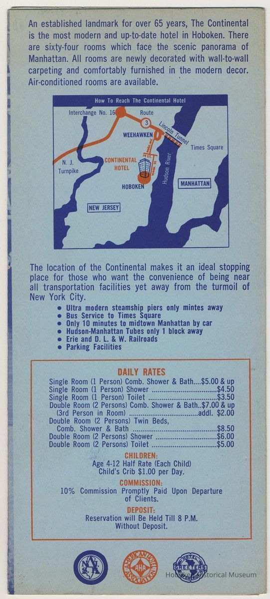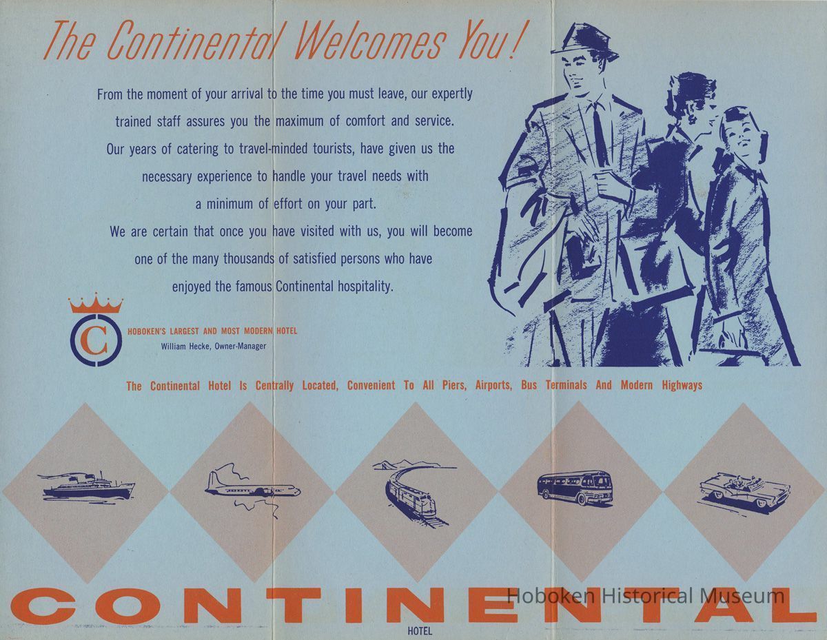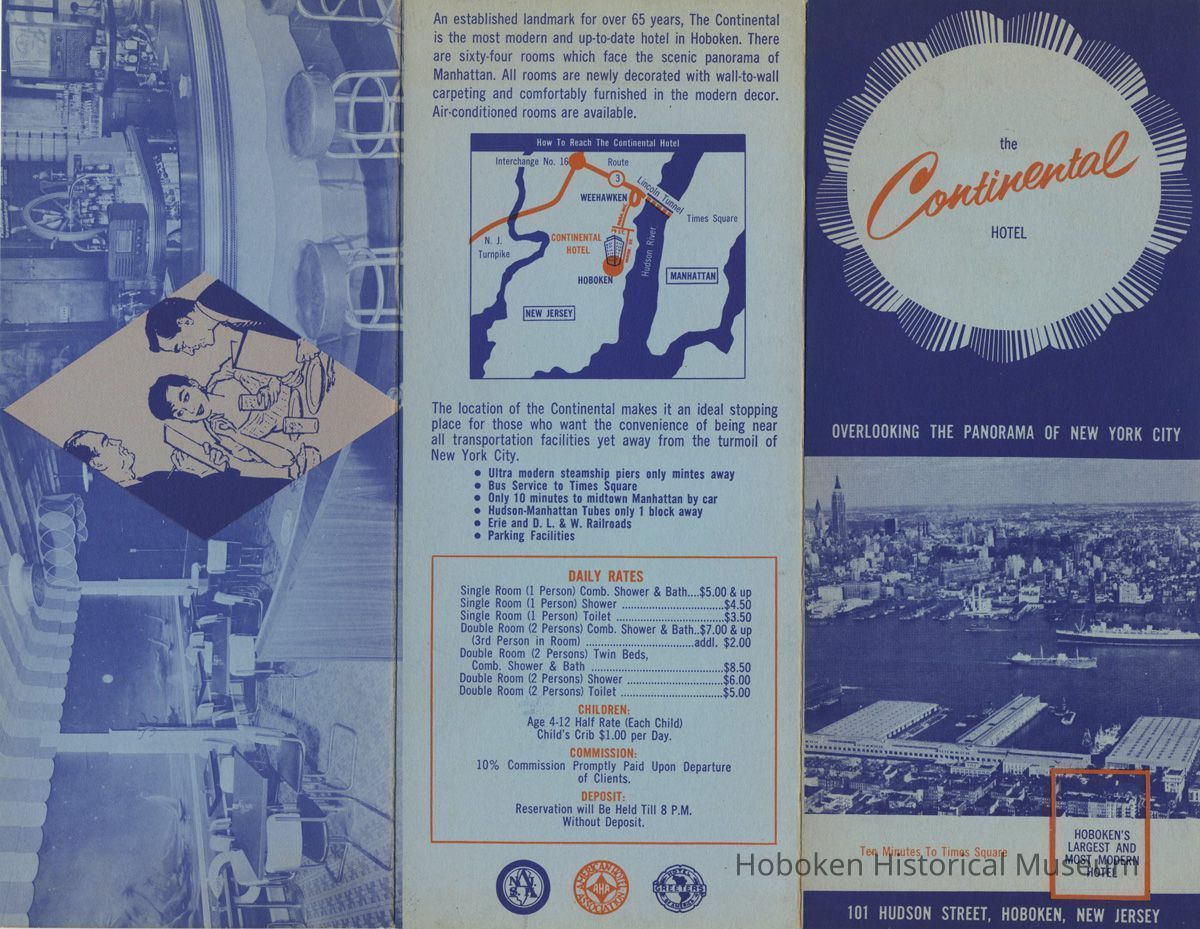Brochure for the Continental Hotel, 101 Hudson St., Hoboken, ca. 1956-61. Single sheet, 8-1/2" high x 11" wide folded to 3-3/4" wide. Blue paper printed in blue and orange.