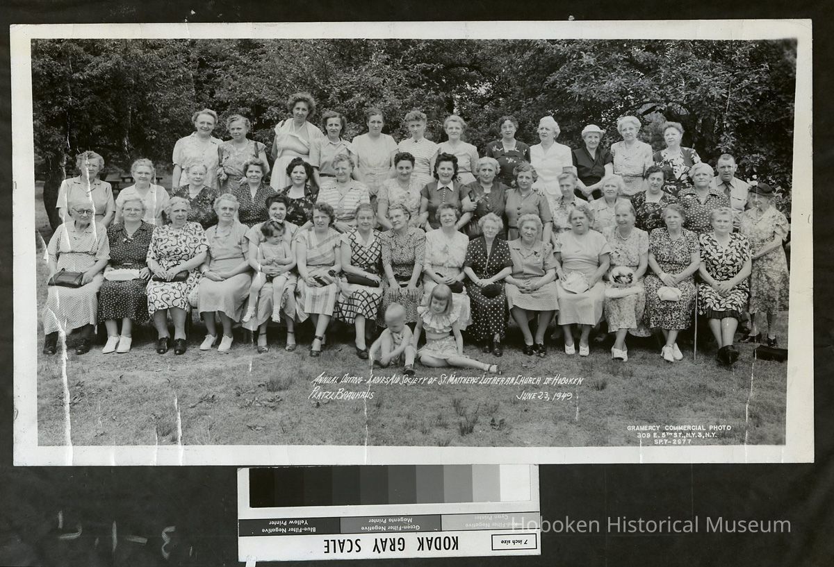 B+W copy photo negative of Annual Outing, Ladies Aid Society of St. Matthews Lutheran Church of Hoboken, Platzl Brauhaus, [Pomona, N.Y.], June 23, 1949.