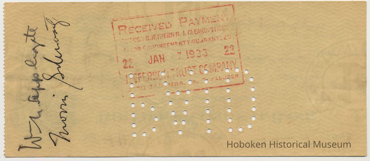 Bank check: First National Bank of Hoboken, N.J. Draft by W. N. Applegate, Jan 5, 1933, to himself (cash draft.) 2-3/4" high x 6-3/8" wide.