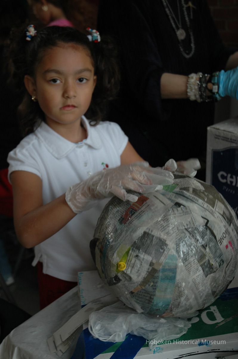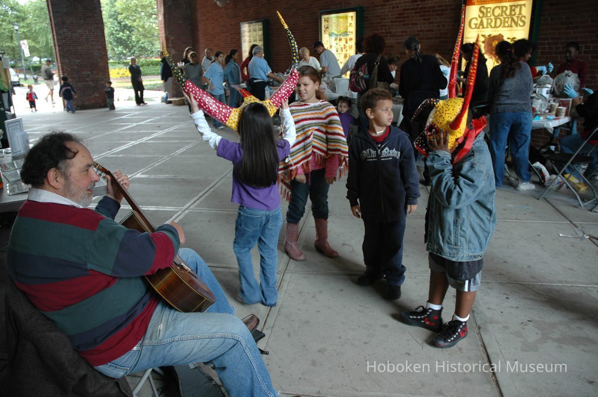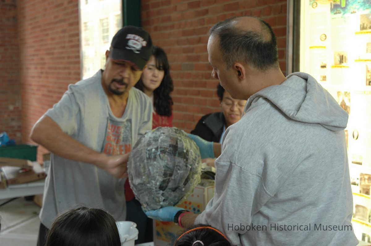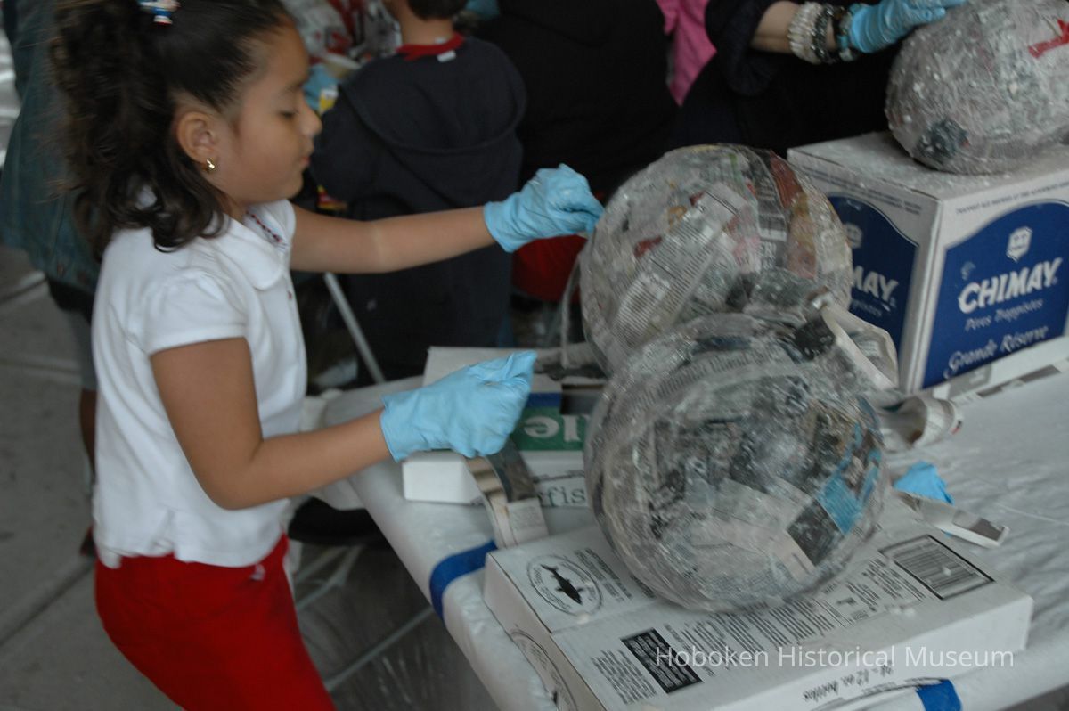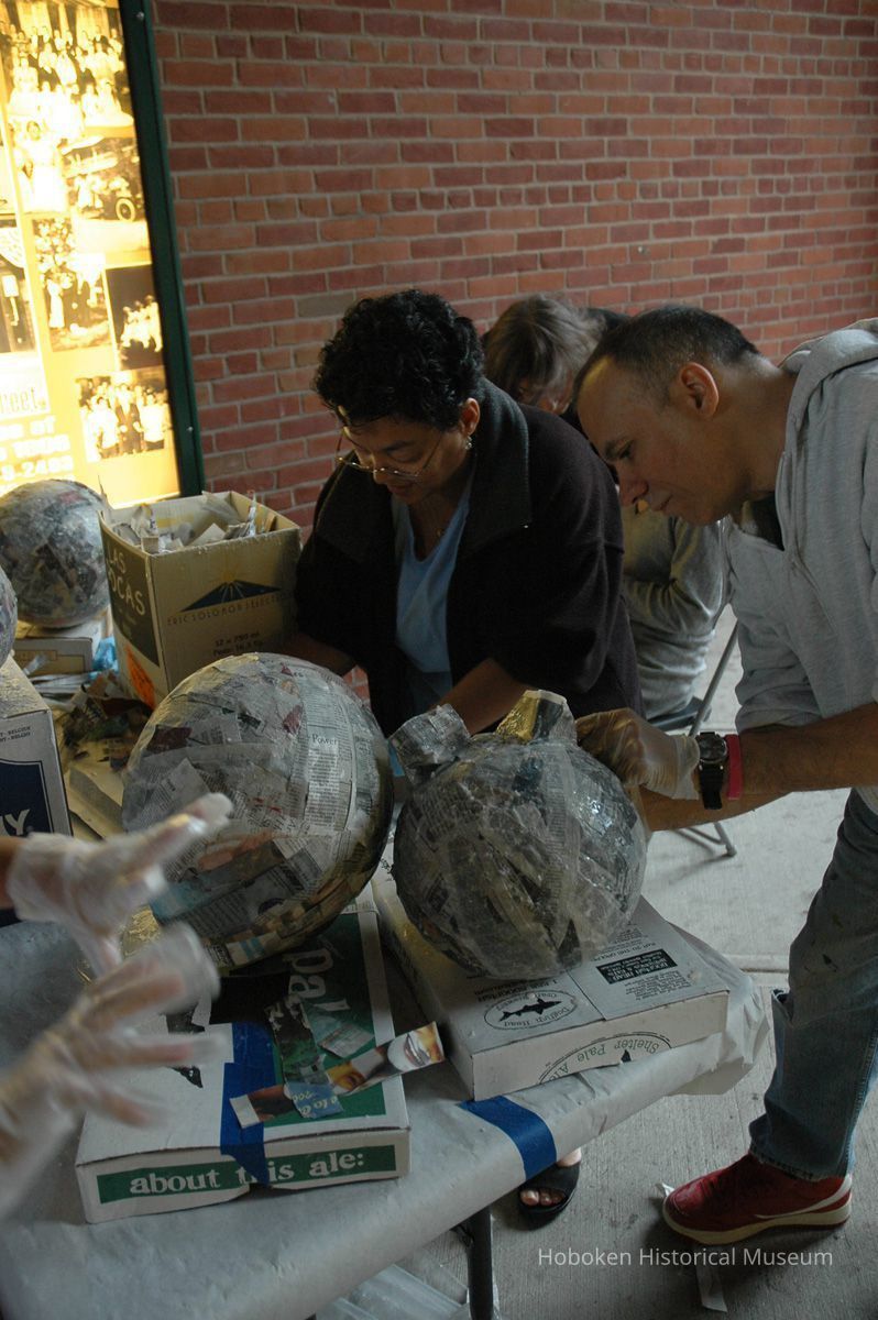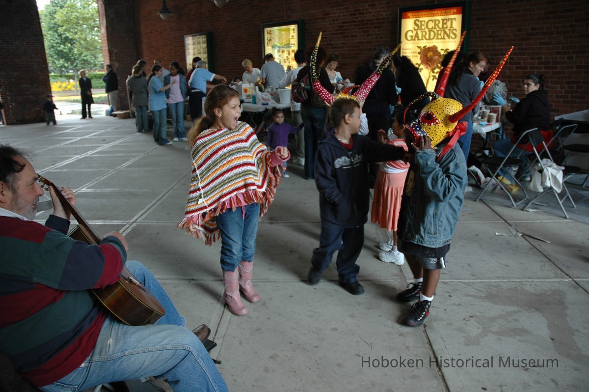 Notes: From The Vejigante and the Folk Festivals of Puerto Rico By Edwin Fontánez © 1996. Text below from exhibit of the masks in August-September 2006. ________________ The Vejigante (bay-he-GAHN-tay) is a fantastic, colorful character introduced into carnival celebrations hundreds of years ago. He is a classic example of the blending of African, Spanish, and Caribbean influences in Puerto Rican culture. During the carnival celebrations in Loiza Aldea and Ponce, the Vejigantes roam the streets in groups and chase children with their vejigas. The Vejigante is such an old character that he is even mentioned in the classic novel Don Quixote, written in 1605. Carnival in Ponce (pawn-say), a major city in the south, begins February 2 on "Dia de la Candelaria" (Day of the Bonfire). The masks are are characterized by their elaborate construction. Most are made of papier-mâché (shredded newspapers) and adorned with many horns and bells. The masks can be as big and elaborate as the artist's imagination. Commonly, they have a demonic or devilish appearance, but others resemble fantastic animals. __________________ The masks were made at the Hoboken Historical Museum during May and June of 2006. The mask-making classes were conducted by artist Ray Guzman with more than 25 children and parents participating. The mask starts with a balloon, then papier-mâché is applied over it along with horns and facial features before a final application of acrylic paint. Most who attended came to all four workshops and demonstrated a strong commitment to the project and created these incredible masks. The Museum wishes to thank artist Ray Guzman for teaching the classes, and a special thanks to both Tom Olivieri and Museum Trustee Inéz Garcia-Kiem for their advice and support. The project was funded by the Hudson County Office of Cultural Affairs, Tom DeGise, County Executive. Original or Copy: Digital copy Status: OK Status By: dw Status Date: 2006-11-28