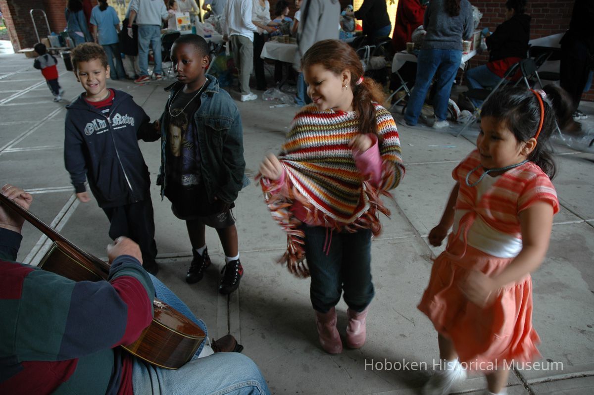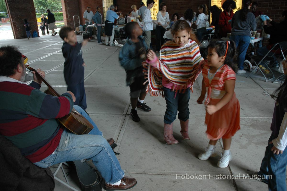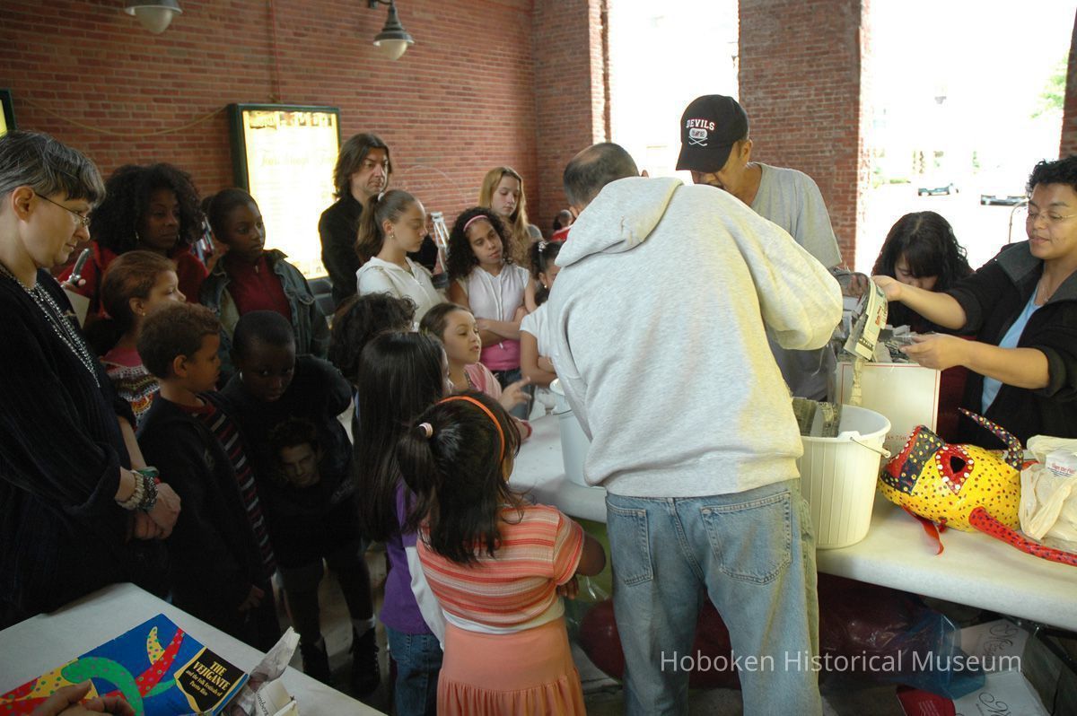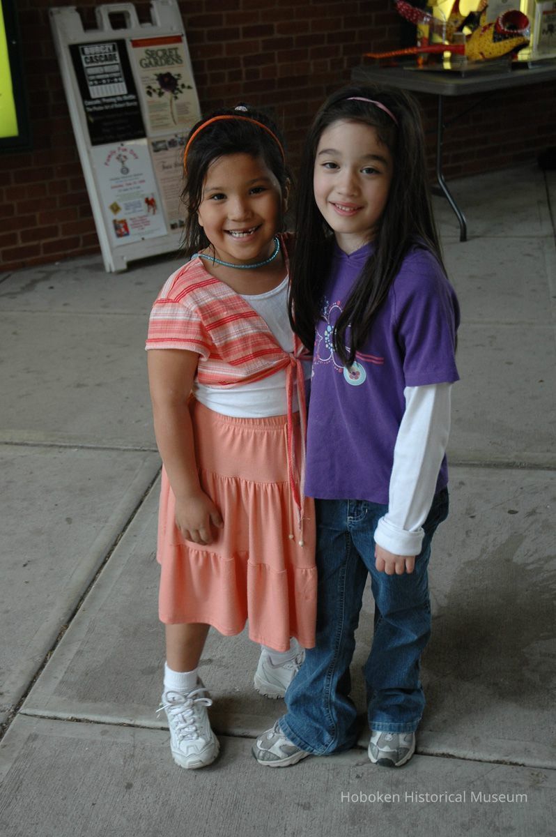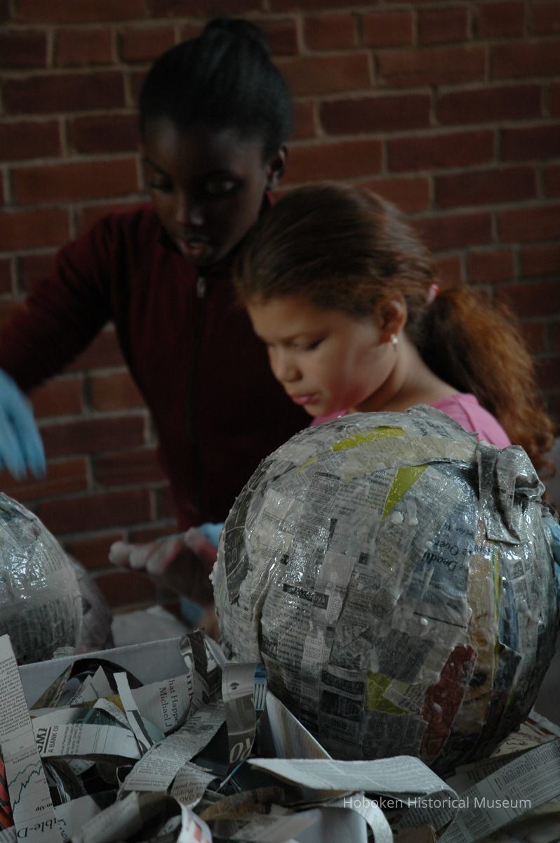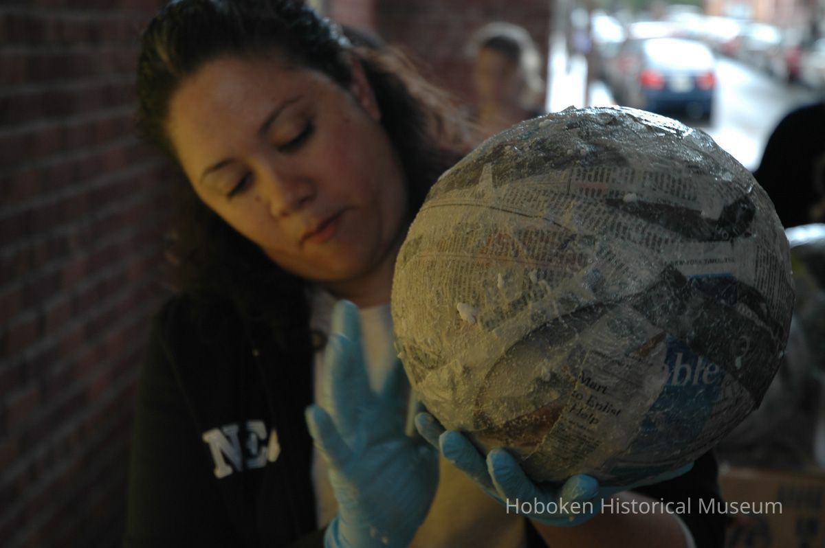 Notes: From The Vejigante and the Folk Festivals of Puerto Rico By Edwin Fontánez © 1996. Text below from exhibit of the masks in August-September 2006. ________________ The Vejigante (bay-he-GAHN-tay) is a fantastic, colorful character introduced into carnival celebrations hundreds of years ago. He is a classic example of the blending of African, Spanish, and Caribbean influences in Puerto Rican culture. During the carnival celebrations in Loiza Aldea and Ponce, the Vejigantes roam the streets in groups and chase children with their vejigas. The Vejigante is such an old character that he is even mentioned in the classic novel Don Quixote, written in 1605. Carnival in Ponce (pawn-say), a major city in the south, begins February 2 on "Dia de la Candelaria" (Day of the Bonfire). The masks are are characterized by their elaborate construction. Most are made of papier-mâché (shredded newspapers) and adorned with many horns and bells. The masks can be as big and elaborate as the artist's imagination. Commonly, they have a demonic or devilish appearance, but others resemble fantastic animals. __________________ The masks were made at the Hoboken Historical Museum during May and June of 2006. The mask-making classes were conducted by artist Ray Guzman with more than 25 children and parents participating. The mask starts with a balloon, then papier-mâché is applied over it along with horns and facial features before a final application of acrylic paint. Most who attended came to all four workshops and demonstrated a strong commitment to the project and created these incredible masks. The Museum wishes to thank artist Ray Guzman for teaching the classes, and a special thanks to both Tom Olivieri and Museum Trustee Inéz Garcia-Kiem for their advice and support. The project was funded by the Hudson County Office of Cultural Affairs, Tom DeGise, County Executive. Original or Copy: Digital copy Status: OK Status By: dw Status Date: 2006-11-28