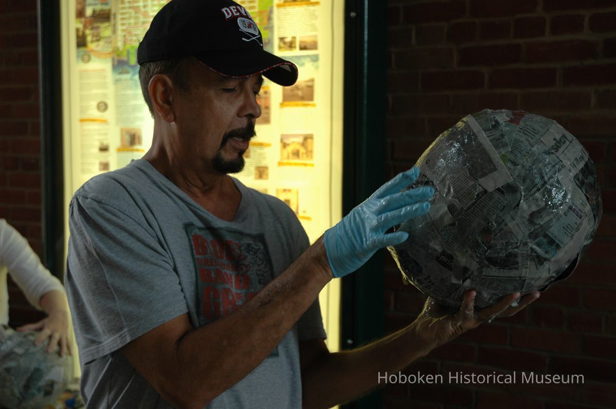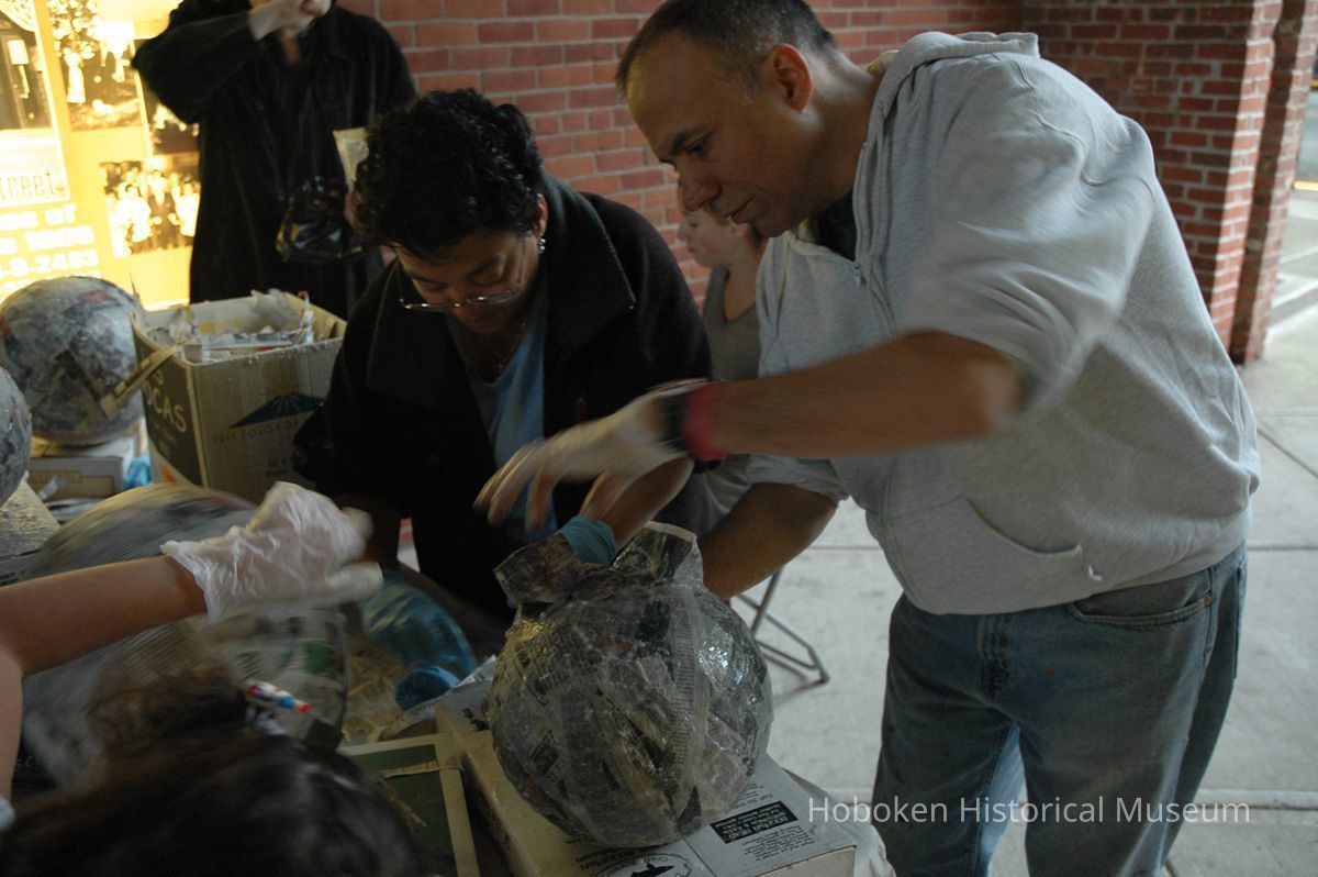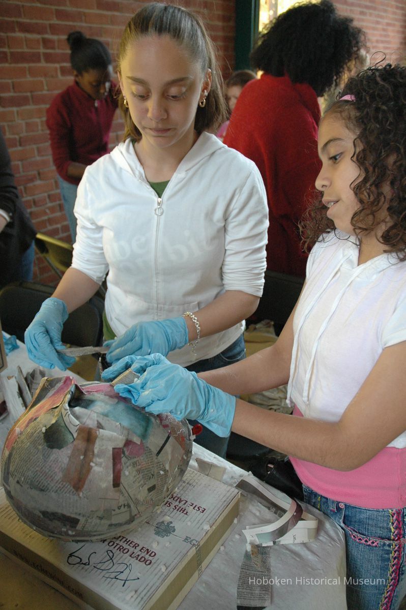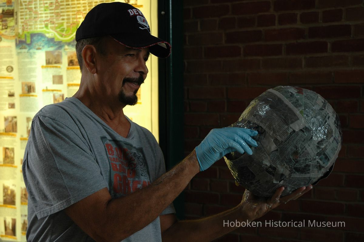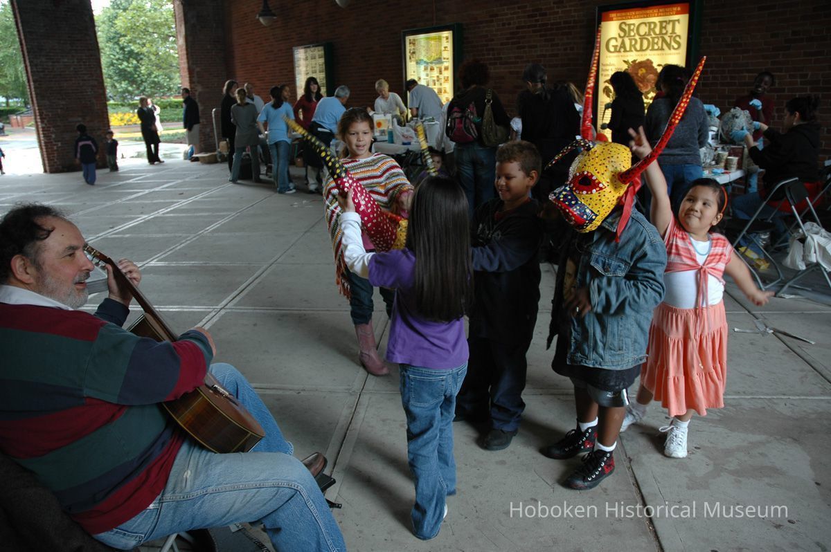 Notes: From The Vejigante and the Folk Festivals of Puerto Rico By Edwin Fontánez © 1996. Text below from exhibit of the masks in August-September 2006. ________________ The Vejigante (bay-he-GAHN-tay) is a fantastic, colorful character introduced into carnival celebrations hundreds of years ago. He is a classic example of the blending of African, Spanish, and Caribbean influences in Puerto Rican culture. During the carnival celebrations in Loiza Aldea and Ponce, the Vejigantes roam the streets in groups and chase children with their vejigas. The Vejigante is such an old character that he is even mentioned in the classic novel Don Quixote, written in 1605. Carnival in Ponce (pawn-say), a major city in the south, begins February 2 on "Dia de la Candelaria" (Day of the Bonfire). The masks are are characterized by their elaborate construction. Most are made of papier-mâché (shredded newspapers) and adorned with many horns and bells. The masks can be as big and elaborate as the artist's imagination. Commonly, they have a demonic or devilish appearance, but others resemble fantastic animals. __________________ The masks were made at the Hoboken Historical Museum during May and June of 2006. The mask-making classes were conducted by artist Ray Guzman with more than 25 children and parents participating. The mask starts with a balloon, then papier-mâché is applied over it along with horns and facial features before a final application of acrylic paint. Most who attended came to all four workshops and demonstrated a strong commitment to the project and created these incredible masks. The Museum wishes to thank artist Ray Guzman for teaching the classes, and a special thanks to both Tom Olivieri and Museum Trustee Inéz Garcia-Kiem for their advice and support. The project was funded by the Hudson County Office of Cultural Affairs, Tom DeGise, County Executive. Original or Copy: Digital copy Status: OK Status By: dw Status Date: 2006-11-28