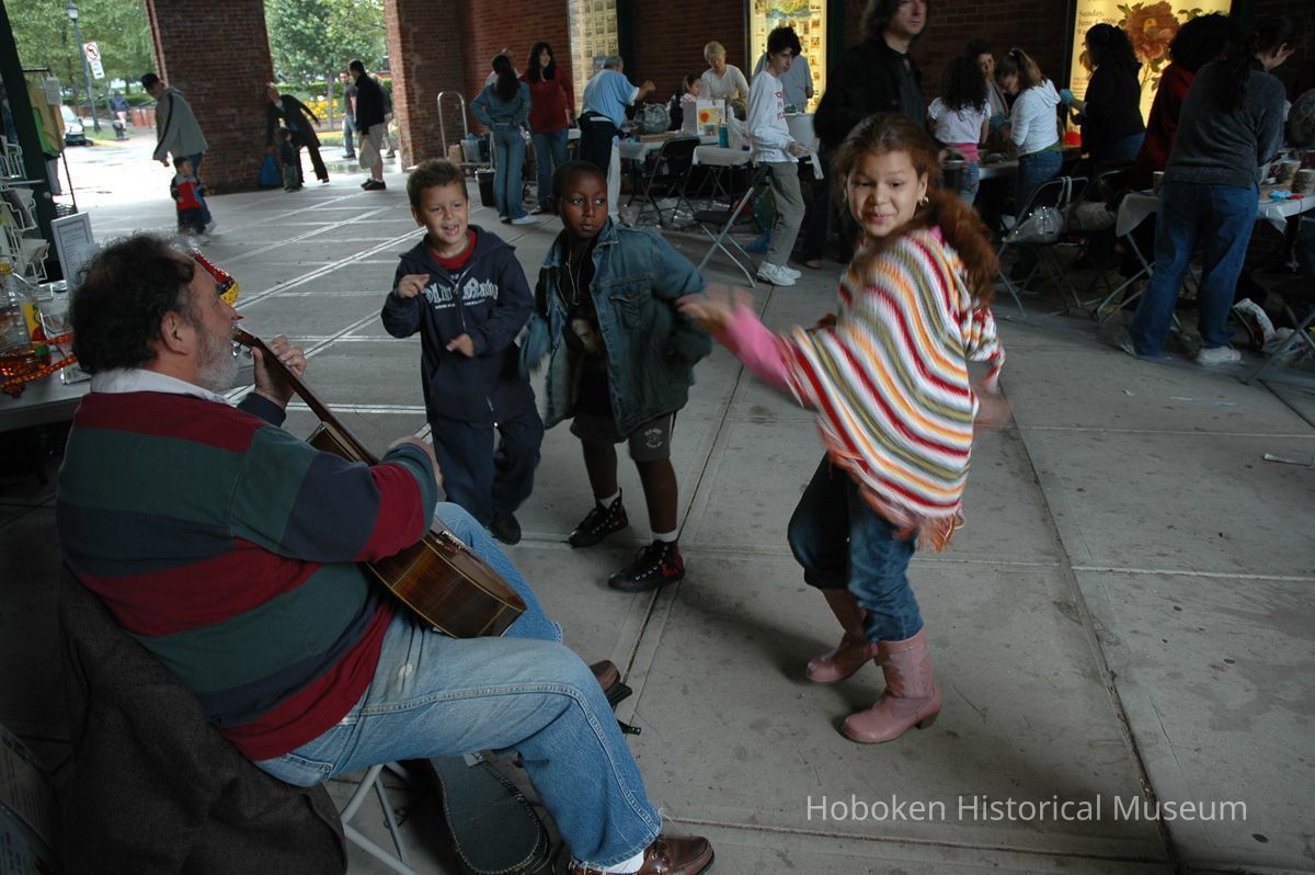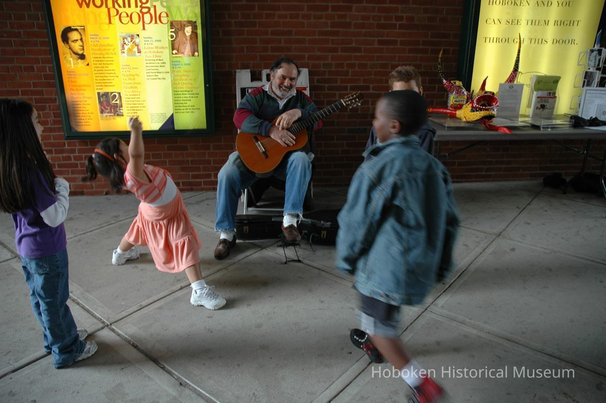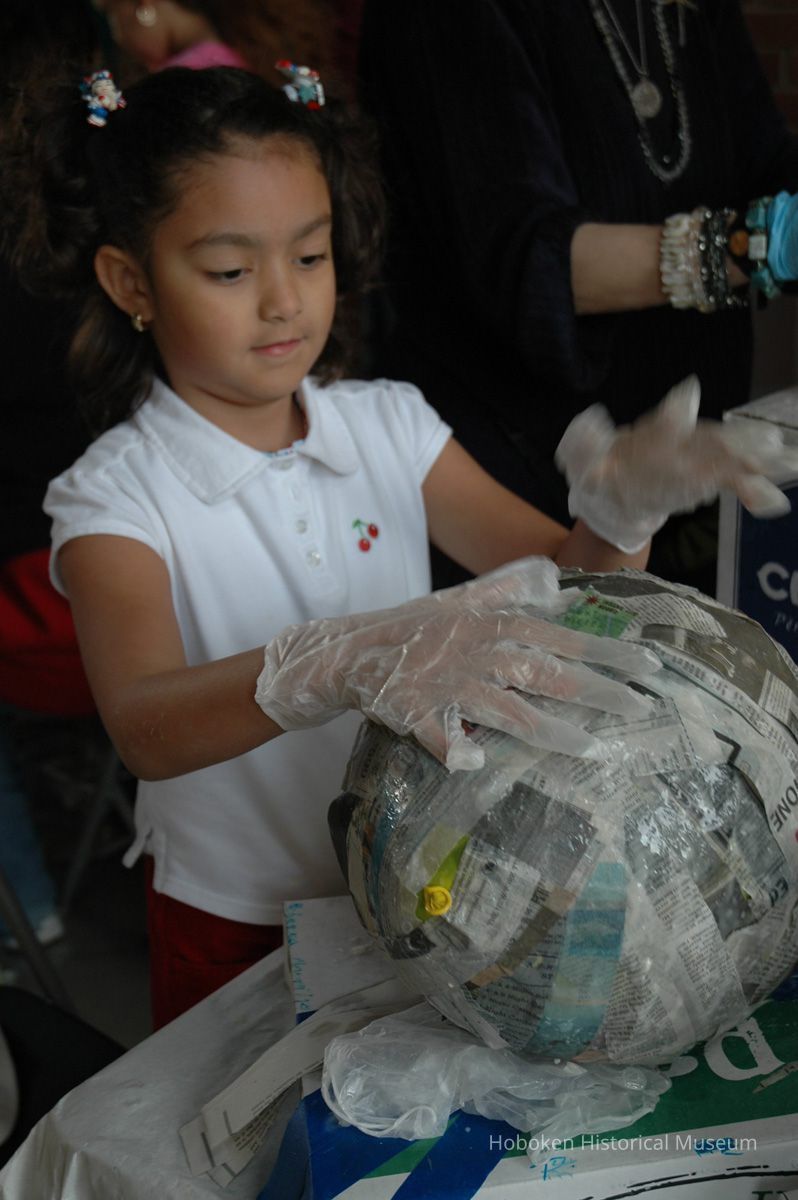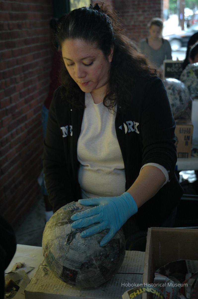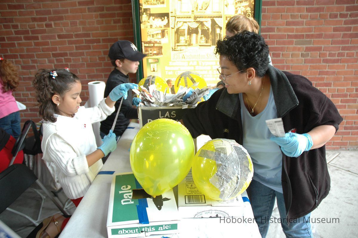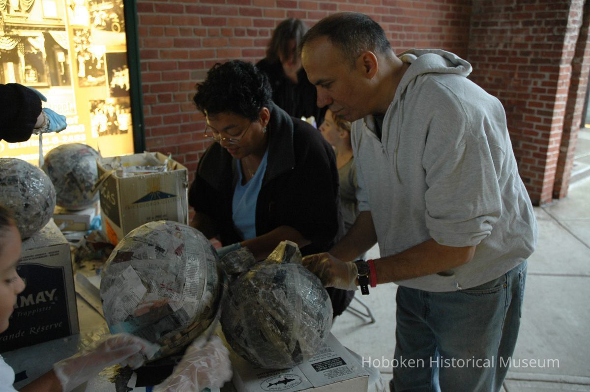 Notes: From The Vejigante and the Folk Festivals of Puerto Rico By Edwin Fontánez © 1996. Text below from exhibit of the masks in August-September 2006. ________________ The Vejigante (bay-he-GAHN-tay) is a fantastic, colorful character introduced into carnival celebrations hundreds of years ago. He is a classic example of the blending of African, Spanish, and Caribbean influences in Puerto Rican culture. During the carnival celebrations in Loiza Aldea and Ponce, the Vejigantes roam the streets in groups and chase children with their vejigas. The Vejigante is such an old character that he is even mentioned in the classic novel Don Quixote, written in 1605. Carnival in Ponce (pawn-say), a major city in the south, begins February 2 on "Dia de la Candelaria" (Day of the Bonfire). The masks are are characterized by their elaborate construction. Most are made of papier-mâché (shredded newspapers) and adorned with many horns and bells. The masks can be as big and elaborate as the artist's imagination. Commonly, they have a demonic or devilish appearance, but others resemble fantastic animals. __________________ The masks were made at the Hoboken Historical Museum during May and June of 2006. The mask-making classes were conducted by artist Ray Guzman with more than 25 children and parents participating. The mask starts with a balloon, then papier-mâché is applied over it along with horns and facial features before a final application of acrylic paint. Most who attended came to all four workshops and demonstrated a strong commitment to the project and created these incredible masks. The Museum wishes to thank artist Ray Guzman for teaching the classes, and a special thanks to both Tom Olivieri and Museum Trustee Inéz Garcia-Kiem for their advice and support. The project was funded by the Hudson County Office of Cultural Affairs, Tom DeGise, County Executive. Original or Copy: Digital copy Status: OK Status By: dw Status Date: 2006-11-28