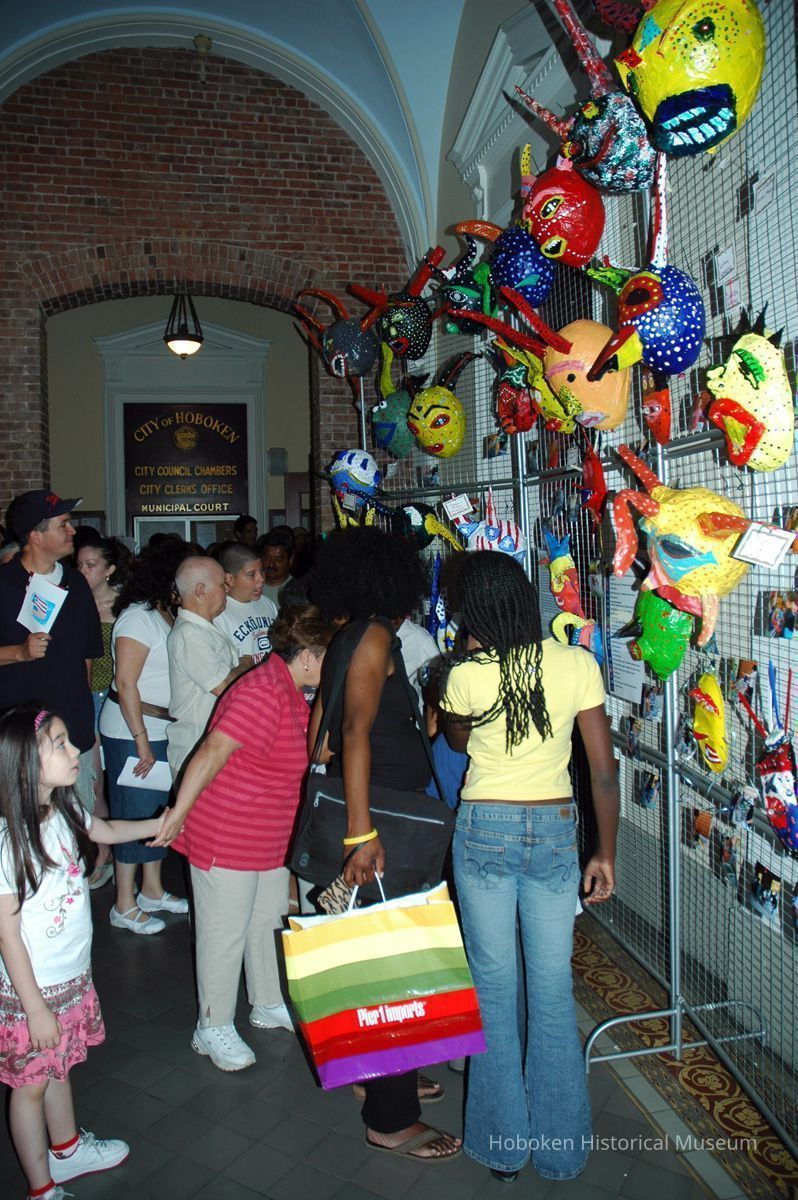 Notes: From The Vejigante and the Folk Festivals of Puerto Rico By Edwin Fontánez © 1996. Text below from exhibit of the masks in August-September 2006. ________________ The Vejigante (bay-he-GAHN-tay) is a fantastic, colorful character introduced into carnival celebrations hundreds of years ago. He is a classic example of the blending of African, Spanish, and Caribbean influences in Puerto Rican culture. During the carnival celebrations in Loiza Aldea and Ponce, the Vejigantes roam the streets in groups and chase children with their vejigas. The Vejigante is such an old character that he is even mentioned in the classic novel Don Quixote, written in 1605. Carnival in Ponce (pawn-say), a major city in the south, begins February 2 on "Dia de la Candelaria" (Day of the Bonfire). The masks are are characterized by their elaborate construction. Most are made of papier-mâché (shredded newspapers) and adorned with many horns and bells. The masks can be as big and elaborate as the artist's imagination. Commonly, they have a demonic or devilish appearance, but others resemble fantastic animals. __________________ The masks were made at the Hoboken Historical Museum during May and June of 2006. The mask-making classes were conducted by artist Ray Guzman with more than 25 children and parents participating. The mask starts with a balloon, then papier-mâché is applied over it along with horns and facial features before a final application of acrylic paint. Most who attended came to all four workshops and demonstrated a strong commitment to the project and created these incredible masks. The Museum wishes to thank artist Ray Guzman for teaching the classes, and a special thanks to both Tom Olivieri and Museum Trustee Inéz Garcia-Kiem for their advice and support. The project was funded by the Hudson County Office of Cultural Affairs, Tom DeGise, County Executive. Original or Copy: Digital copy Status: OK Status By: dw Status Date: 2006-11-28