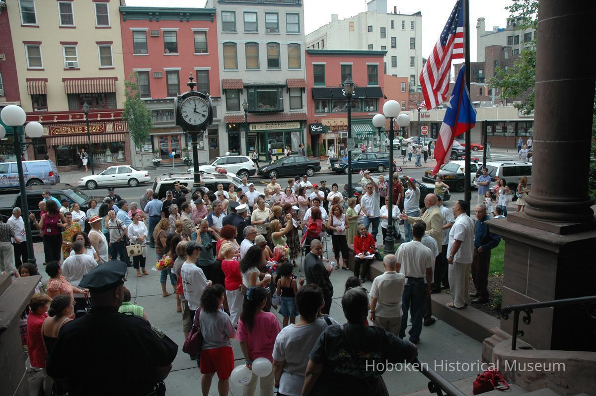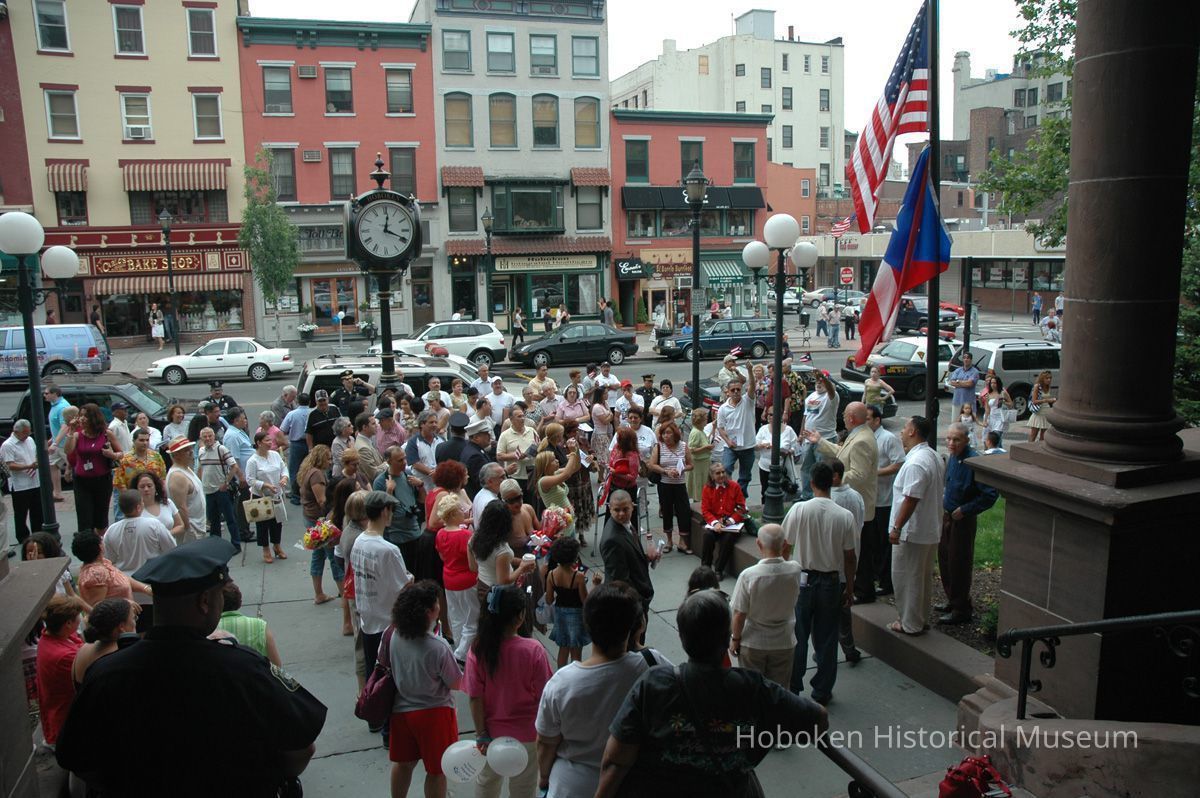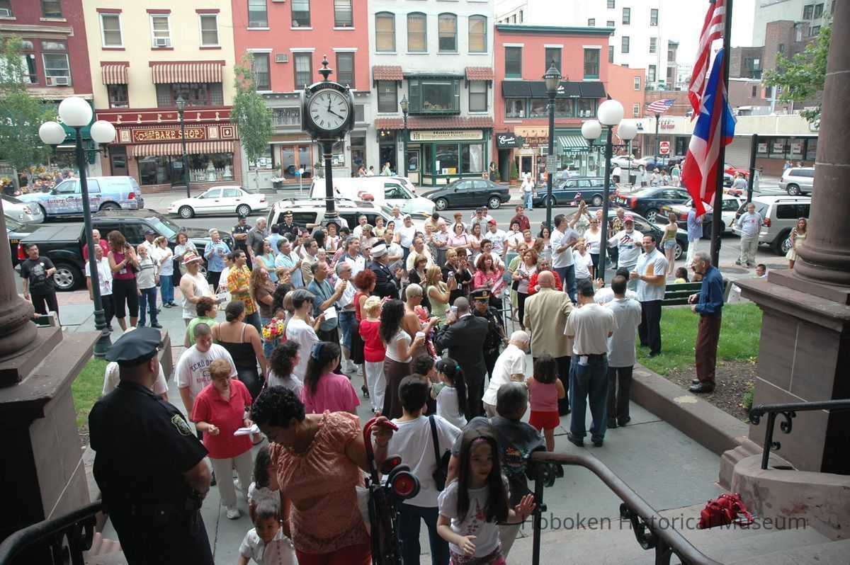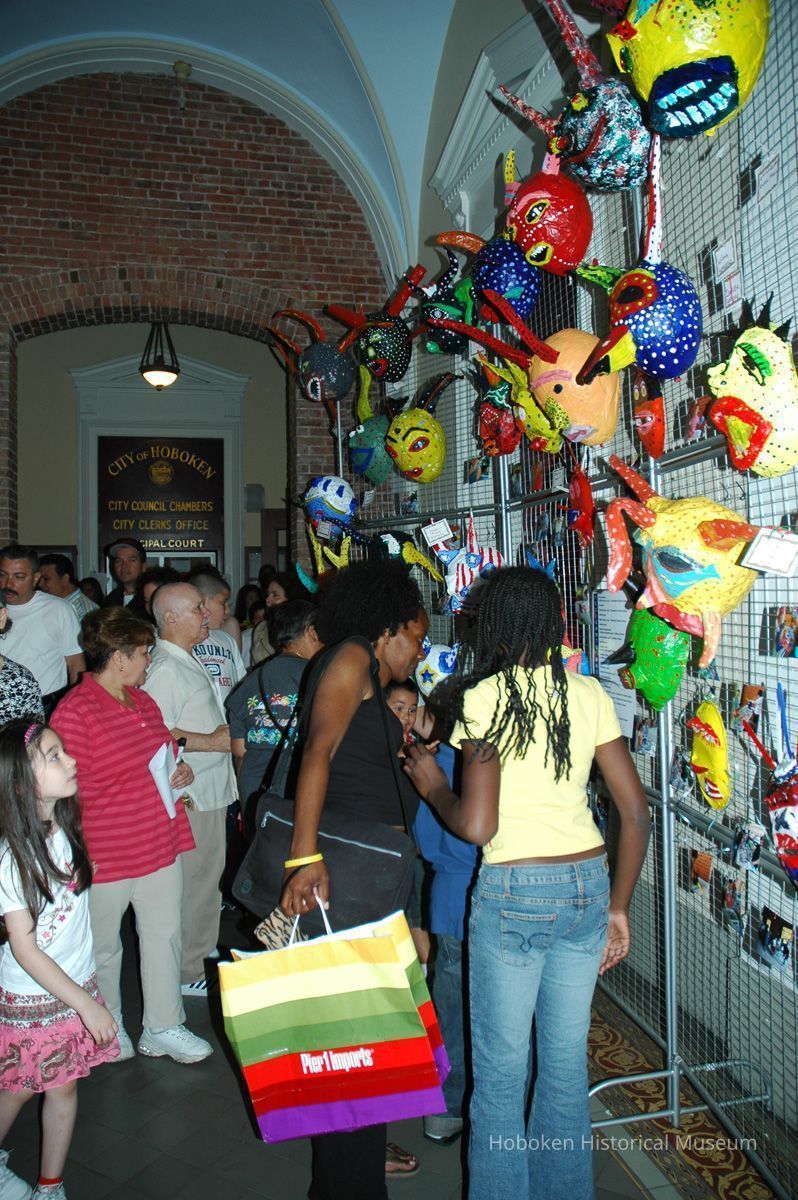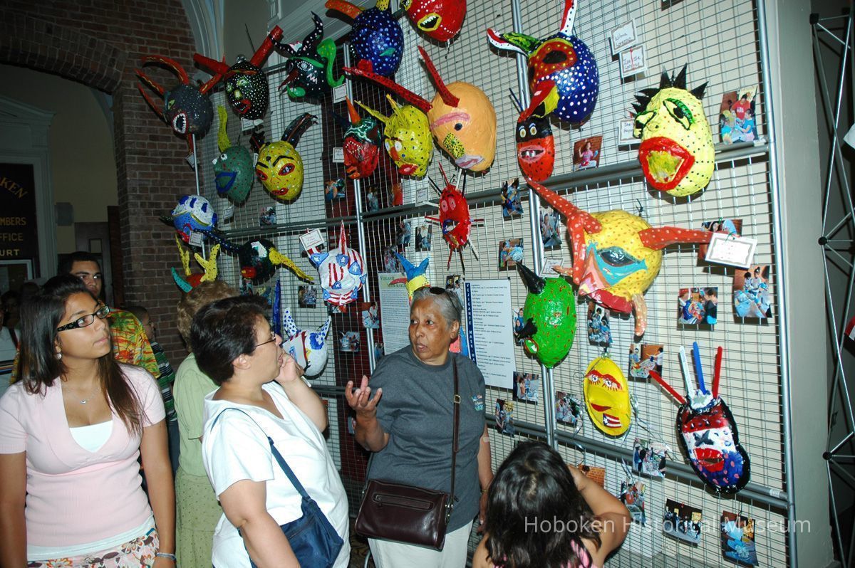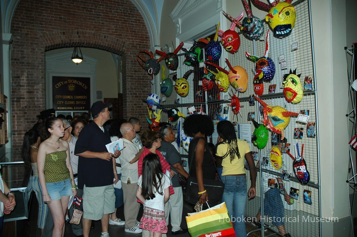 Notes: From The Vejigante and the Folk Festivals of Puerto Rico By Edwin Fontánez © 1996. Text below from exhibit of the masks in August-September 2006. ________________ The Vejigante (bay-he-GAHN-tay) is a fantastic, colorful character introduced into carnival celebrations hundreds of years ago. He is a classic example of the blending of African, Spanish, and Caribbean influences in Puerto Rican culture. During the carnival celebrations in Loiza Aldea and Ponce, the Vejigantes roam the streets in groups and chase children with their vejigas. The Vejigante is such an old character that he is even mentioned in the classic novel Don Quixote, written in 1605. Carnival in Ponce (pawn-say), a major city in the south, begins February 2 on "Dia de la Candelaria" (Day of the Bonfire). The masks are are characterized by their elaborate construction. Most are made of papier-mâché (shredded newspapers) and adorned with many horns and bells. The masks can be as big and elaborate as the artist's imagination. Commonly, they have a demonic or devilish appearance, but others resemble fantastic animals. __________________ The masks were made at the Hoboken Historical Museum during May and June of 2006. The mask-making classes were conducted by artist Ray Guzman with more than 25 children and parents participating. The mask starts with a balloon, then papier-mâché is applied over it along with horns and facial features before a final application of acrylic paint. Most who attended came to all four workshops and demonstrated a strong commitment to the project and created these incredible masks. The Museum wishes to thank artist Ray Guzman for teaching the classes, and a special thanks to both Tom Olivieri and Museum Trustee Inéz Garcia-Kiem for their advice and support. The project was funded by the Hudson County Office of Cultural Affairs, Tom DeGise, County Executive. Original or Copy: Digital copy Status: OK Status By: dw Status Date: 2006-11-28