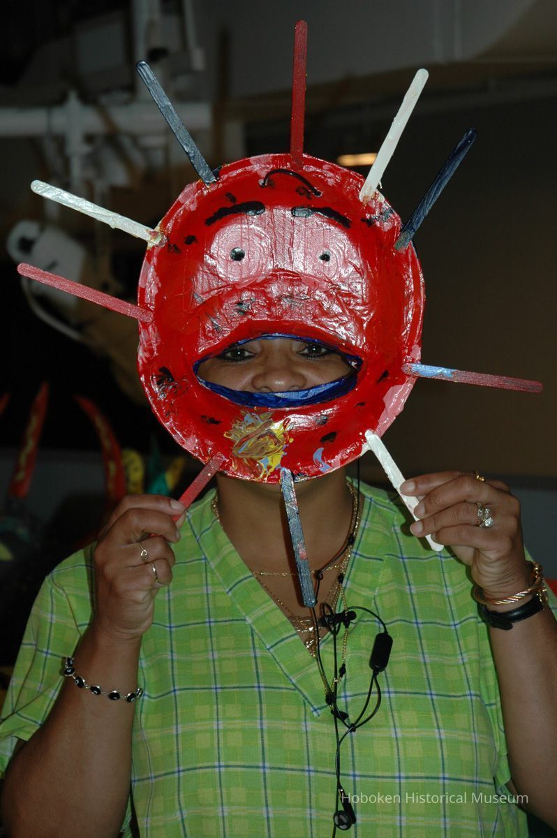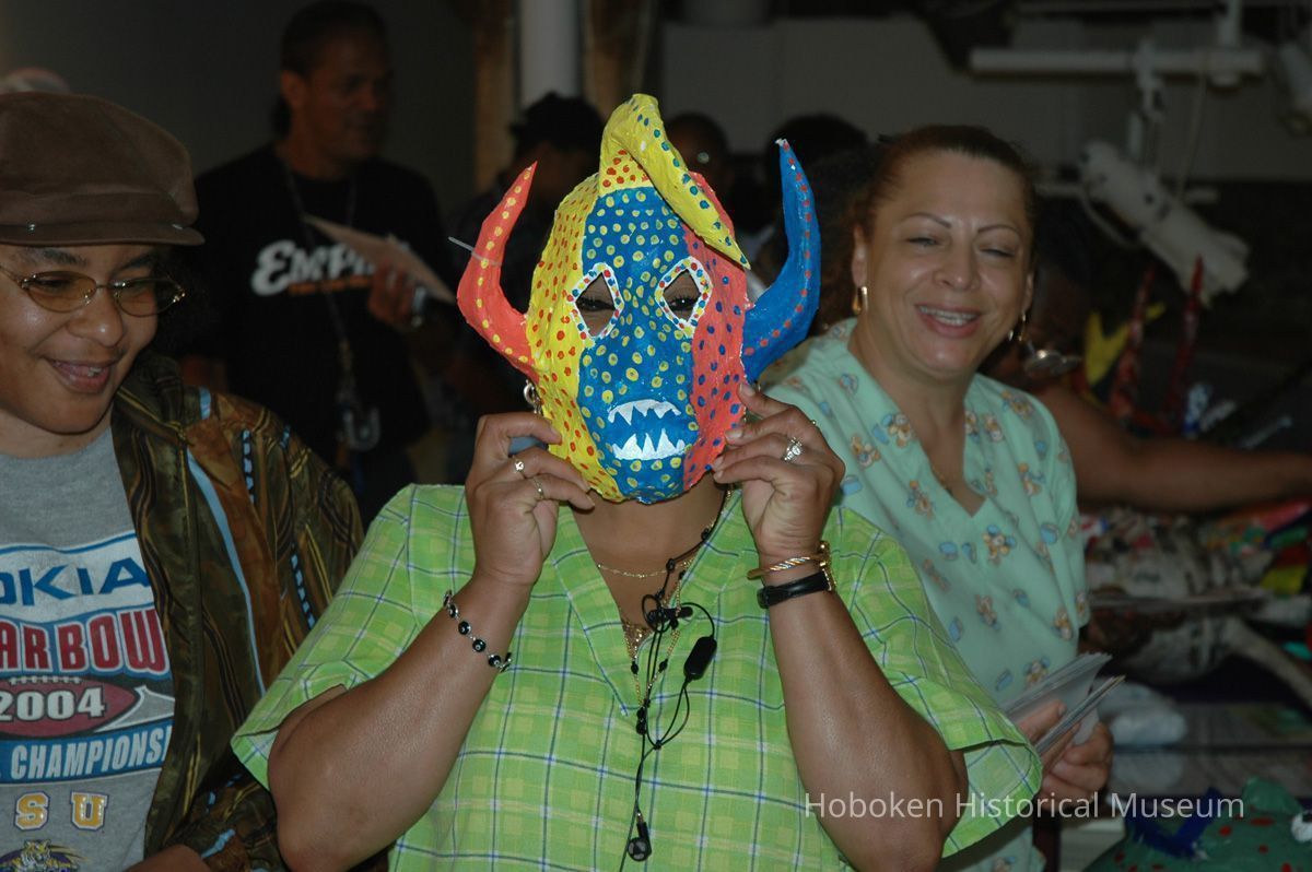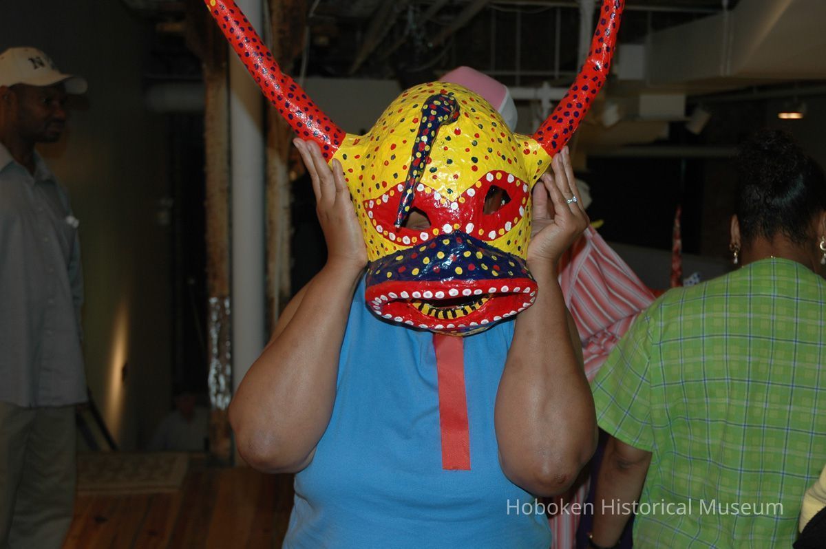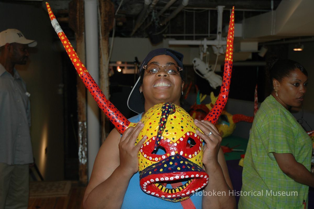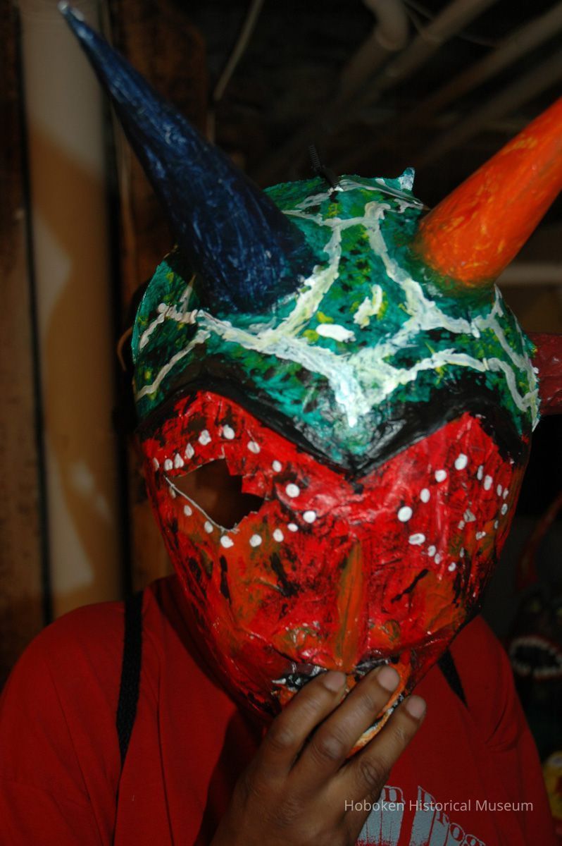 Notes: From The Vejigante and the Folk Festivals of Puerto Rico By Edwin Fontánez © 1996. Text below from exhibit of the masks in August-September 2006. ________________ The Vejigante (bay-he-GAHN-tay) is a fantastic, colorful character introduced into carnival celebrations hundreds of years ago. He is a classic example of the blending of African, Spanish, and Caribbean influences in Puerto Rican culture. During the carnival celebrations in Loiza Aldea and Ponce, the Vejigantes roam the streets in groups and chase children with their vejigas. The Vejigante is such an old character that he is even mentioned in the classic novel Don Quixote, written in 1605. Carnival in Ponce (pawn-say), a major city in the south, begins February 2 on "Dia de la Candelaria" (Day of the Bonfire). The masks are are characterized by their elaborate construction. Most are made of papier-mâché (shredded newspapers) and adorned with many horns and bells. The masks can be as big and elaborate as the artist's imagination. Commonly, they have a demonic or devilish appearance, but others resemble fantastic animals. __________________ The masks were made at the Hoboken Historical Museum during May and June of 2006. The mask-making classes were conducted by artist Ray Guzman with more than 25 children and parents participating. The mask starts with a balloon, then papier-mâché is applied over it along with horns and facial features before a final application of acrylic paint. Most who attended came to all four workshops and demonstrated a strong commitment to the project and created these incredible masks. The Museum wishes to thank artist Ray Guzman for teaching the classes, and a special thanks to both Tom Olivieri and Museum Trustee Inéz Garcia-Kiem for their advice and support. The project was funded by the Hudson County Office of Cultural Affairs, Tom DeGise, County Executive. Original or Copy: Digital copy Status: OK Status By: dw Status Date: 2006-11-28