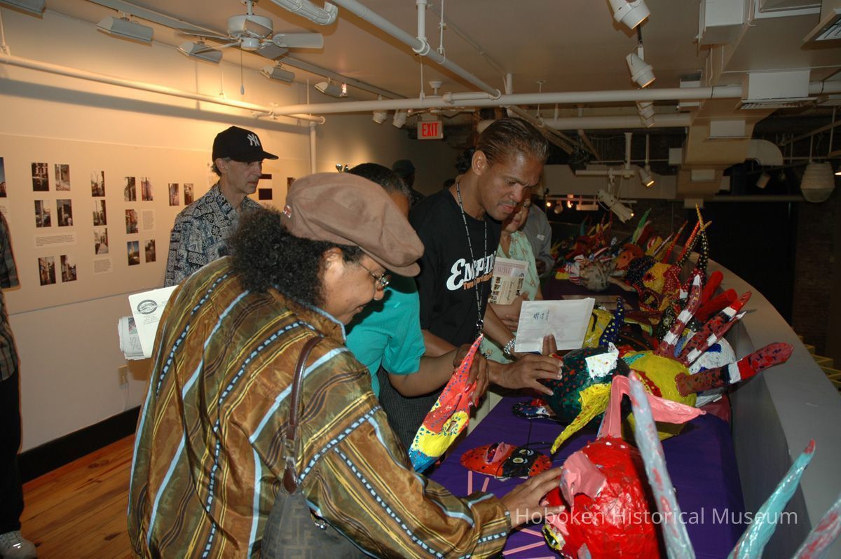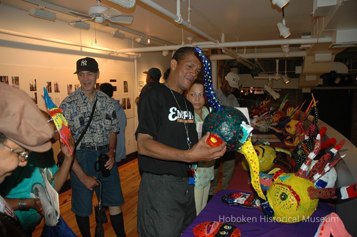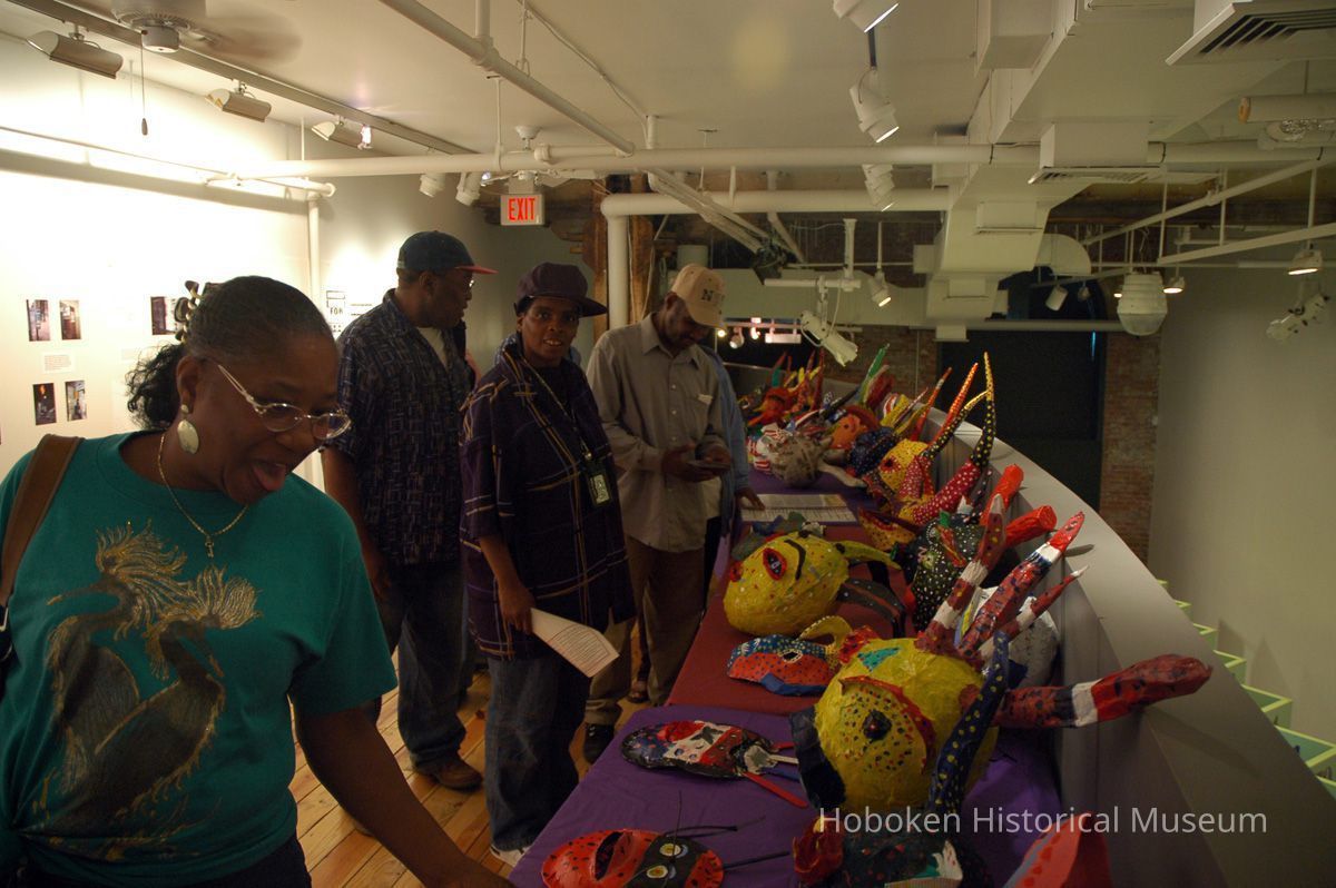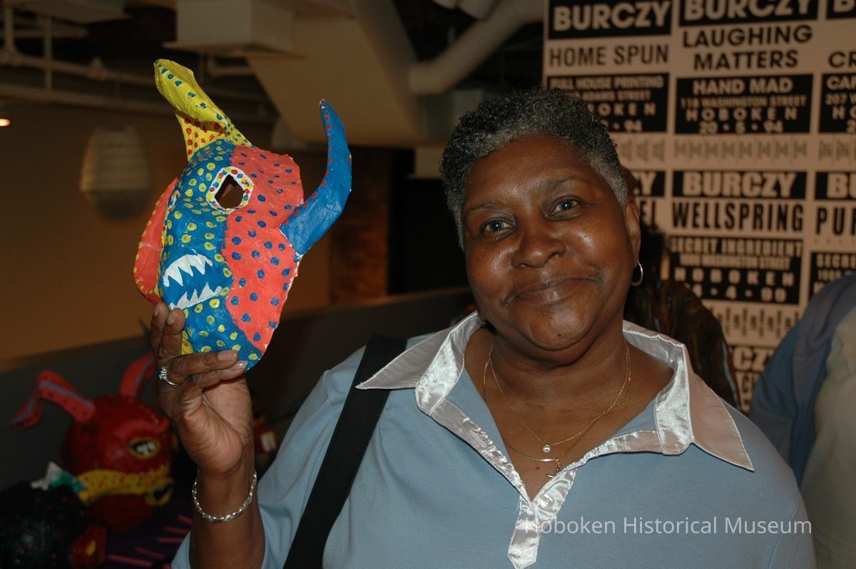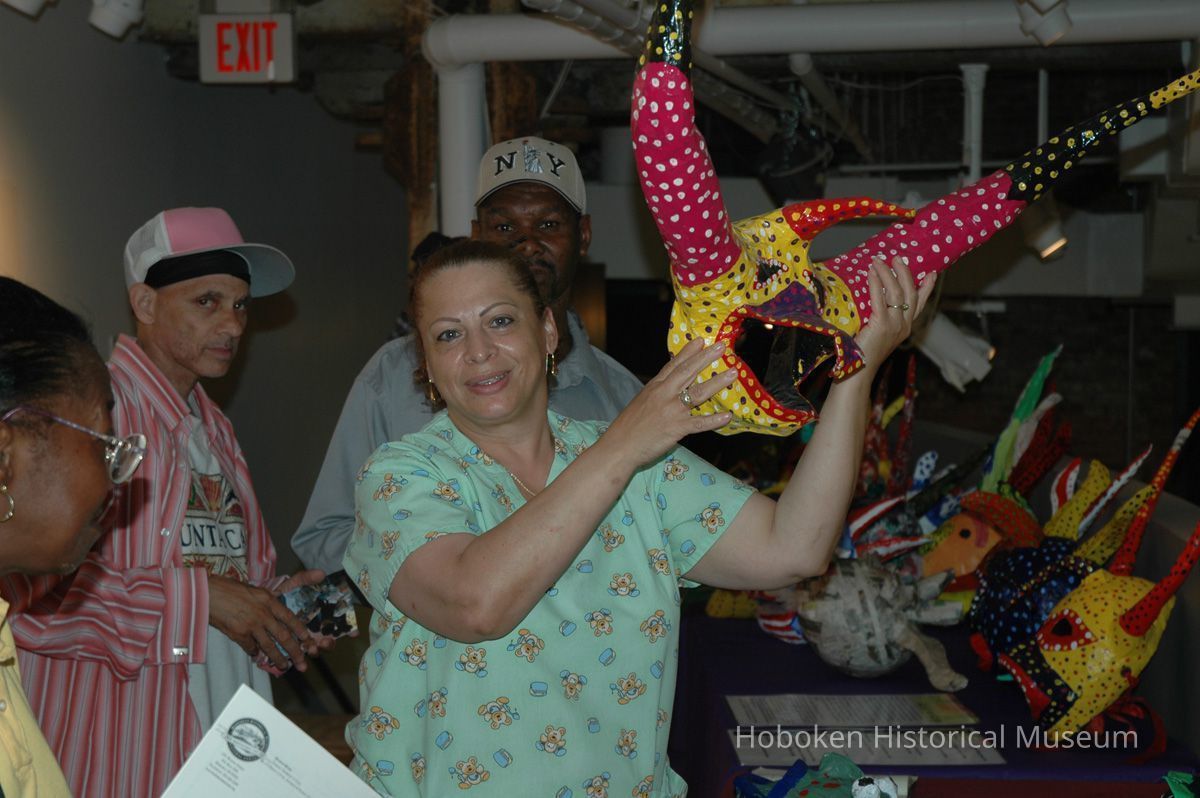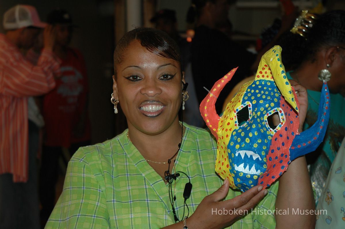 Notes: From The Vejigante and the Folk Festivals of Puerto Rico By Edwin Fontánez © 1996. Text below from exhibit of the masks in August-September 2006. ________________ The Vejigante (bay-he-GAHN-tay) is a fantastic, colorful character introduced into carnival celebrations hundreds of years ago. He is a classic example of the blending of African, Spanish, and Caribbean influences in Puerto Rican culture. During the carnival celebrations in Loiza Aldea and Ponce, the Vejigantes roam the streets in groups and chase children with their vejigas. The Vejigante is such an old character that he is even mentioned in the classic novel Don Quixote, written in 1605. Carnival in Ponce (pawn-say), a major city in the south, begins February 2 on "Dia de la Candelaria" (Day of the Bonfire). The masks are are characterized by their elaborate construction. Most are made of papier-mâché (shredded newspapers) and adorned with many horns and bells. The masks can be as big and elaborate as the artist's imagination. Commonly, they have a demonic or devilish appearance, but others resemble fantastic animals. __________________ The masks were made at the Hoboken Historical Museum during May and June of 2006. The mask-making classes were conducted by artist Ray Guzman with more than 25 children and parents participating. The mask starts with a balloon, then papier-mâché is applied over it along with horns and facial features before a final application of acrylic paint. Most who attended came to all four workshops and demonstrated a strong commitment to the project and created these incredible masks. The Museum wishes to thank artist Ray Guzman for teaching the classes, and a special thanks to both Tom Olivieri and Museum Trustee Inéz Garcia-Kiem for their advice and support. The project was funded by the Hudson County Office of Cultural Affairs, Tom DeGise, County Executive. Original or Copy: Digital copy Status: OK Status By: dw Status Date: 2006-11-28