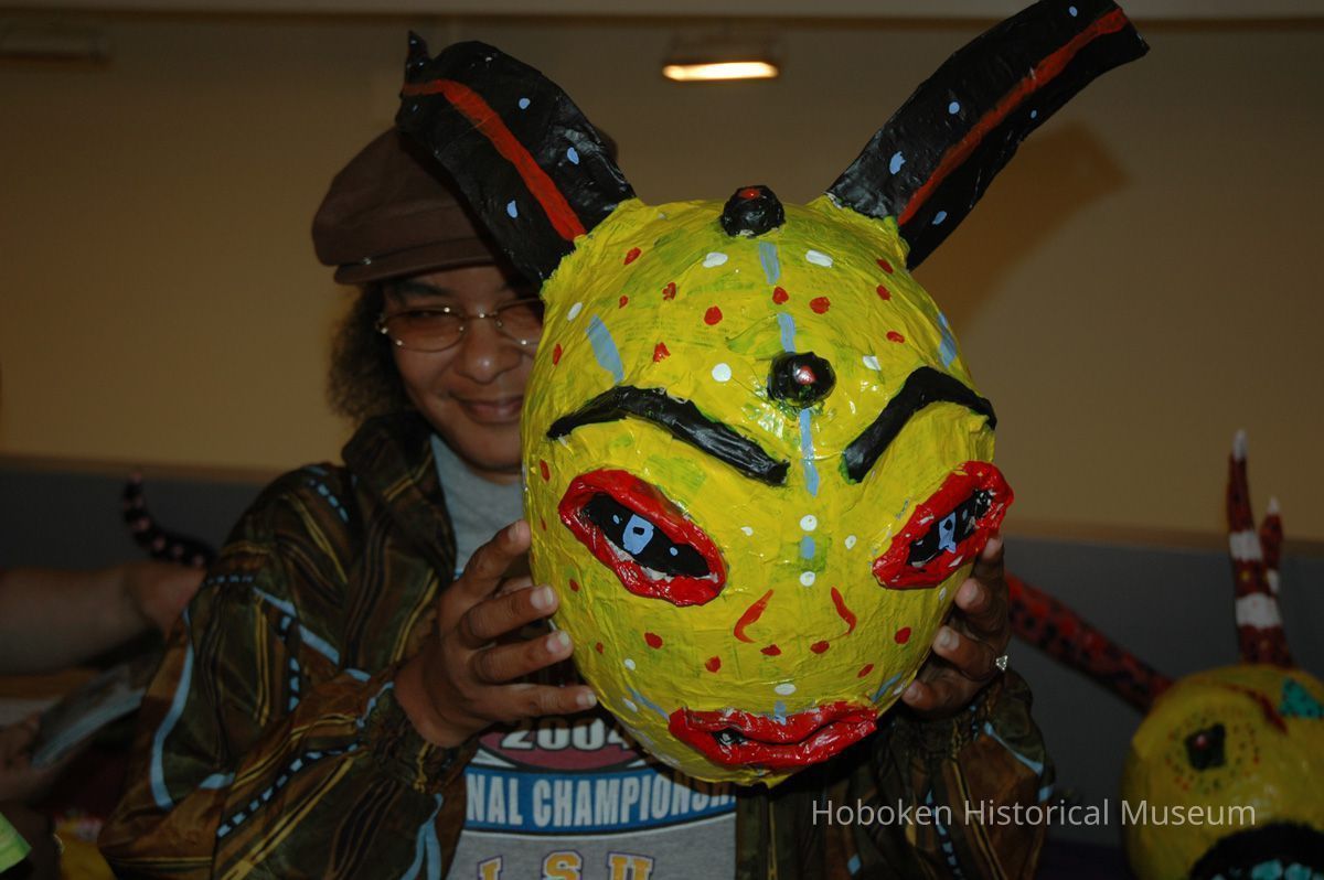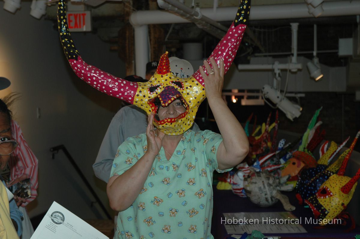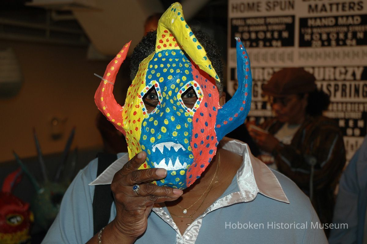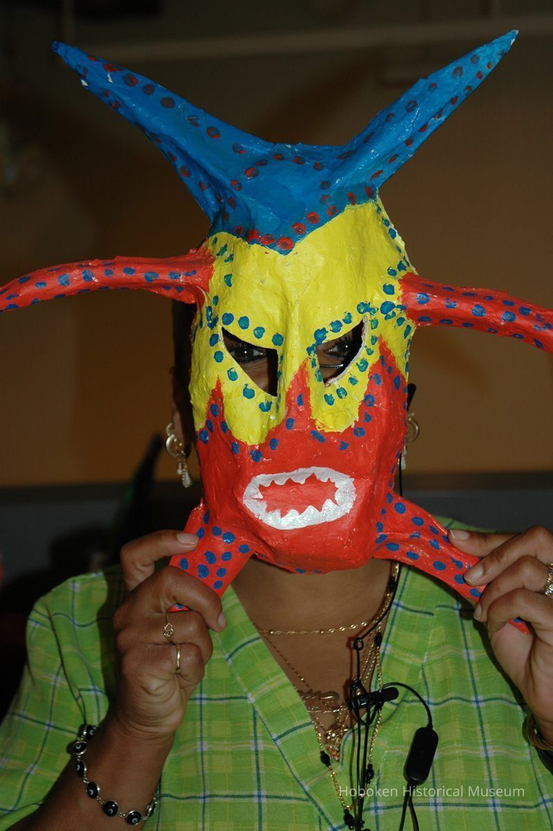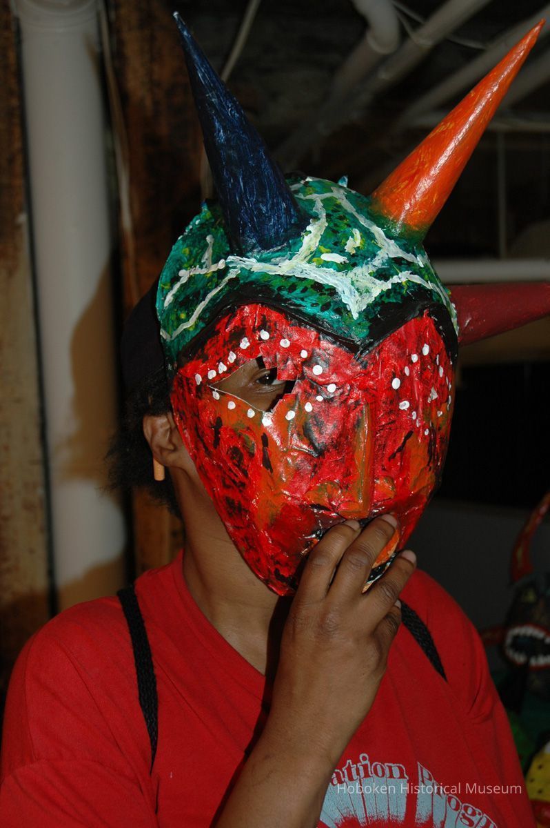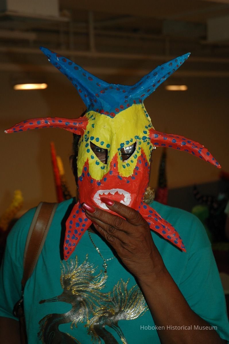 Notes: From The Vejigante and the Folk Festivals of Puerto Rico By Edwin Fontánez © 1996. Text below from exhibit of the masks in August-September 2006. ________________ The Vejigante (bay-he-GAHN-tay) is a fantastic, colorful character introduced into carnival celebrations hundreds of years ago. He is a classic example of the blending of African, Spanish, and Caribbean influences in Puerto Rican culture. During the carnival celebrations in Loiza Aldea and Ponce, the Vejigantes roam the streets in groups and chase children with their vejigas. The Vejigante is such an old character that he is even mentioned in the classic novel Don Quixote, written in 1605. Carnival in Ponce (pawn-say), a major city in the south, begins February 2 on "Dia de la Candelaria" (Day of the Bonfire). The masks are are characterized by their elaborate construction. Most are made of papier-mâché (shredded newspapers) and adorned with many horns and bells. The masks can be as big and elaborate as the artist's imagination. Commonly, they have a demonic or devilish appearance, but others resemble fantastic animals. __________________ The masks were made at the Hoboken Historical Museum during May and June of 2006. The mask-making classes were conducted by artist Ray Guzman with more than 25 children and parents participating. The mask starts with a balloon, then papier-mâché is applied over it along with horns and facial features before a final application of acrylic paint. Most who attended came to all four workshops and demonstrated a strong commitment to the project and created these incredible masks. The Museum wishes to thank artist Ray Guzman for teaching the classes, and a special thanks to both Tom Olivieri and Museum Trustee Inéz Garcia-Kiem for their advice and support. The project was funded by the Hudson County Office of Cultural Affairs, Tom DeGise, County Executive. Original or Copy: Digital copy Status: OK Status By: dw Status Date: 2006-11-28
