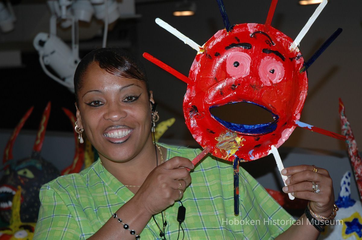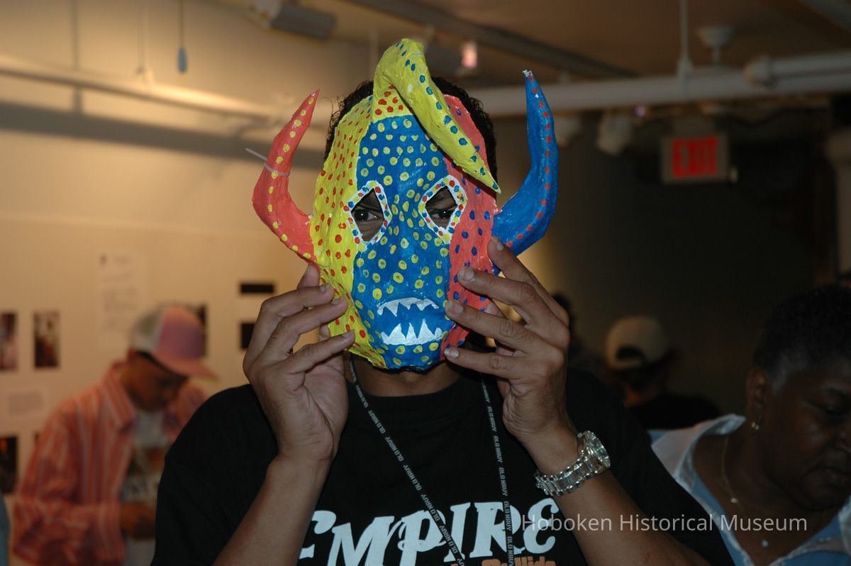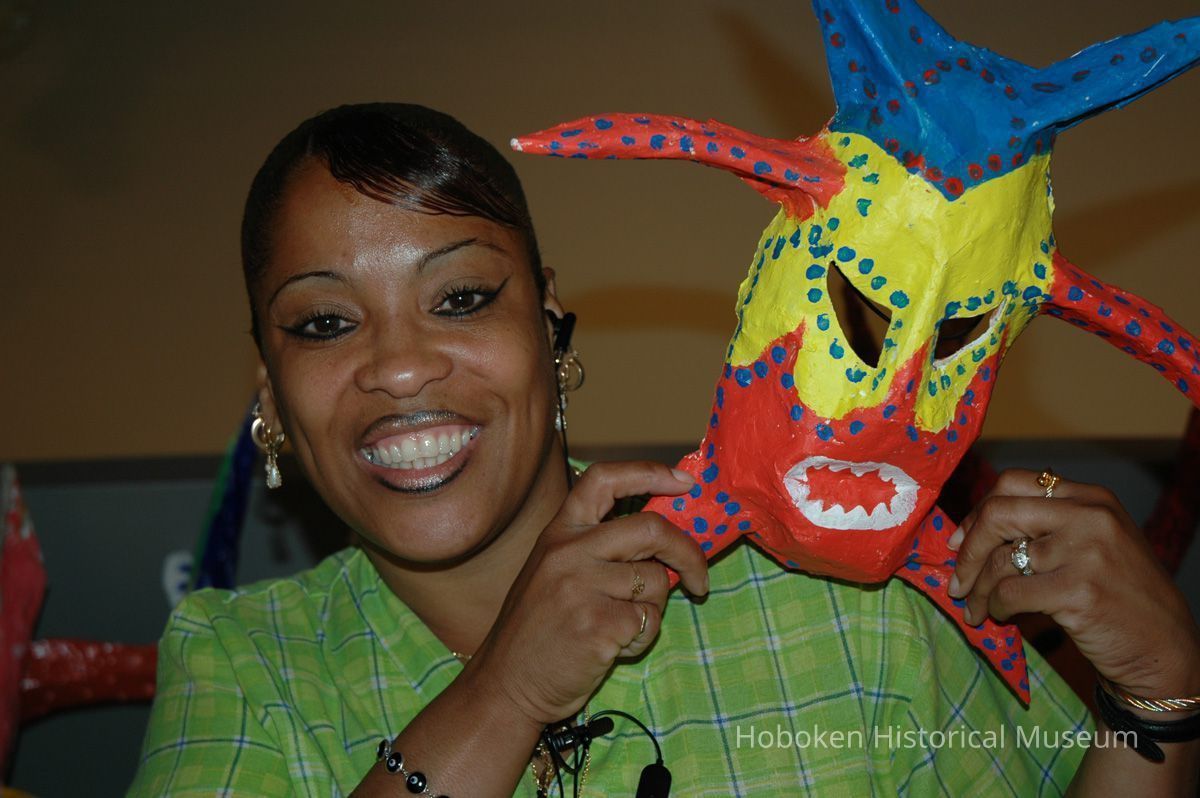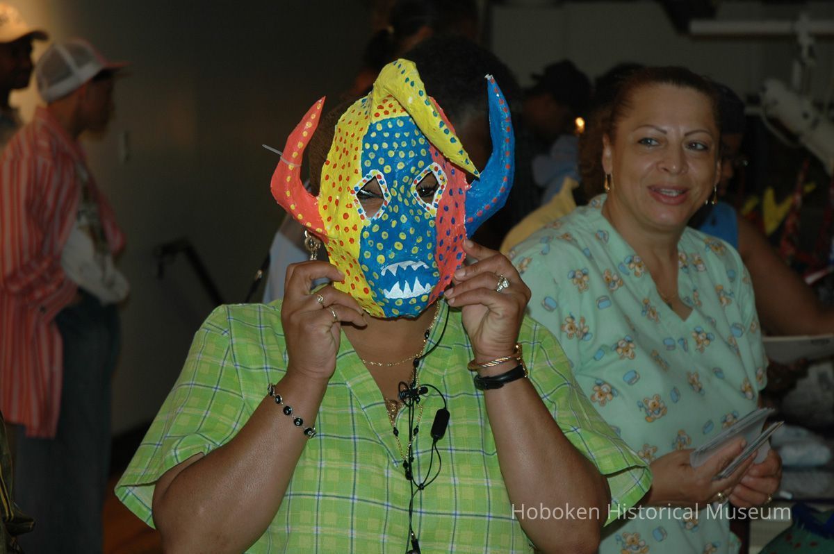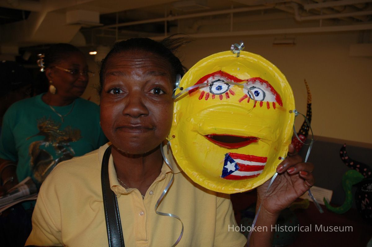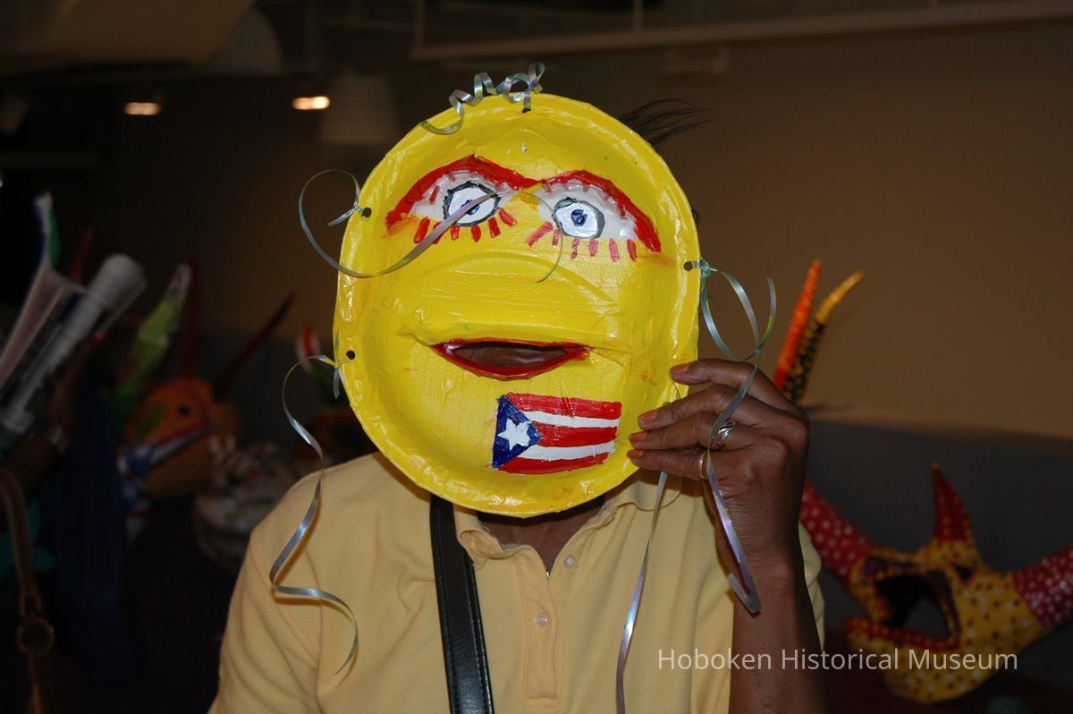 Notes: From The Vejigante and the Folk Festivals of Puerto Rico By Edwin Fontánez © 1996. Text below from exhibit of the masks in August-September 2006. ________________ The Vejigante (bay-he-GAHN-tay) is a fantastic, colorful character introduced into carnival celebrations hundreds of years ago. He is a classic example of the blending of African, Spanish, and Caribbean influences in Puerto Rican culture. During the carnival celebrations in Loiza Aldea and Ponce, the Vejigantes roam the streets in groups and chase children with their vejigas. The Vejigante is such an old character that he is even mentioned in the classic novel Don Quixote, written in 1605. Carnival in Ponce (pawn-say), a major city in the south, begins February 2 on "Dia de la Candelaria" (Day of the Bonfire). The masks are are characterized by their elaborate construction. Most are made of papier-mâché (shredded newspapers) and adorned with many horns and bells. The masks can be as big and elaborate as the artist's imagination. Commonly, they have a demonic or devilish appearance, but others resemble fantastic animals. __________________ The masks were made at the Hoboken Historical Museum during May and June of 2006. The mask-making classes were conducted by artist Ray Guzman with more than 25 children and parents participating. The mask starts with a balloon, then papier-mâché is applied over it along with horns and facial features before a final application of acrylic paint. Most who attended came to all four workshops and demonstrated a strong commitment to the project and created these incredible masks. The Museum wishes to thank artist Ray Guzman for teaching the classes, and a special thanks to both Tom Olivieri and Museum Trustee Inéz Garcia-Kiem for their advice and support. The project was funded by the Hudson County Office of Cultural Affairs, Tom DeGise, County Executive. Original or Copy: Digital copy Status: OK Status By: dw Status Date: 2006-11-28