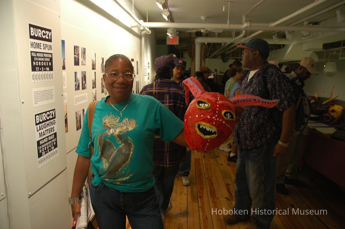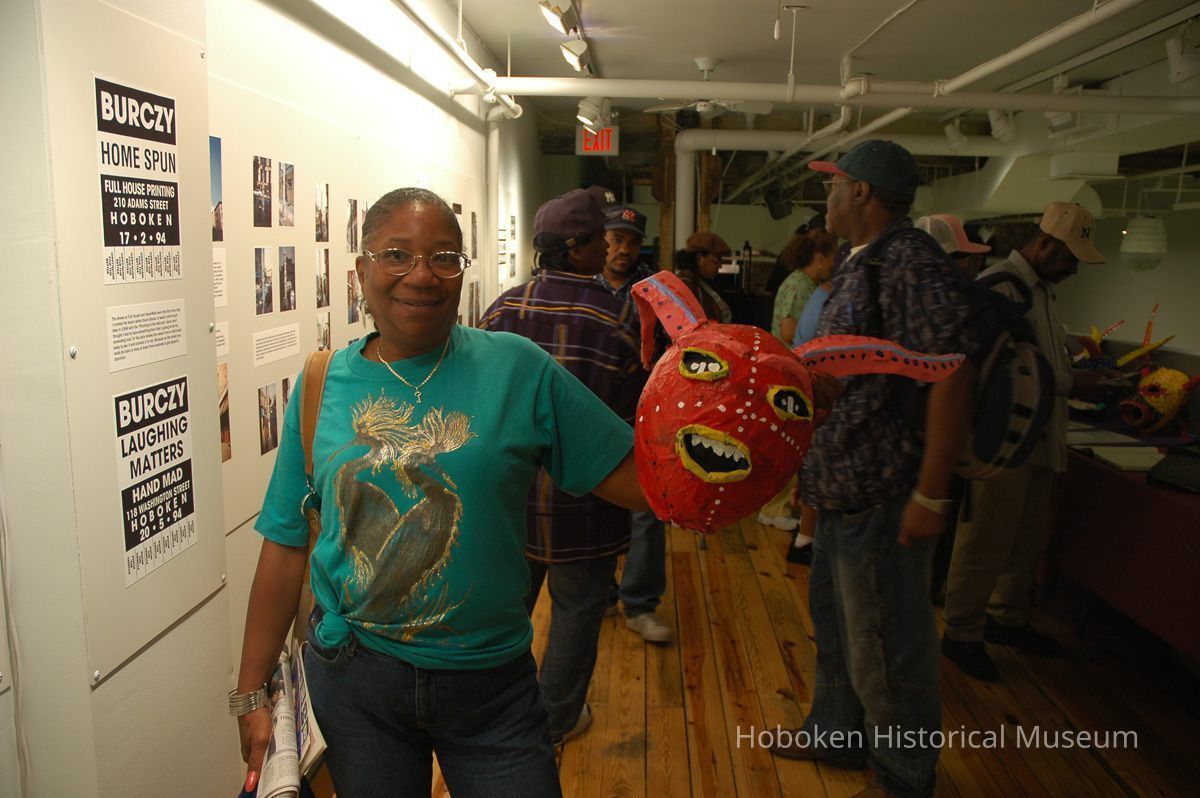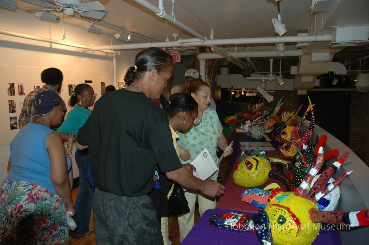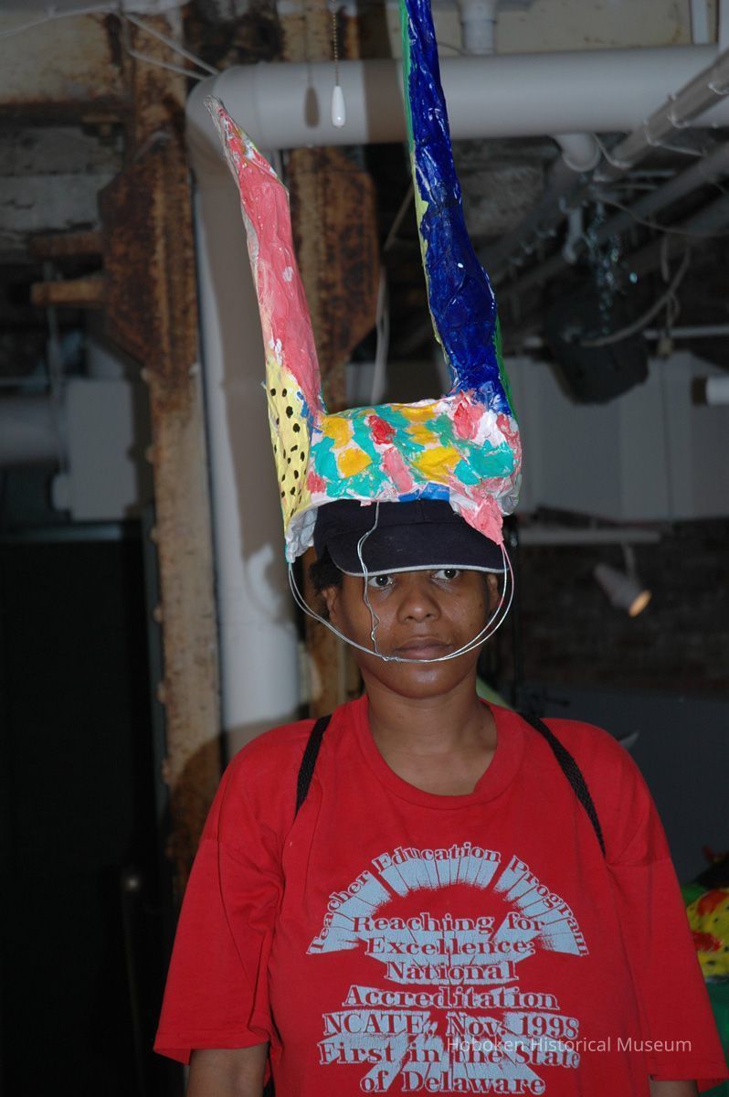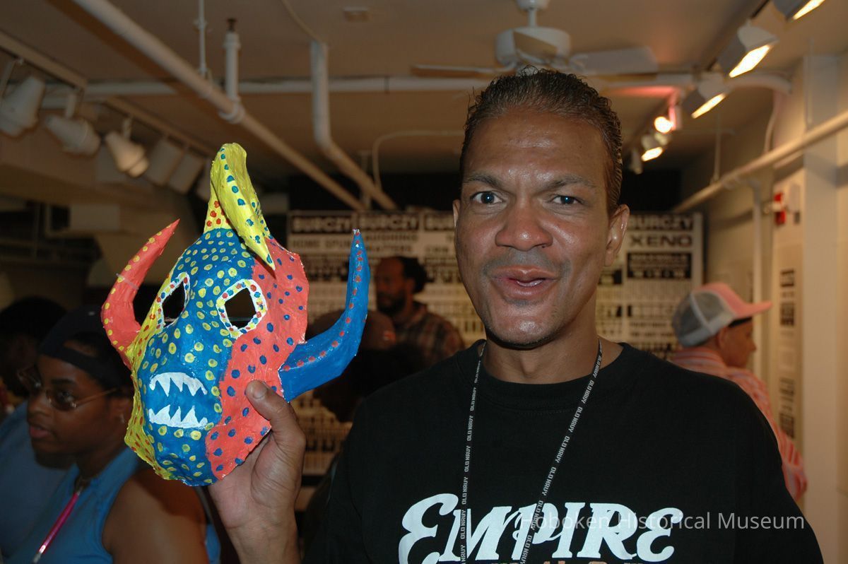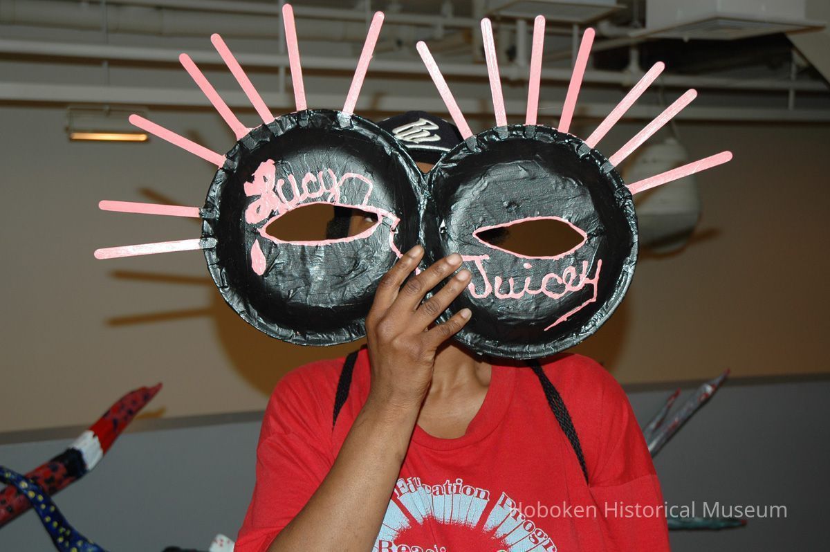 Notes: From The Vejigante and the Folk Festivals of Puerto Rico By Edwin Fontánez © 1996. Text below from exhibit of the masks in August-September 2006. ________________ The Vejigante (bay-he-GAHN-tay) is a fantastic, colorful character introduced into carnival celebrations hundreds of years ago. He is a classic example of the blending of African, Spanish, and Caribbean influences in Puerto Rican culture. During the carnival celebrations in Loiza Aldea and Ponce, the Vejigantes roam the streets in groups and chase children with their vejigas. The Vejigante is such an old character that he is even mentioned in the classic novel Don Quixote, written in 1605. Carnival in Ponce (pawn-say), a major city in the south, begins February 2 on "Dia de la Candelaria" (Day of the Bonfire). The masks are are characterized by their elaborate construction. Most are made of papier-mâché (shredded newspapers) and adorned with many horns and bells. The masks can be as big and elaborate as the artist's imagination. Commonly, they have a demonic or devilish appearance, but others resemble fantastic animals. __________________ The masks were made at the Hoboken Historical Museum during May and June of 2006. The mask-making classes were conducted by artist Ray Guzman with more than 25 children and parents participating. The mask starts with a balloon, then papier-mâché is applied over it along with horns and facial features before a final application of acrylic paint. Most who attended came to all four workshops and demonstrated a strong commitment to the project and created these incredible masks. The Museum wishes to thank artist Ray Guzman for teaching the classes, and a special thanks to both Tom Olivieri and Museum Trustee Inéz Garcia-Kiem for their advice and support. The project was funded by the Hudson County Office of Cultural Affairs, Tom DeGise, County Executive. Original or Copy: Digital copy Status: OK Status By: dw Status Date: 2006-11-28