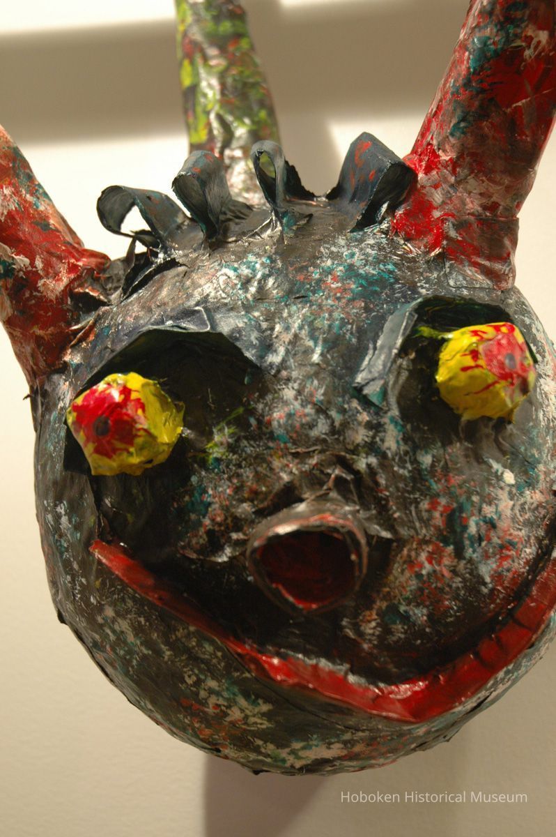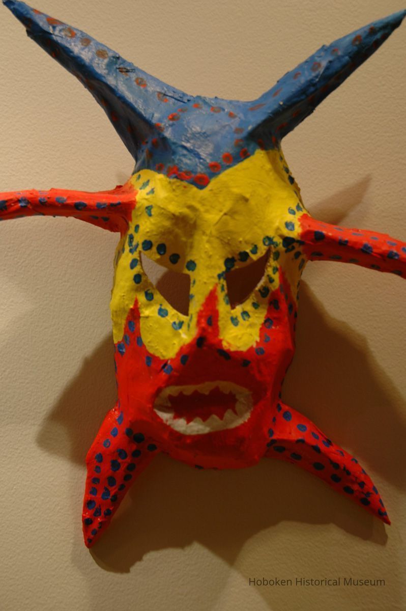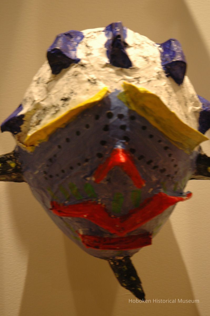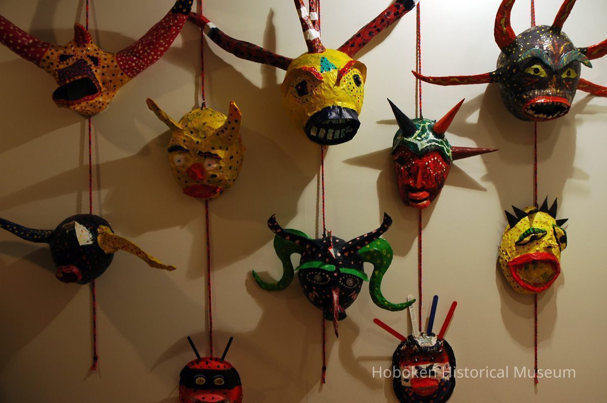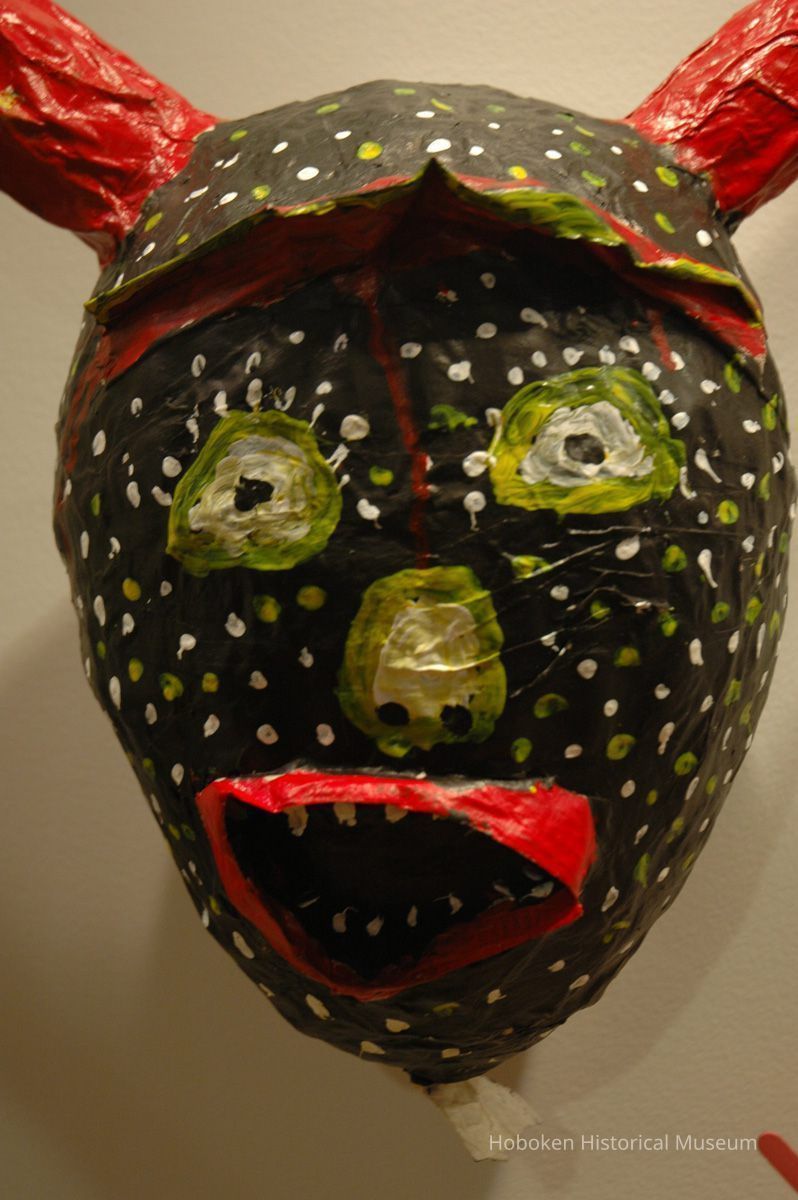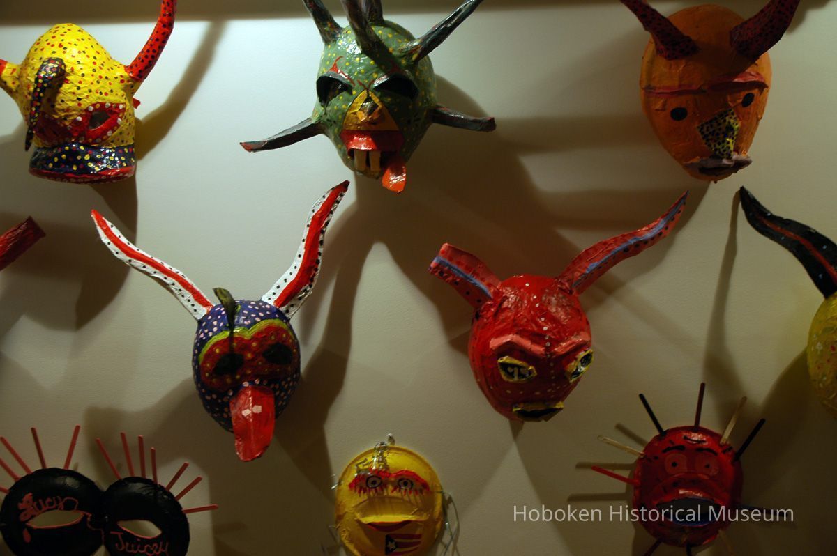 Notes: From The Vejigante and the Folk Festivals of Puerto Rico By Edwin Fontánez © 1996. Text below from exhibit of the masks in August-September 2006. ________________ The Vejigante (bay-he-GAHN-tay) is a fantastic, colorful character introduced into carnival celebrations hundreds of years ago. He is a classic example of the blending of African, Spanish, and Caribbean influences in Puerto Rican culture. During the carnival celebrations in Loiza Aldea and Ponce, the Vejigantes roam the streets in groups and chase children with their vejigas. The Vejigante is such an old character that he is even mentioned in the classic novel Don Quixote, written in 1605. Carnival in Ponce (pawn-say), a major city in the south, begins February 2 on "Dia de la Candelaria" (Day of the Bonfire). The masks are are characterized by their elaborate construction. Most are made of papier-mâché (shredded newspapers) and adorned with many horns and bells. The masks can be as big and elaborate as the artist's imagination. Commonly, they have a demonic or devilish appearance, but others resemble fantastic animals. __________________ The masks were made at the Hoboken Historical Museum during May and June of 2006. The mask-making classes were conducted by artist Ray Guzman with more than 25 children and parents participating. The mask starts with a balloon, then papier-mâché is applied over it along with horns and facial features before a final application of acrylic paint. Most who attended came to all four workshops and demonstrated a strong commitment to the project and created these incredible masks. The Museum wishes to thank artist Ray Guzman for teaching the classes, and a special thanks to both Tom Olivieri and Museum Trustee Inéz Garcia-Kiem for their advice and support. The project was funded by the Hudson County Office of Cultural Affairs, Tom DeGise, County Executive. Original or Copy: Digital copy Status: OK Status By: dw Status Date: 2006-11-28