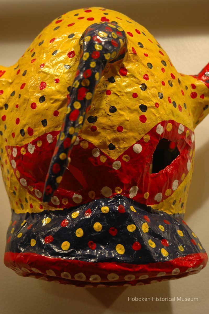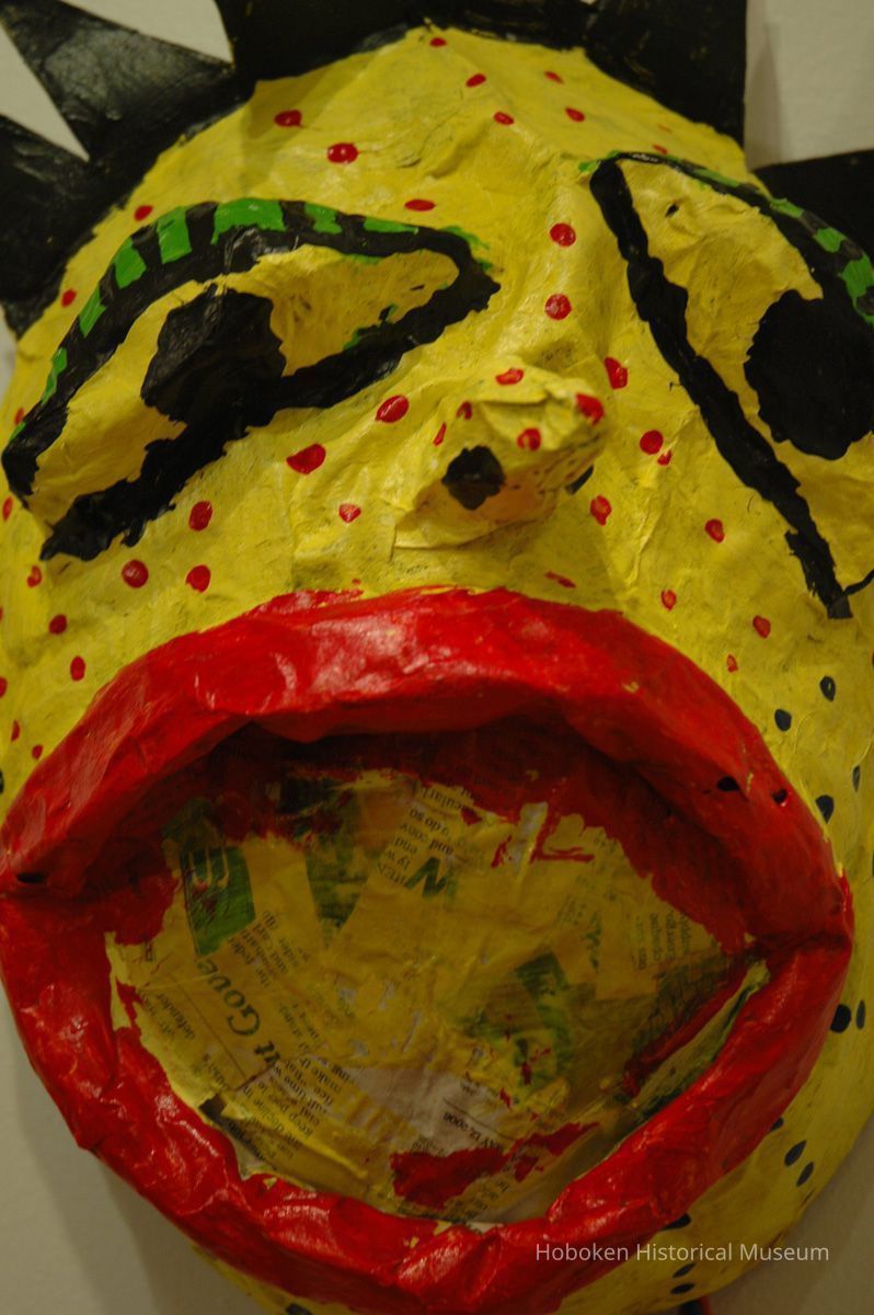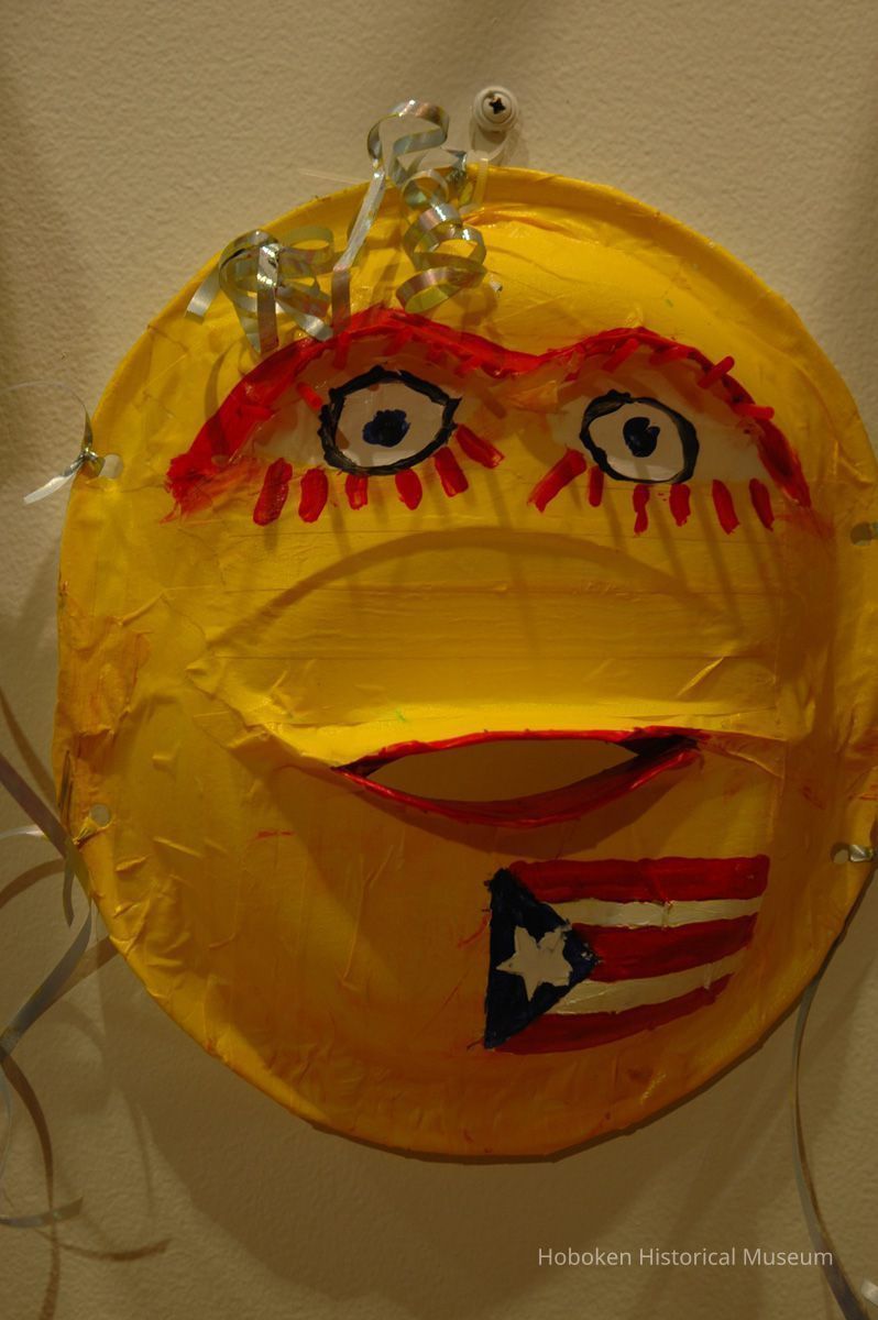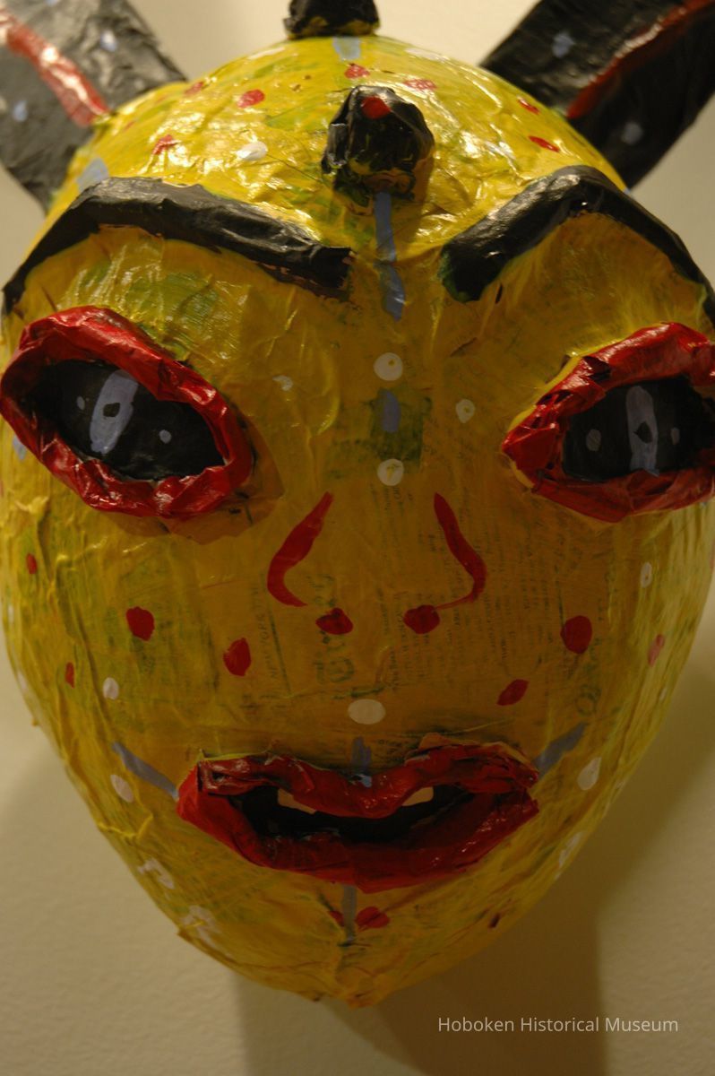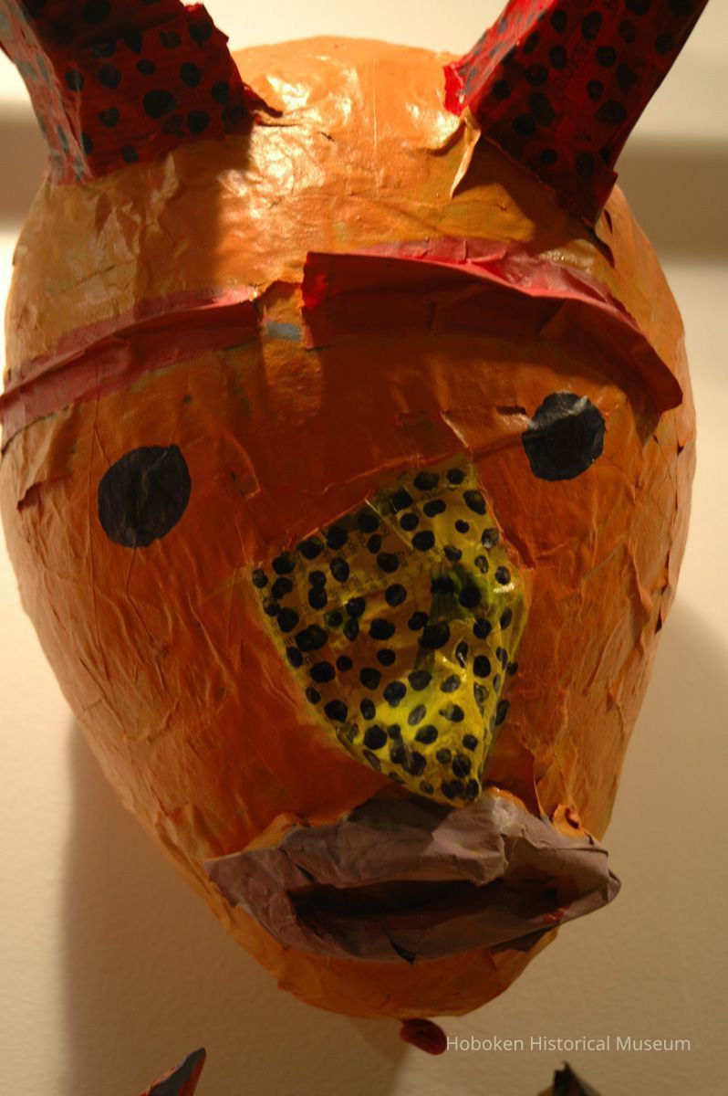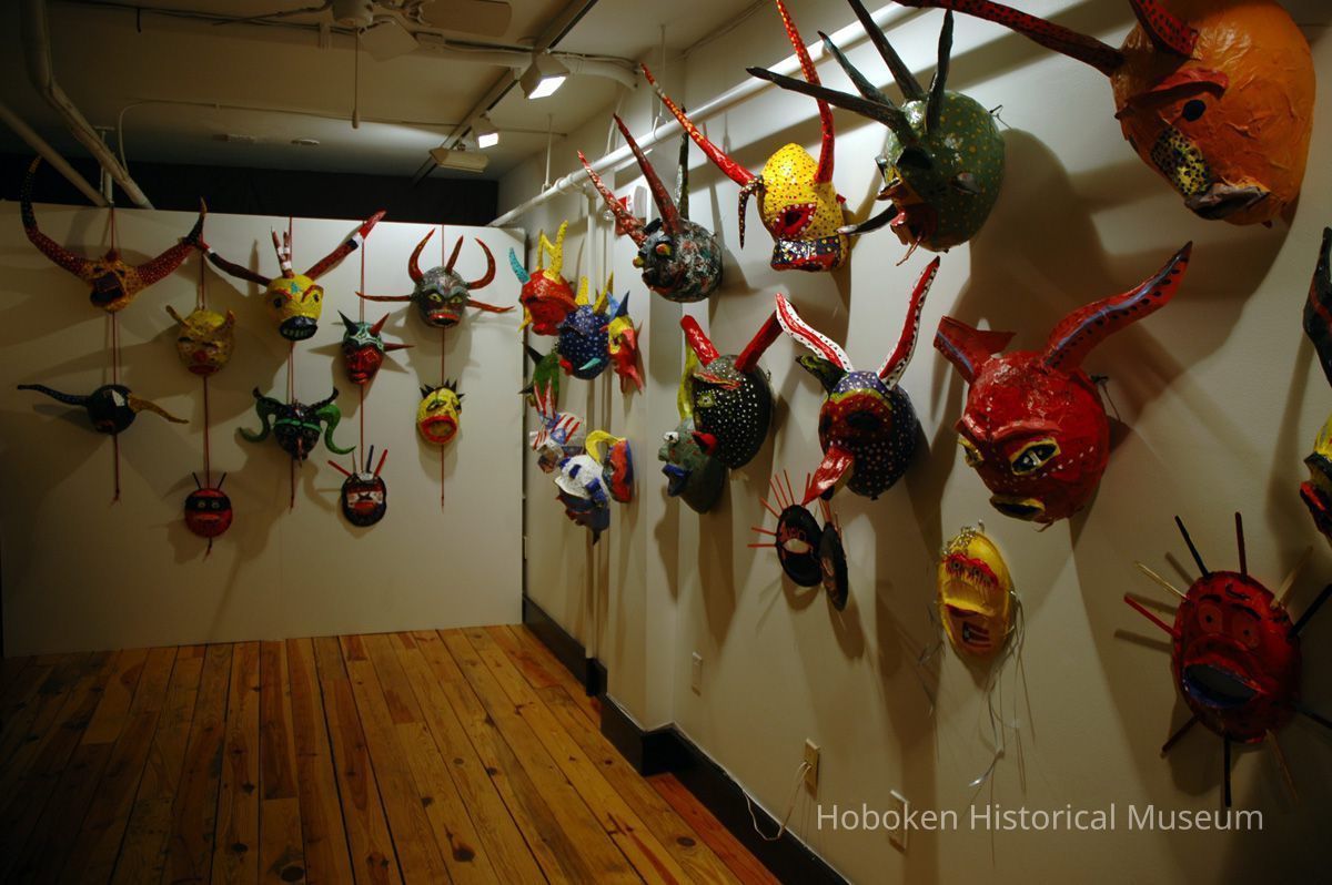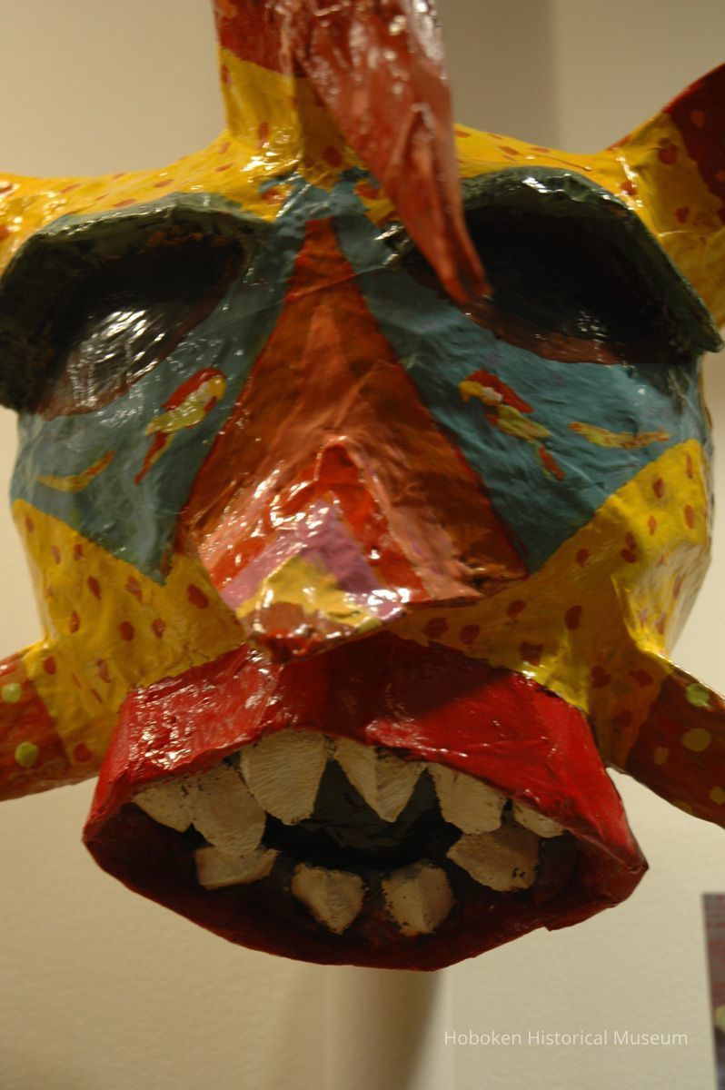 Notes: From The Vejigante and the Folk Festivals of Puerto Rico By Edwin Fontánez © 1996. Text below from exhibit of the masks in August-September 2006. ________________ The Vejigante (bay-he-GAHN-tay) is a fantastic, colorful character introduced into carnival celebrations hundreds of years ago. He is a classic example of the blending of African, Spanish, and Caribbean influences in Puerto Rican culture. During the carnival celebrations in Loiza Aldea and Ponce, the Vejigantes roam the streets in groups and chase children with their vejigas. The Vejigante is such an old character that he is even mentioned in the classic novel Don Quixote, written in 1605. Carnival in Ponce (pawn-say), a major city in the south, begins February 2 on "Dia de la Candelaria" (Day of the Bonfire). The masks are are characterized by their elaborate construction. Most are made of papier-mâché (shredded newspapers) and adorned with many horns and bells. The masks can be as big and elaborate as the artist's imagination. Commonly, they have a demonic or devilish appearance, but others resemble fantastic animals. __________________ The masks were made at the Hoboken Historical Museum during May and June of 2006. The mask-making classes were conducted by artist Ray Guzman with more than 25 children and parents participating. The mask starts with a balloon, then papier-mâché is applied over it along with horns and facial features before a final application of acrylic paint. Most who attended came to all four workshops and demonstrated a strong commitment to the project and created these incredible masks. The Museum wishes to thank artist Ray Guzman for teaching the classes, and a special thanks to both Tom Olivieri and Museum Trustee Inéz Garcia-Kiem for their advice and support. The project was funded by the Hudson County Office of Cultural Affairs, Tom DeGise, County Executive. Original or Copy: Digital copy Status: OK Status By: dw Status Date: 2006-11-28