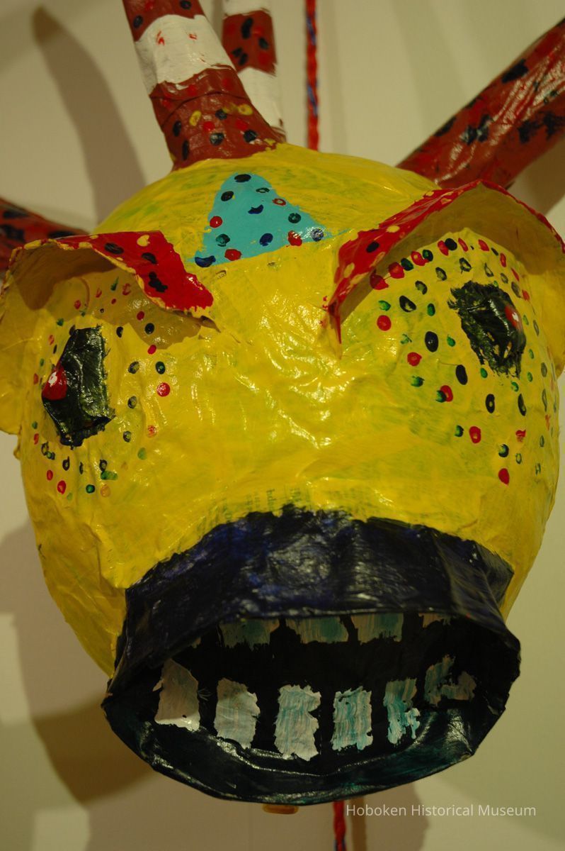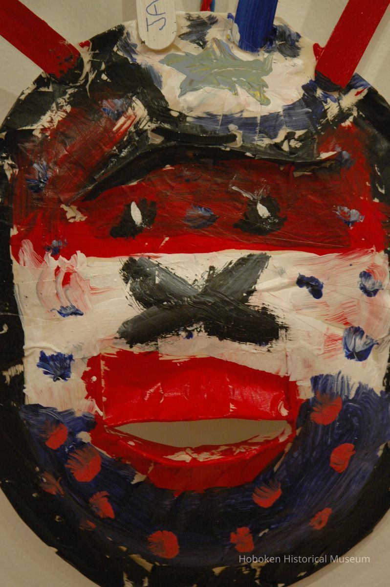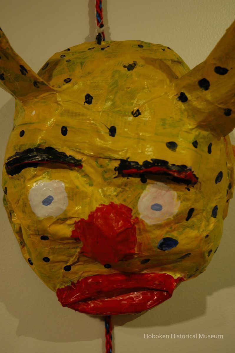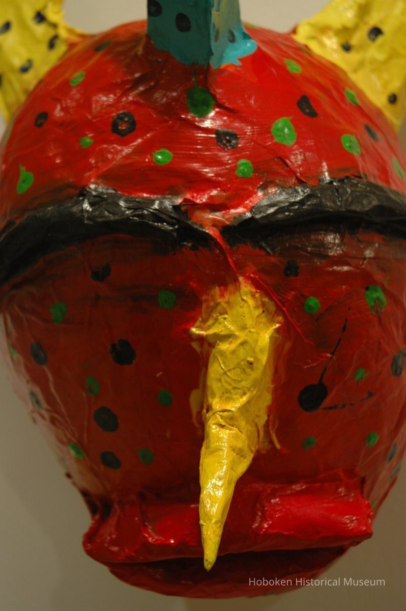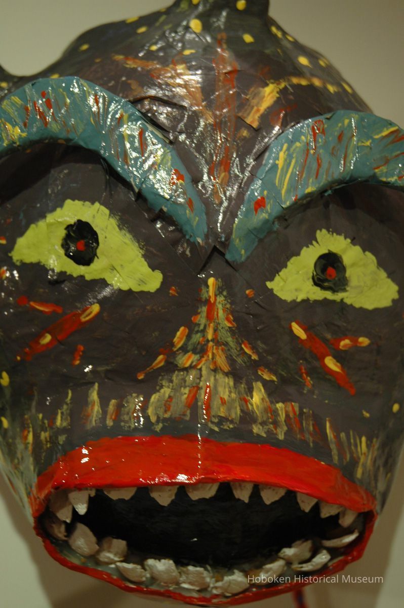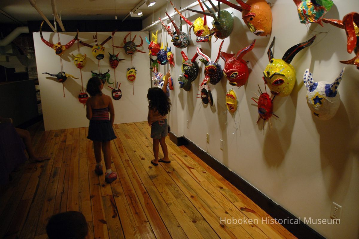 Notes: From The Vejigante and the Folk Festivals of Puerto Rico By Edwin Fontánez © 1996. Text below from exhibit of the masks in August-September 2006. ________________ The Vejigante (bay-he-GAHN-tay) is a fantastic, colorful character introduced into carnival celebrations hundreds of years ago. He is a classic example of the blending of African, Spanish, and Caribbean influences in Puerto Rican culture. During the carnival celebrations in Loiza Aldea and Ponce, the Vejigantes roam the streets in groups and chase children with their vejigas. The Vejigante is such an old character that he is even mentioned in the classic novel Don Quixote, written in 1605. Carnival in Ponce (pawn-say), a major city in the south, begins February 2 on "Dia de la Candelaria" (Day of the Bonfire). The masks are are characterized by their elaborate construction. Most are made of papier-mâché (shredded newspapers) and adorned with many horns and bells. The masks can be as big and elaborate as the artist's imagination. Commonly, they have a demonic or devilish appearance, but others resemble fantastic animals. __________________ The masks were made at the Hoboken Historical Museum during May and June of 2006. The mask-making classes were conducted by artist Ray Guzman with more than 25 children and parents participating. The mask starts with a balloon, then papier-mâché is applied over it along with horns and facial features before a final application of acrylic paint. Most who attended came to all four workshops and demonstrated a strong commitment to the project and created these incredible masks. The Museum wishes to thank artist Ray Guzman for teaching the classes, and a special thanks to both Tom Olivieri and Museum Trustee Inéz Garcia-Kiem for their advice and support. The project was funded by the Hudson County Office of Cultural Affairs, Tom DeGise, County Executive. Original or Copy: Digital copy Status: OK Status By: dw Status Date: 2006-11-28