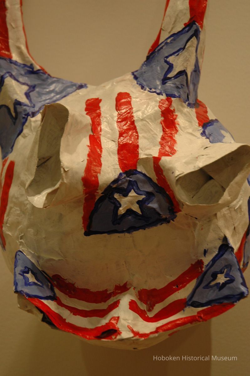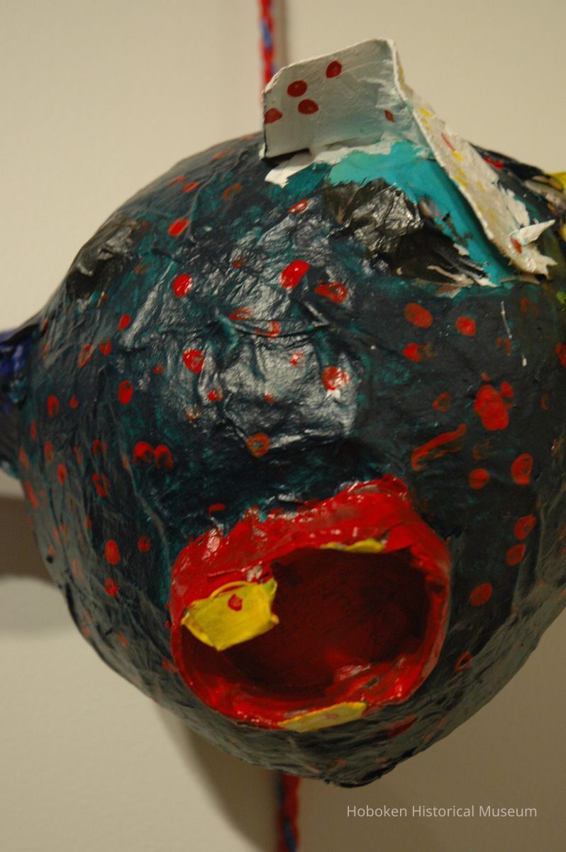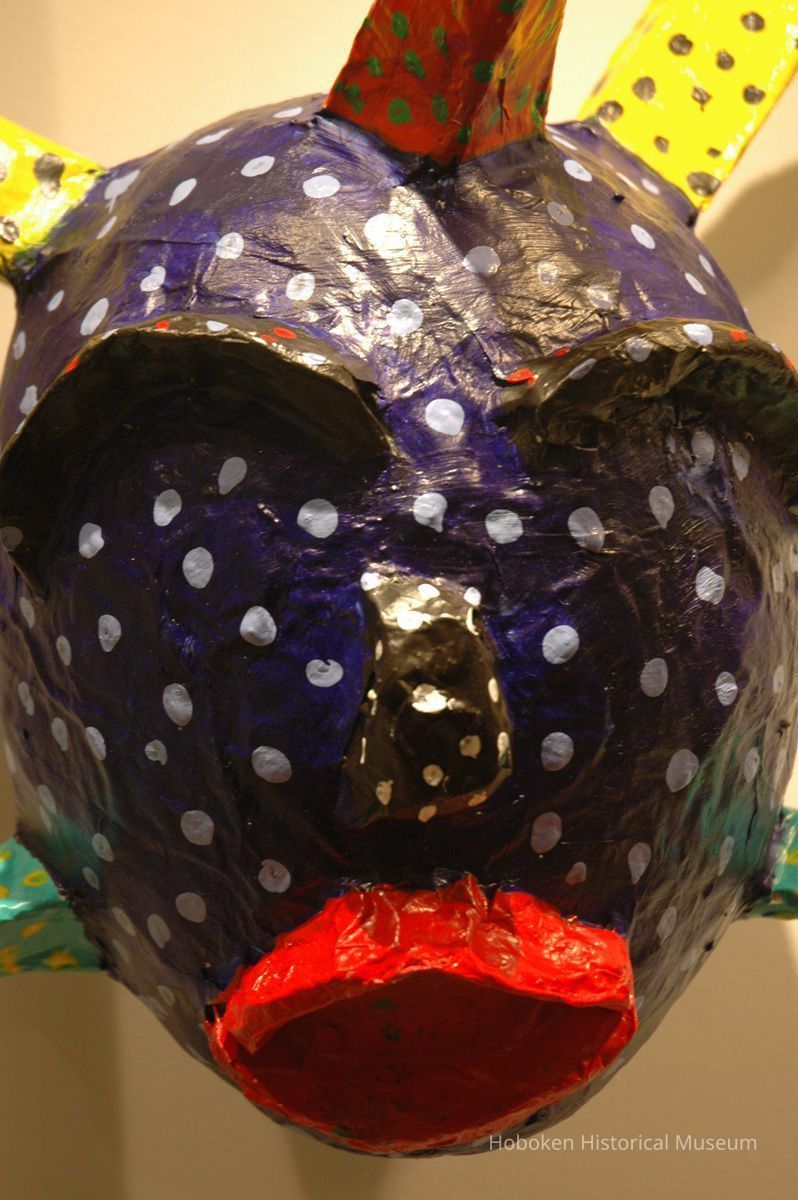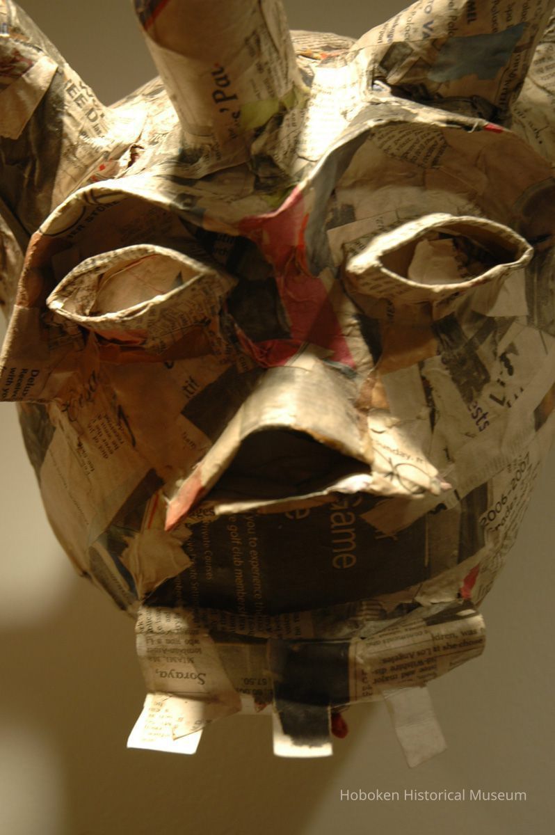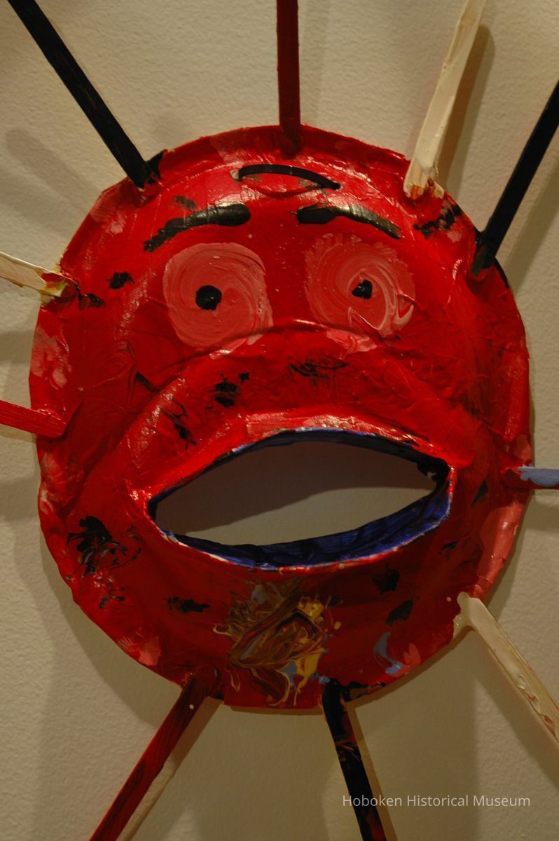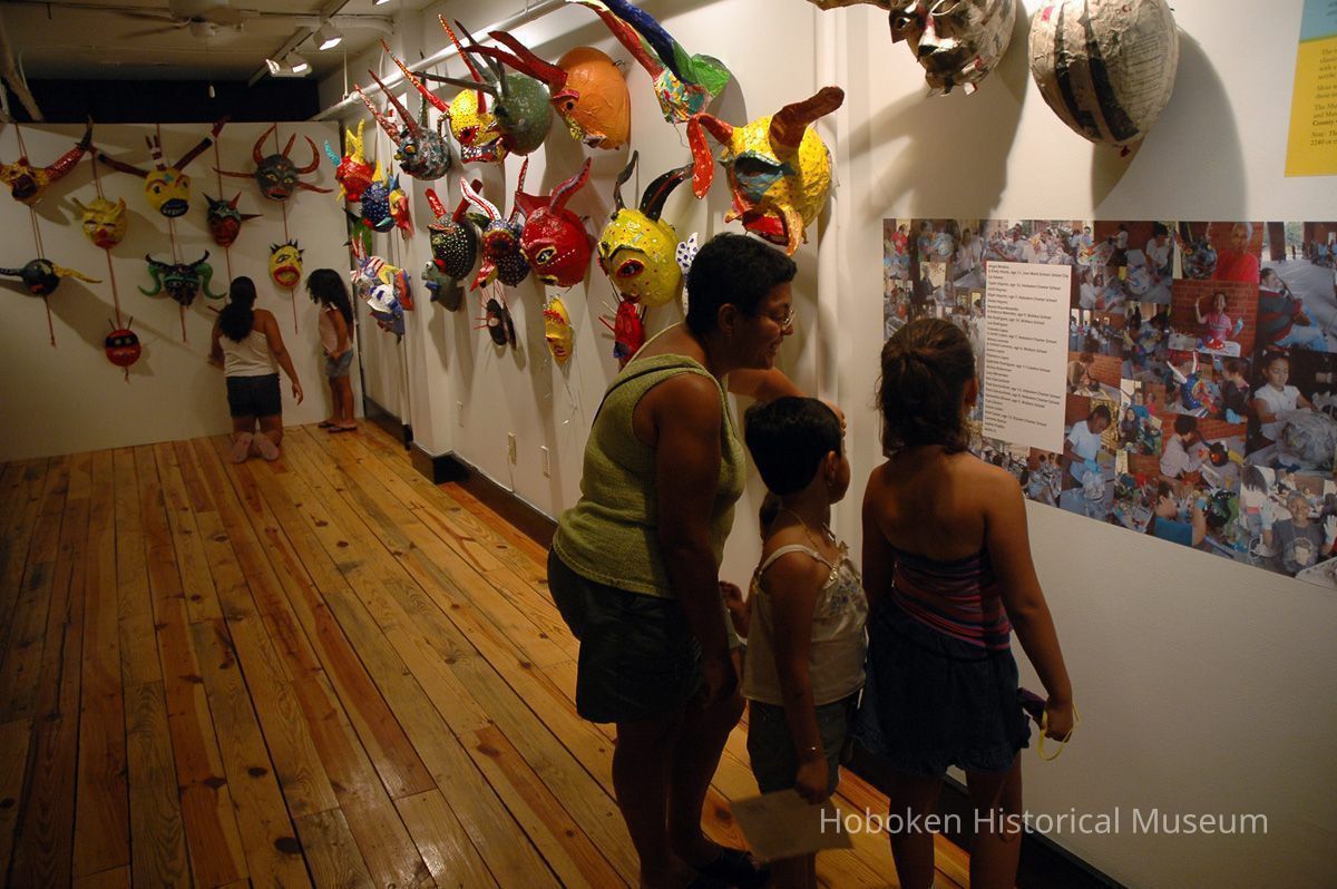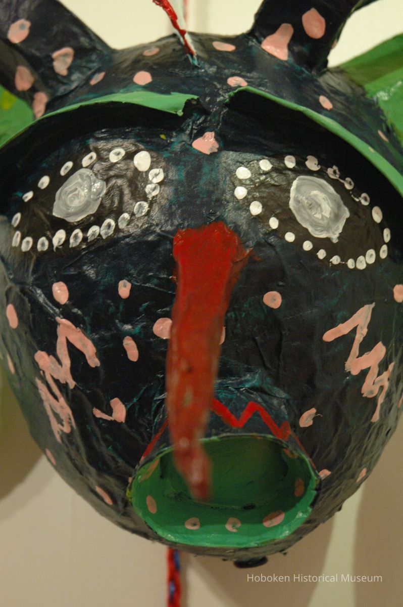 Notes: From The Vejigante and the Folk Festivals of Puerto Rico By Edwin Fontánez © 1996. Text below from exhibit of the masks in August-September 2006. ________________ The Vejigante (bay-he-GAHN-tay) is a fantastic, colorful character introduced into carnival celebrations hundreds of years ago. He is a classic example of the blending of African, Spanish, and Caribbean influences in Puerto Rican culture. During the carnival celebrations in Loiza Aldea and Ponce, the Vejigantes roam the streets in groups and chase children with their vejigas. The Vejigante is such an old character that he is even mentioned in the classic novel Don Quixote, written in 1605. Carnival in Ponce (pawn-say), a major city in the south, begins February 2 on "Dia de la Candelaria" (Day of the Bonfire). The masks are are characterized by their elaborate construction. Most are made of papier-mâché (shredded newspapers) and adorned with many horns and bells. The masks can be as big and elaborate as the artist's imagination. Commonly, they have a demonic or devilish appearance, but others resemble fantastic animals. __________________ The masks were made at the Hoboken Historical Museum during May and June of 2006. The mask-making classes were conducted by artist Ray Guzman with more than 25 children and parents participating. The mask starts with a balloon, then papier-mâché is applied over it along with horns and facial features before a final application of acrylic paint. Most who attended came to all four workshops and demonstrated a strong commitment to the project and created these incredible masks. The Museum wishes to thank artist Ray Guzman for teaching the classes, and a special thanks to both Tom Olivieri and Museum Trustee Inéz Garcia-Kiem for their advice and support. The project was funded by the Hudson County Office of Cultural Affairs, Tom DeGise, County Executive. Original or Copy: Digital copy Status: OK Status By: dw Status Date: 2006-11-28