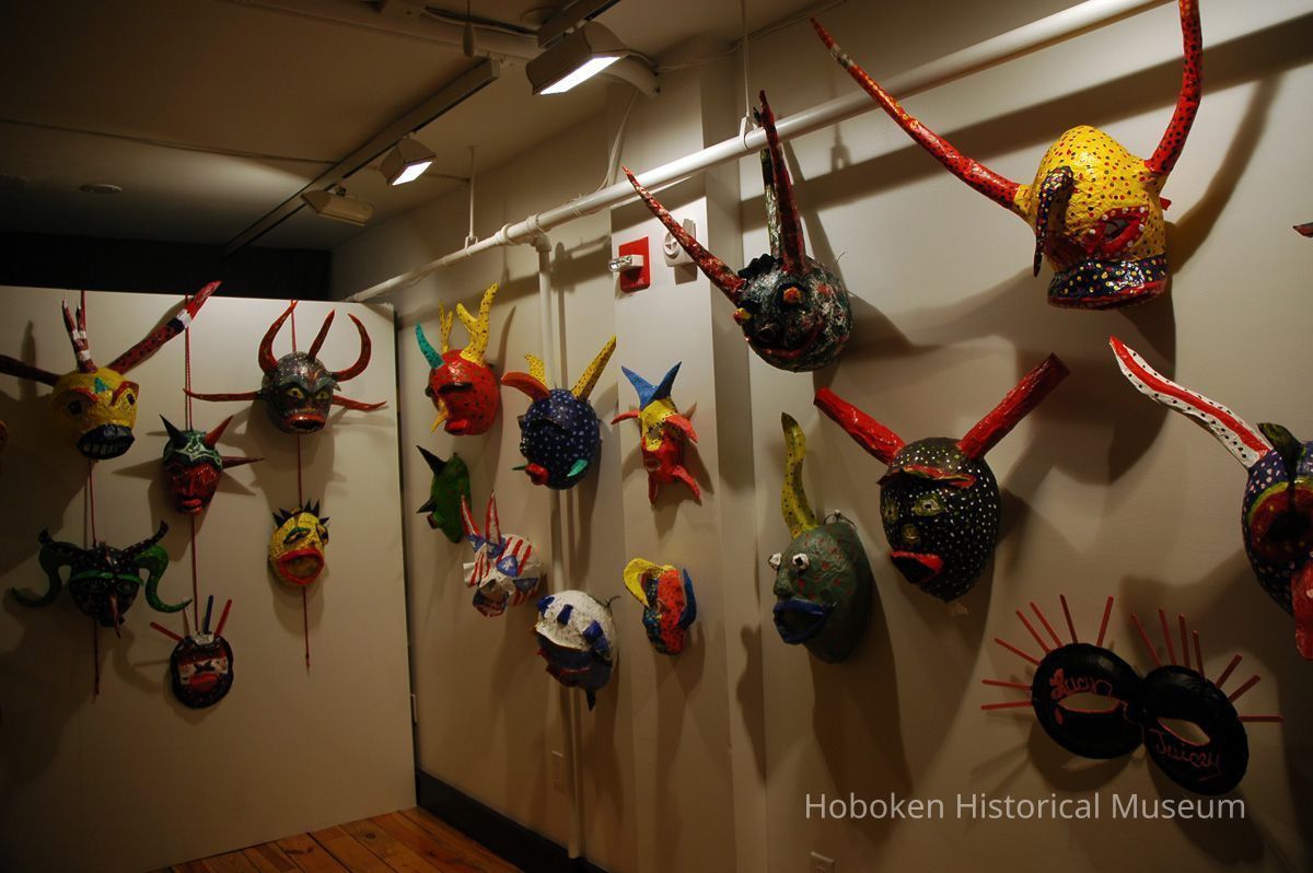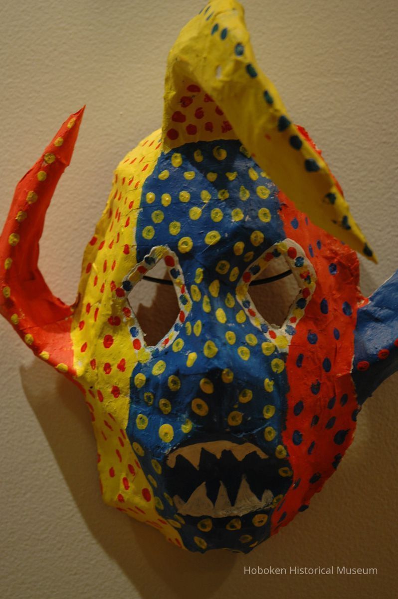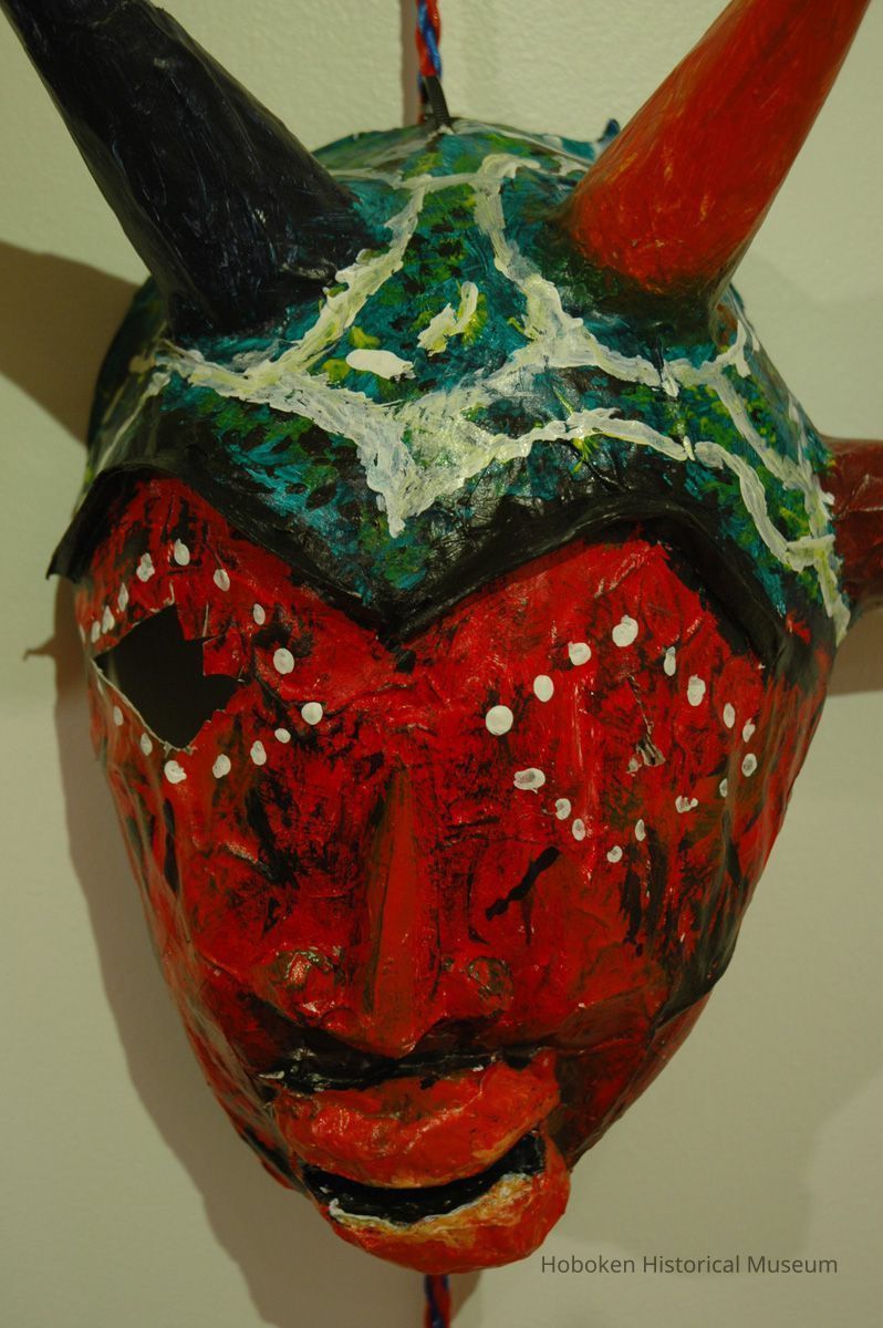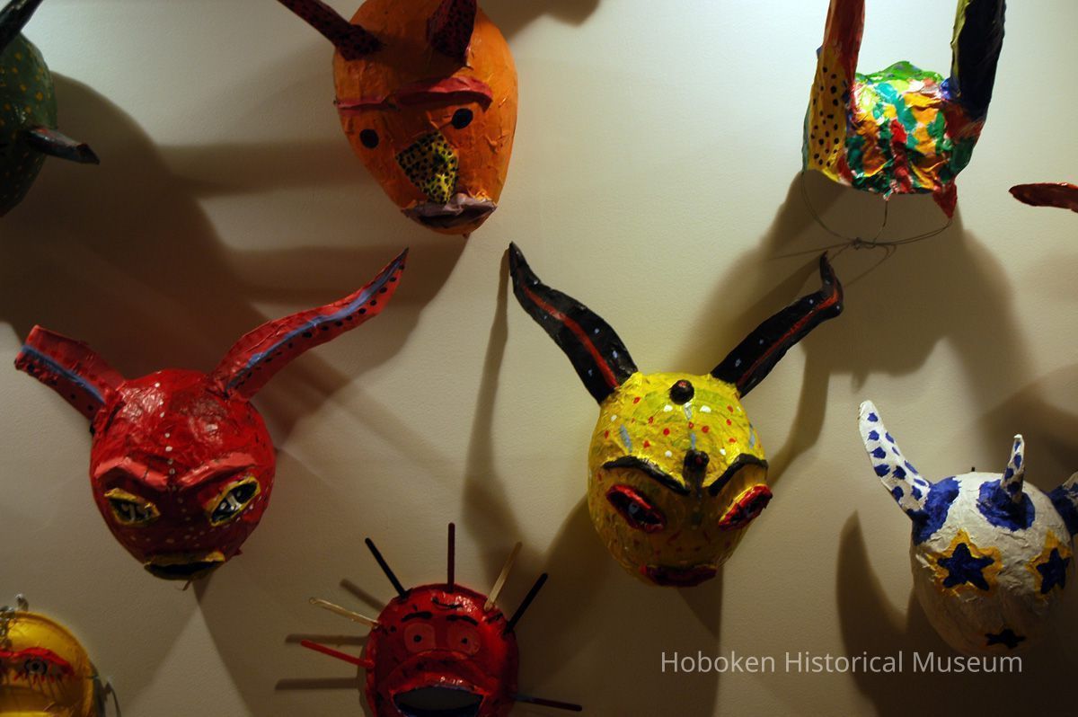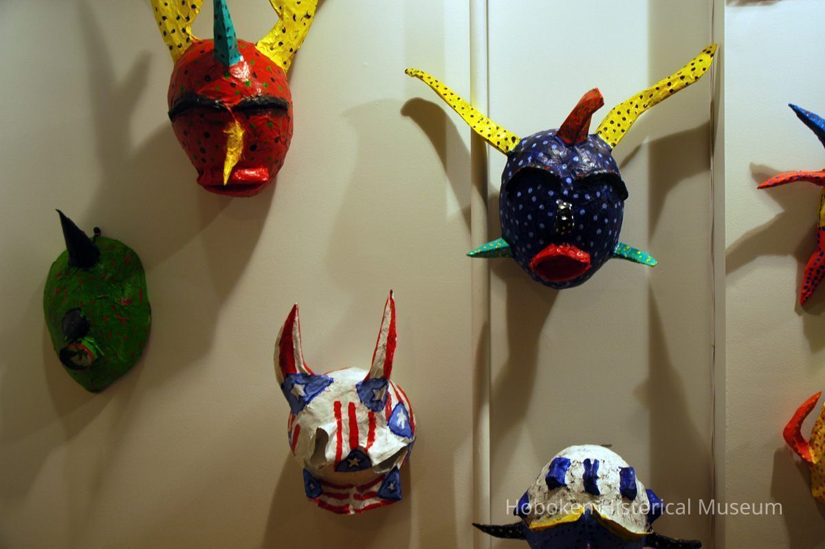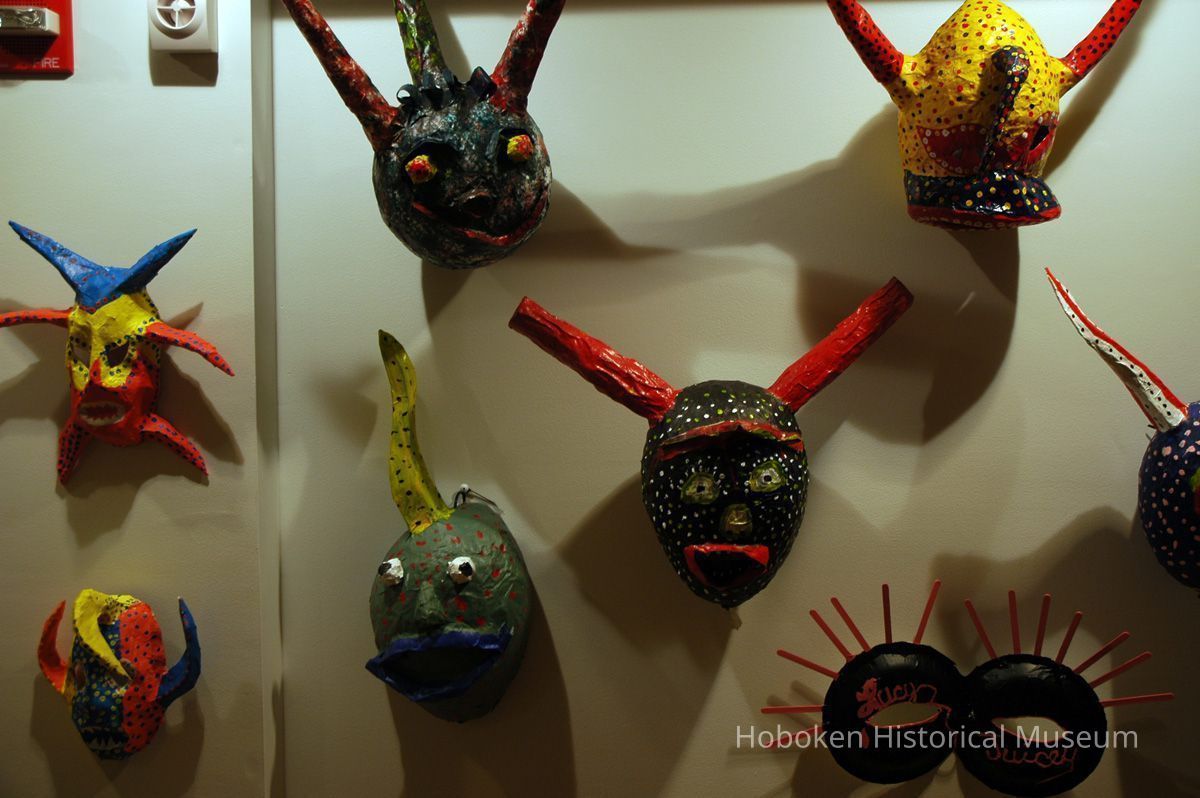 Notes: From The Vejigante and the Folk Festivals of Puerto Rico By Edwin Fontánez © 1996. Text below from exhibit of the masks in August-September 2006. ________________ The Vejigante (bay-he-GAHN-tay) is a fantastic, colorful character introduced into carnival celebrations hundreds of years ago. He is a classic example of the blending of African, Spanish, and Caribbean influences in Puerto Rican culture. During the carnival celebrations in Loiza Aldea and Ponce, the Vejigantes roam the streets in groups and chase children with their vejigas. The Vejigante is such an old character that he is even mentioned in the classic novel Don Quixote, written in 1605. Carnival in Ponce (pawn-say), a major city in the south, begins February 2 on "Dia de la Candelaria" (Day of the Bonfire). The masks are are characterized by their elaborate construction. Most are made of papier-mâché (shredded newspapers) and adorned with many horns and bells. The masks can be as big and elaborate as the artist's imagination. Commonly, they have a demonic or devilish appearance, but others resemble fantastic animals. __________________ The masks were made at the Hoboken Historical Museum during May and June of 2006. The mask-making classes were conducted by artist Ray Guzman with more than 25 children and parents participating. The mask starts with a balloon, then papier-mâché is applied over it along with horns and facial features before a final application of acrylic paint. Most who attended came to all four workshops and demonstrated a strong commitment to the project and created these incredible masks. The Museum wishes to thank artist Ray Guzman for teaching the classes, and a special thanks to both Tom Olivieri and Museum Trustee Inéz Garcia-Kiem for their advice and support. The project was funded by the Hudson County Office of Cultural Affairs, Tom DeGise, County Executive. Original or Copy: Digital copy Status: OK Status By: dw Status Date: 2006-11-28