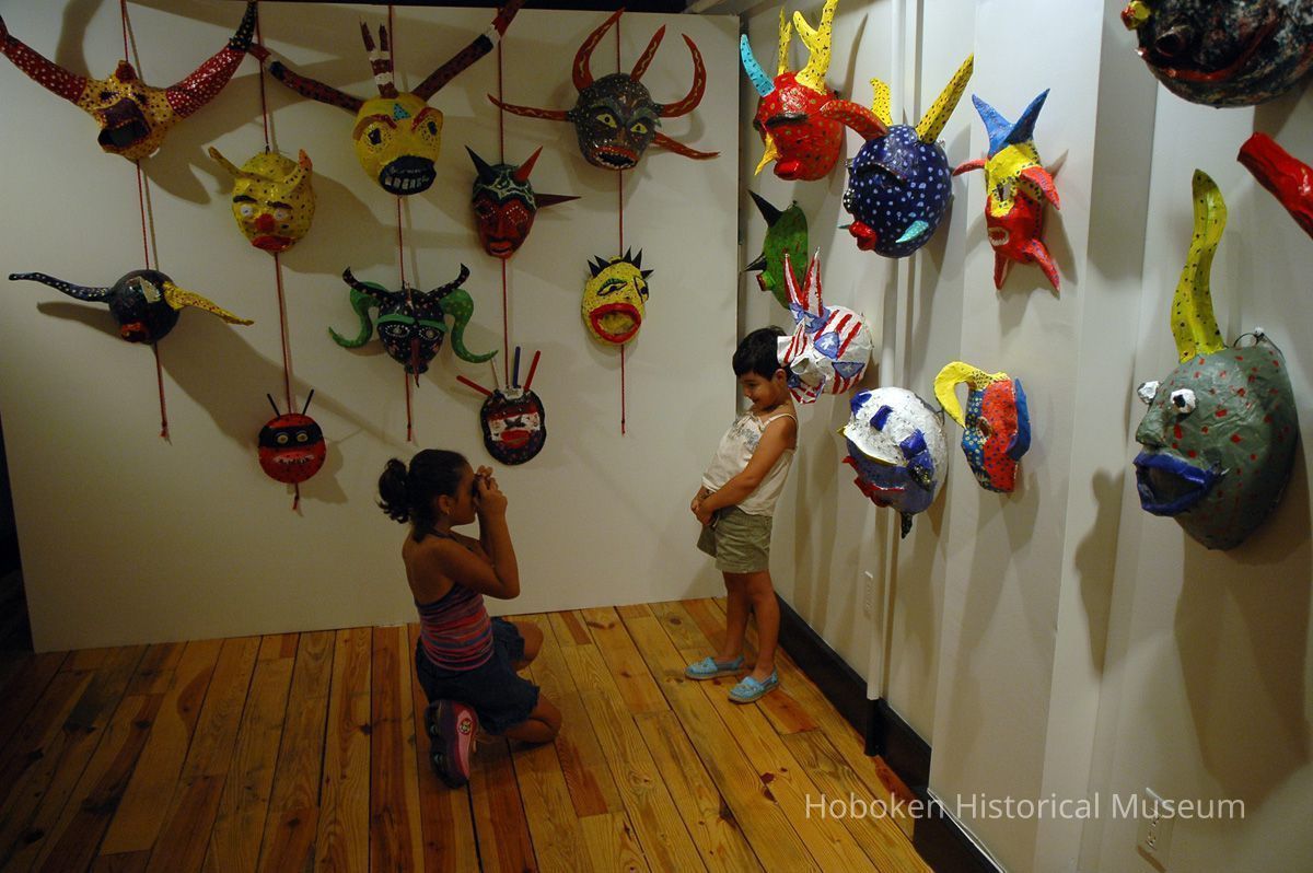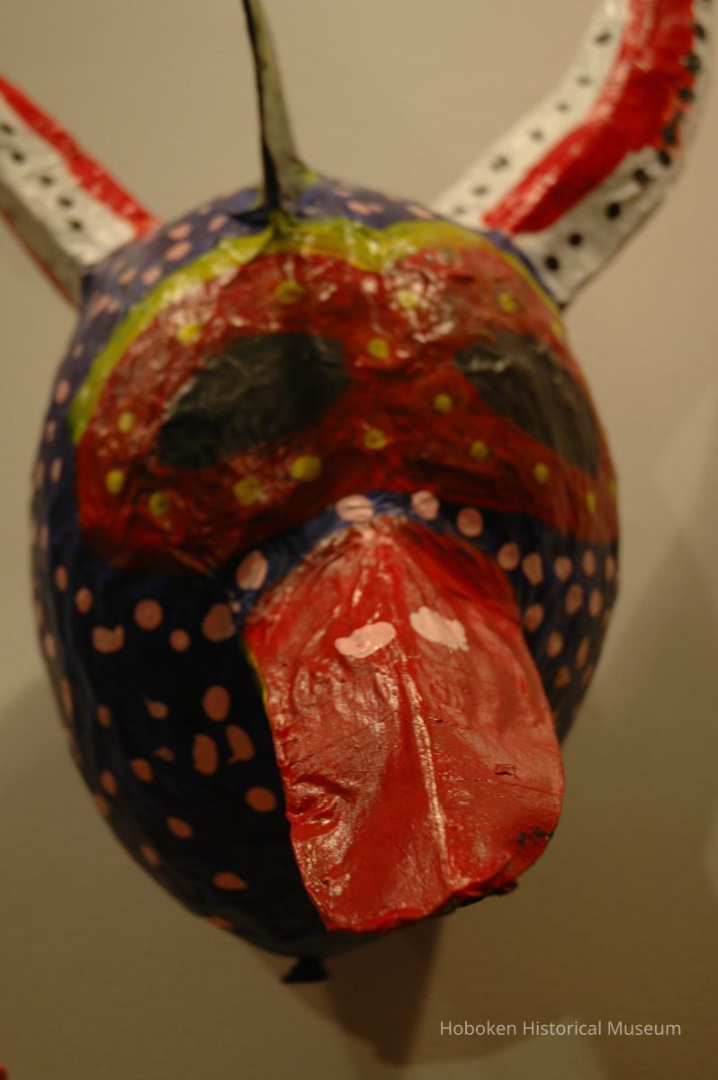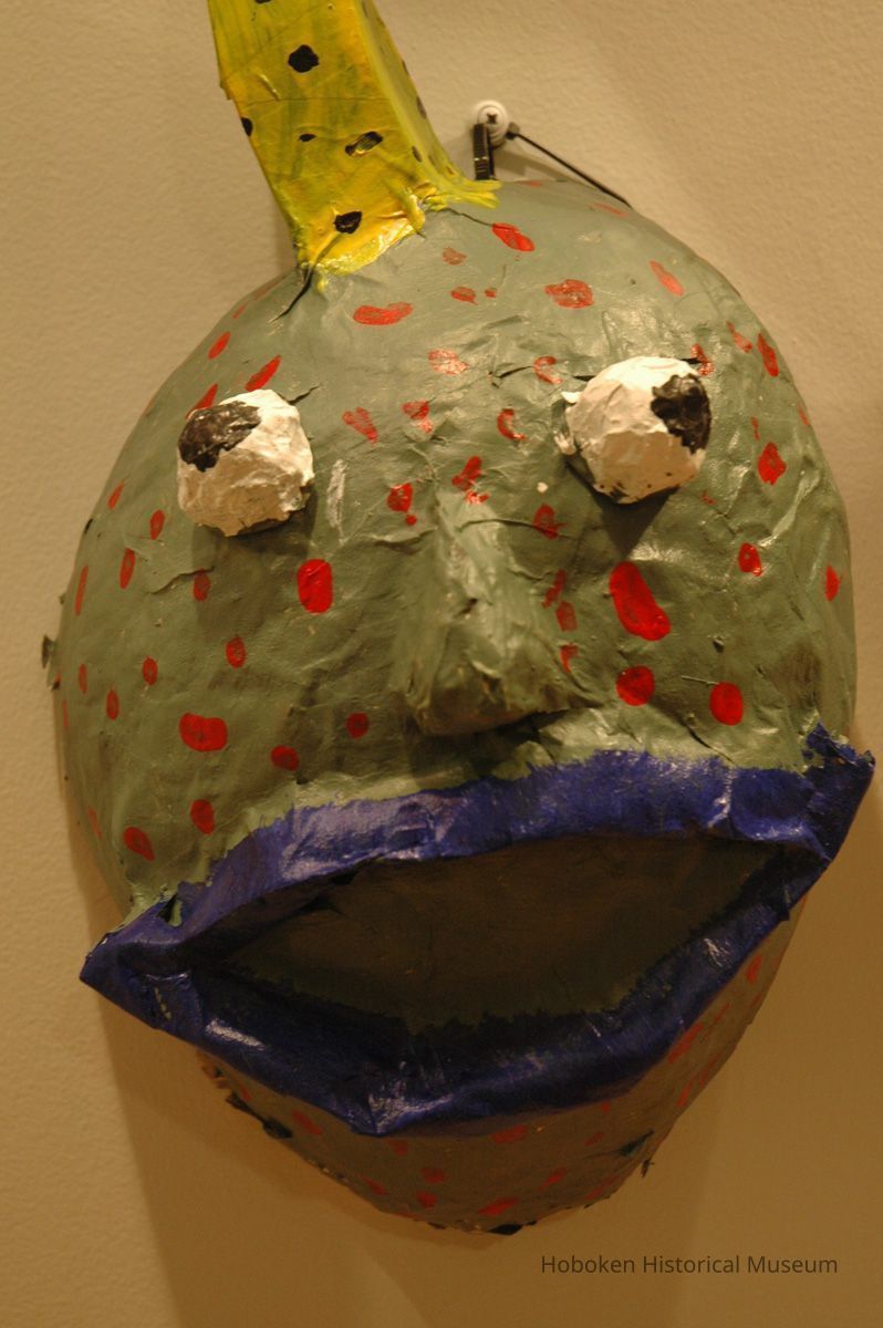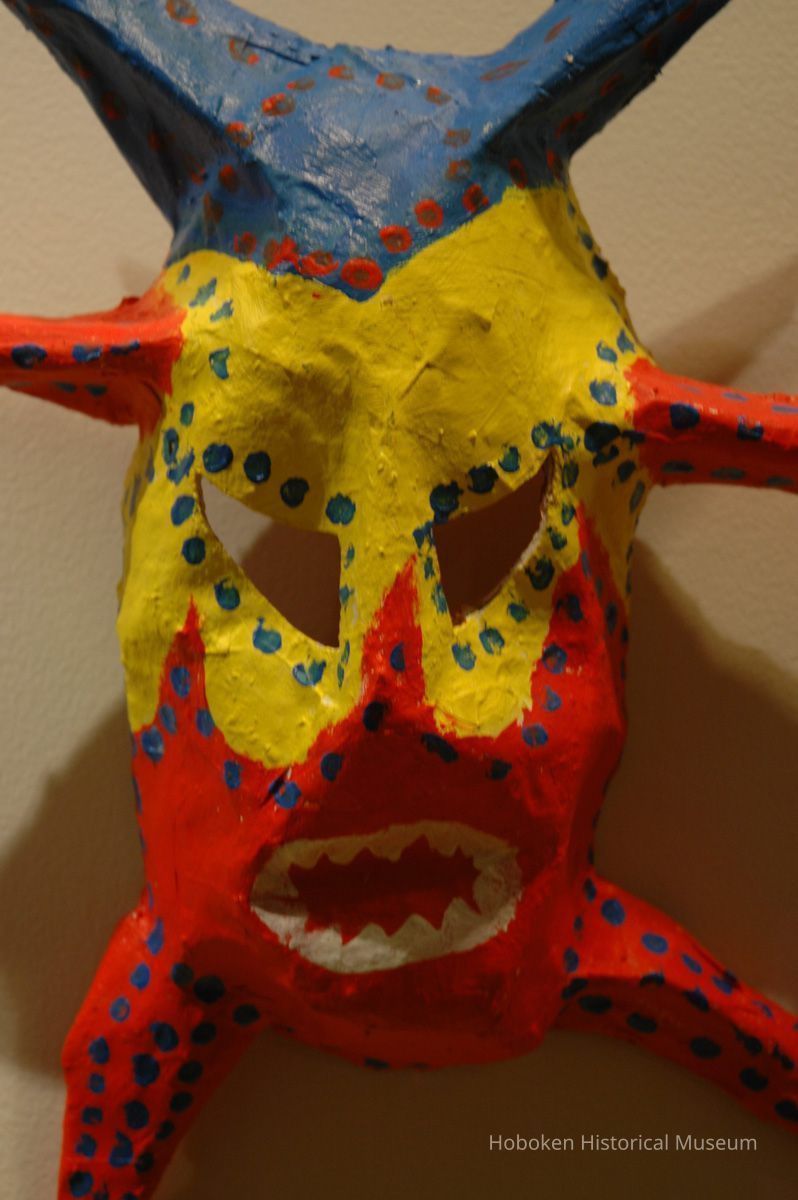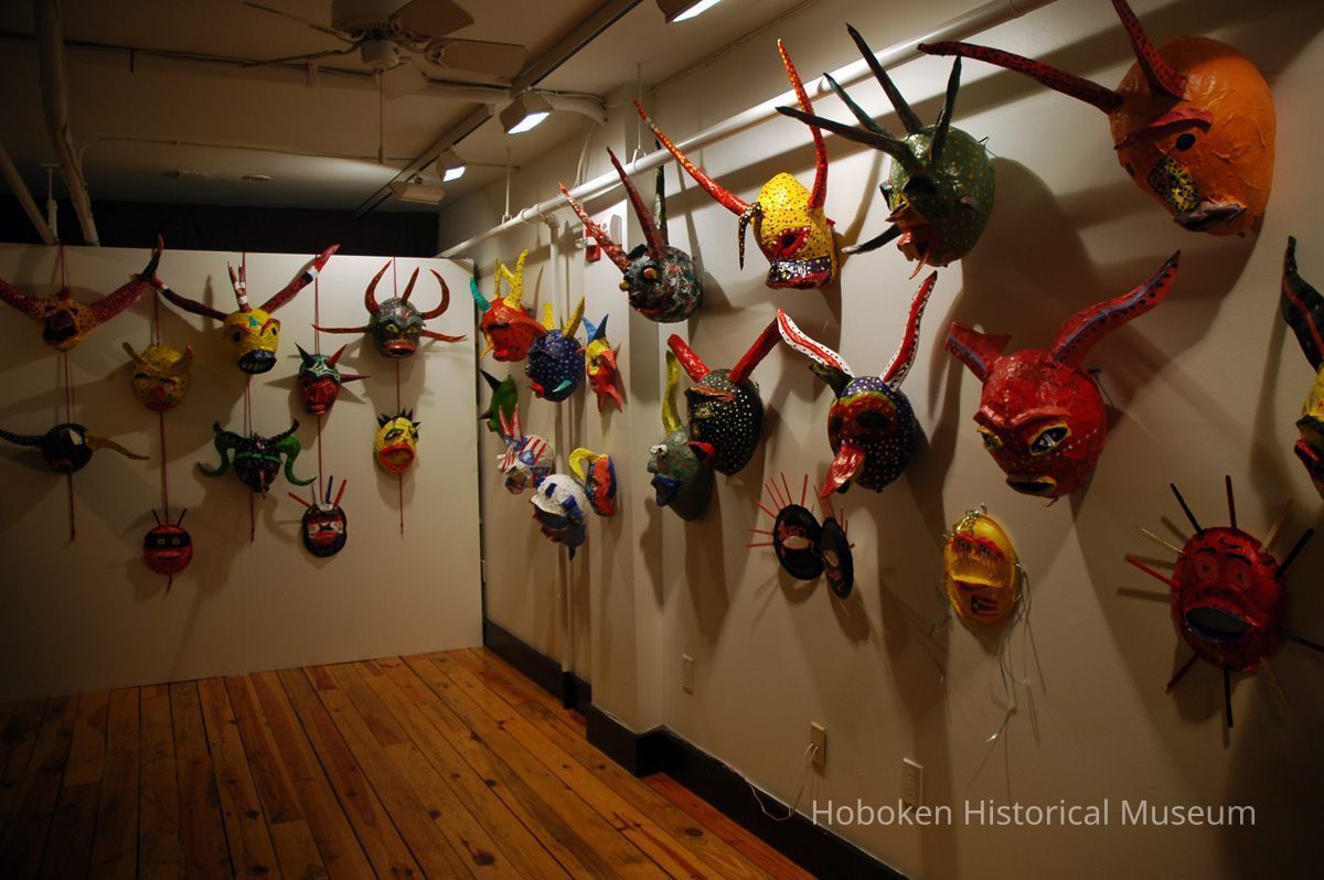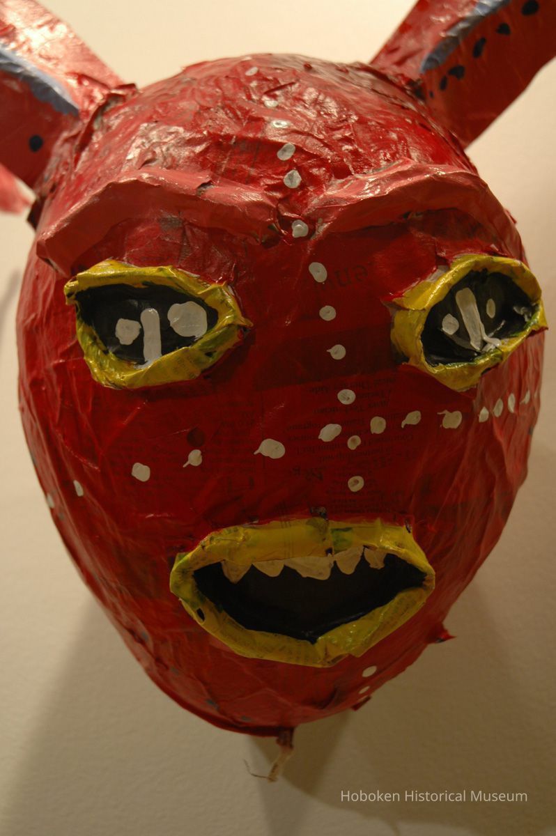 Notes: From The Vejigante and the Folk Festivals of Puerto Rico By Edwin Fontánez © 1996. Text below from exhibit of the masks in August-September 2006. ________________ The Vejigante (bay-he-GAHN-tay) is a fantastic, colorful character introduced into carnival celebrations hundreds of years ago. He is a classic example of the blending of African, Spanish, and Caribbean influences in Puerto Rican culture. During the carnival celebrations in Loiza Aldea and Ponce, the Vejigantes roam the streets in groups and chase children with their vejigas. The Vejigante is such an old character that he is even mentioned in the classic novel Don Quixote, written in 1605. Carnival in Ponce (pawn-say), a major city in the south, begins February 2 on "Dia de la Candelaria" (Day of the Bonfire). The masks are are characterized by their elaborate construction. Most are made of papier-mâché (shredded newspapers) and adorned with many horns and bells. The masks can be as big and elaborate as the artist's imagination. Commonly, they have a demonic or devilish appearance, but others resemble fantastic animals. __________________ The masks were made at the Hoboken Historical Museum during May and June of 2006. The mask-making classes were conducted by artist Ray Guzman with more than 25 children and parents participating. The mask starts with a balloon, then papier-mâché is applied over it along with horns and facial features before a final application of acrylic paint. Most who attended came to all four workshops and demonstrated a strong commitment to the project and created these incredible masks. The Museum wishes to thank artist Ray Guzman for teaching the classes, and a special thanks to both Tom Olivieri and Museum Trustee Inéz Garcia-Kiem for their advice and support. The project was funded by the Hudson County Office of Cultural Affairs, Tom DeGise, County Executive. Original or Copy: Digital copy Status: OK Status By: dw Status Date: 2006-11-28