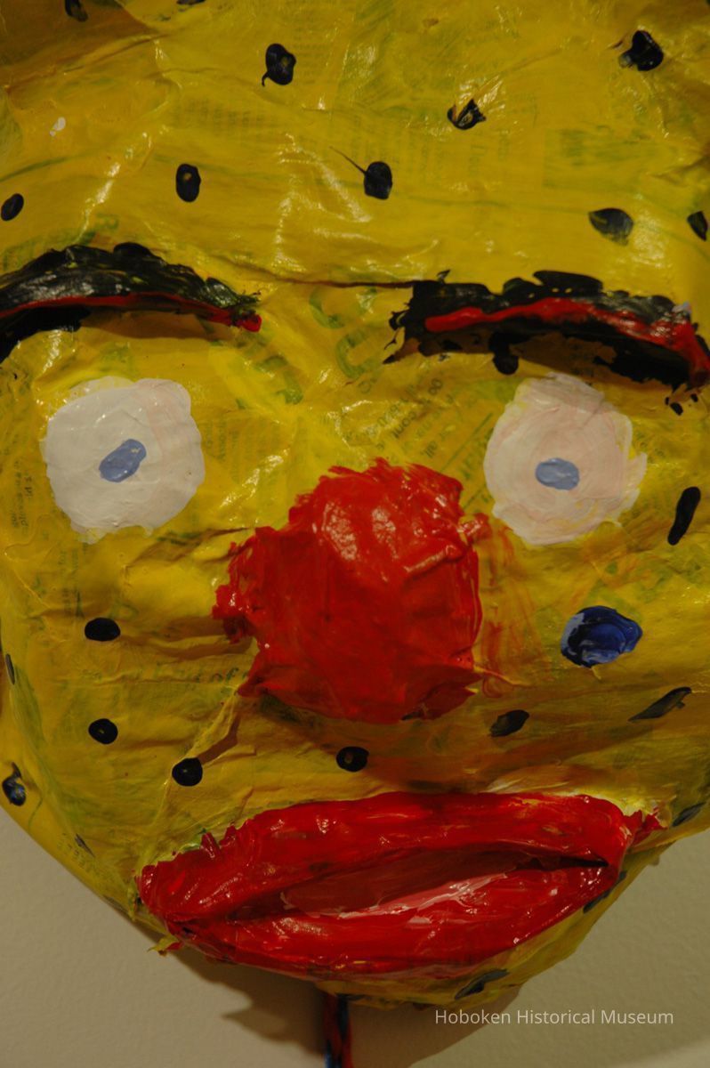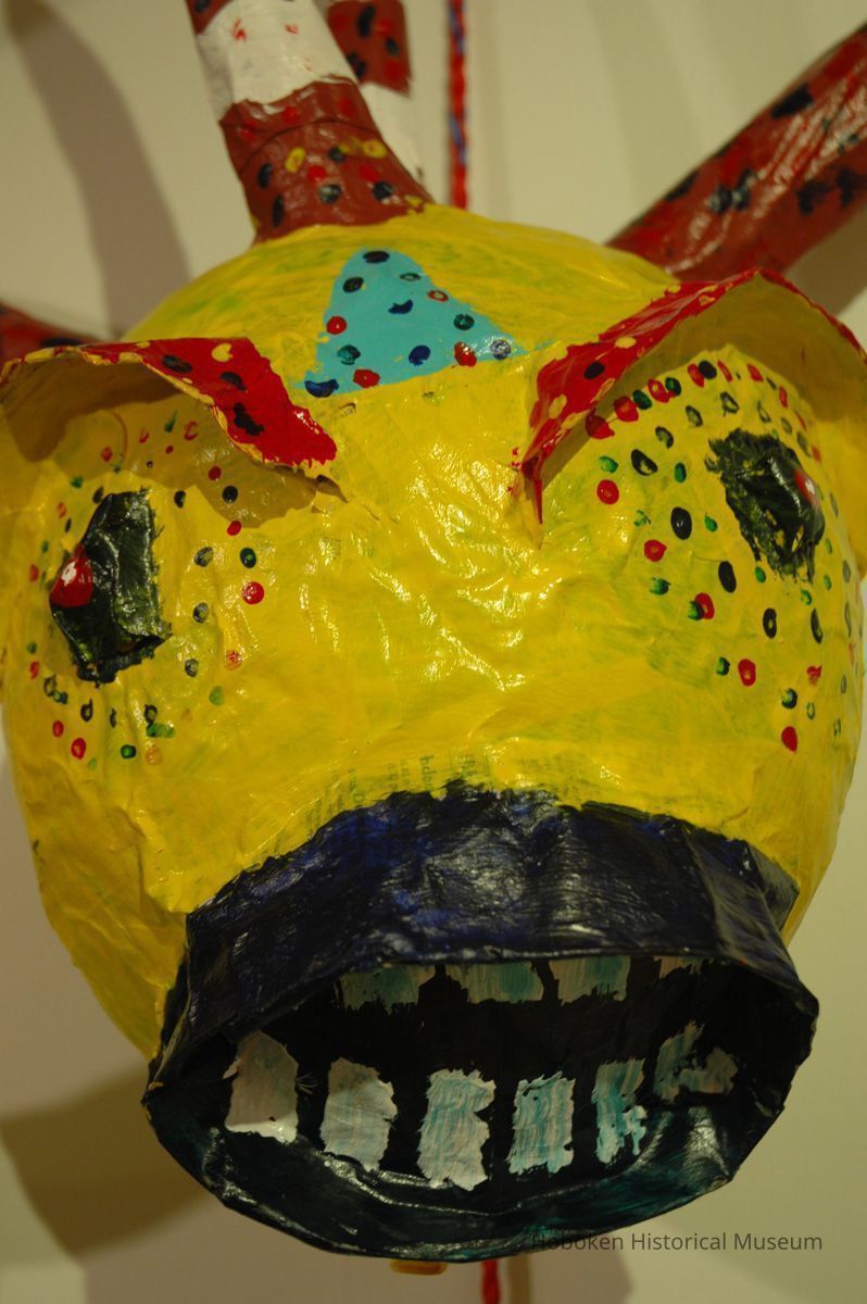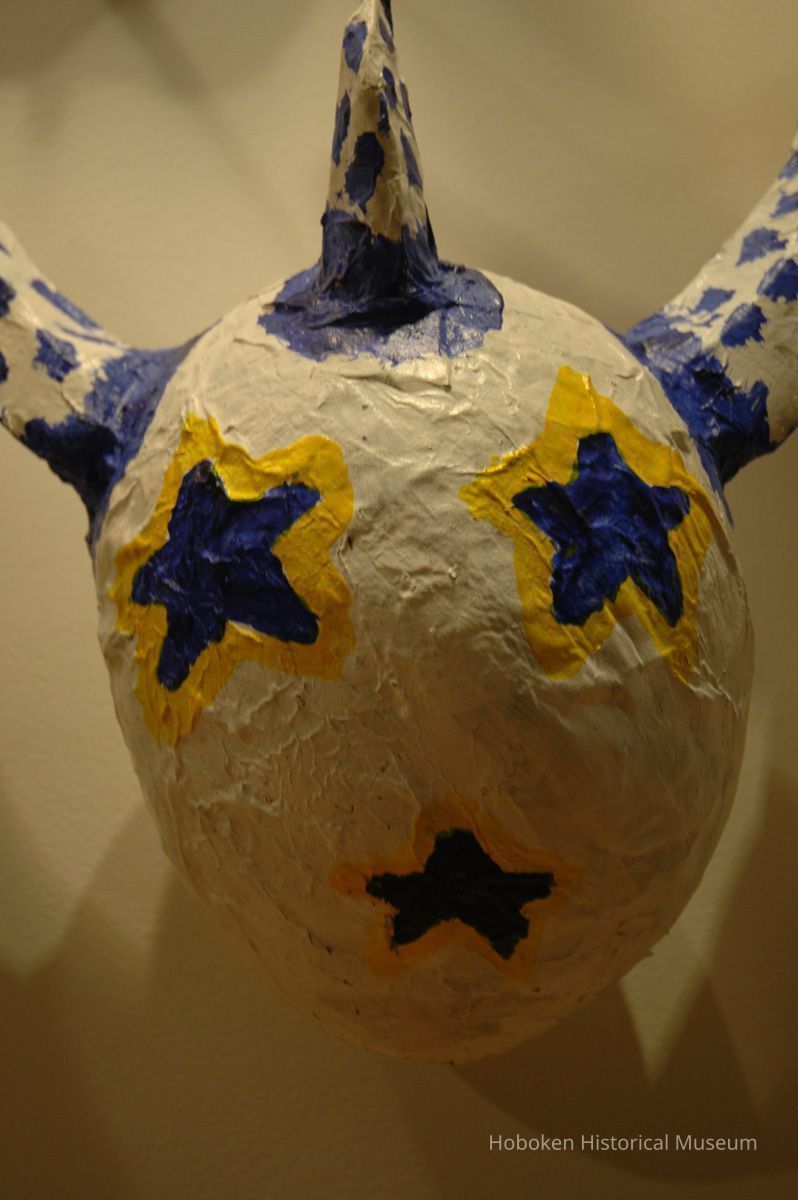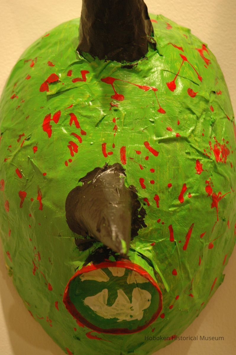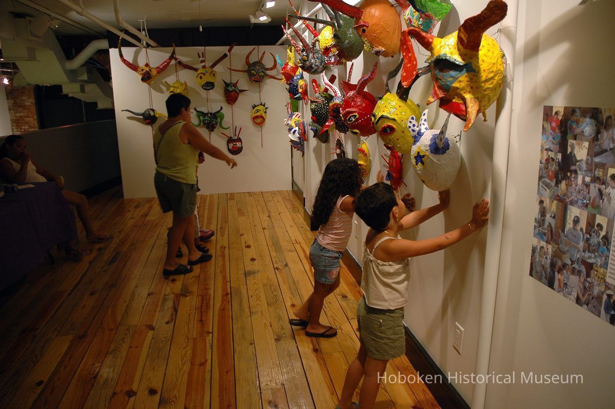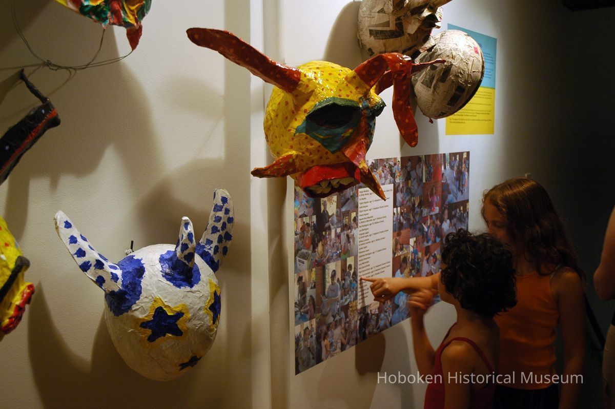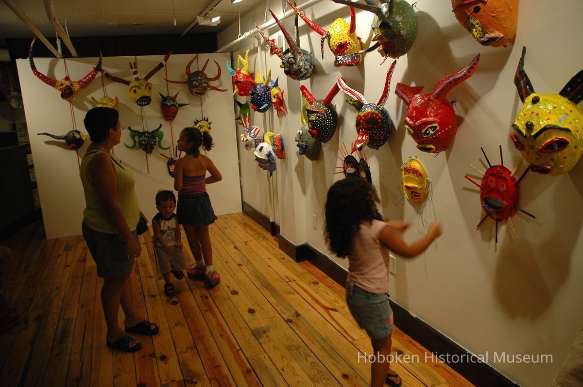 Notes: From The Vejigante and the Folk Festivals of Puerto Rico By Edwin Fontánez © 1996. Text below from exhibit of the masks in August-September 2006. ________________ The Vejigante (bay-he-GAHN-tay) is a fantastic, colorful character introduced into carnival celebrations hundreds of years ago. He is a classic example of the blending of African, Spanish, and Caribbean influences in Puerto Rican culture. During the carnival celebrations in Loiza Aldea and Ponce, the Vejigantes roam the streets in groups and chase children with their vejigas. The Vejigante is such an old character that he is even mentioned in the classic novel Don Quixote, written in 1605. Carnival in Ponce (pawn-say), a major city in the south, begins February 2 on "Dia de la Candelaria" (Day of the Bonfire). The masks are are characterized by their elaborate construction. Most are made of papier-mâché (shredded newspapers) and adorned with many horns and bells. The masks can be as big and elaborate as the artist's imagination. Commonly, they have a demonic or devilish appearance, but others resemble fantastic animals. __________________ The masks were made at the Hoboken Historical Museum during May and June of 2006. The mask-making classes were conducted by artist Ray Guzman with more than 25 children and parents participating. The mask starts with a balloon, then papier-mâché is applied over it along with horns and facial features before a final application of acrylic paint. Most who attended came to all four workshops and demonstrated a strong commitment to the project and created these incredible masks. The Museum wishes to thank artist Ray Guzman for teaching the classes, and a special thanks to both Tom Olivieri and Museum Trustee Inéz Garcia-Kiem for their advice and support. The project was funded by the Hudson County Office of Cultural Affairs, Tom DeGise, County Executive. Original or Copy: Digital copy Status: OK Status By: dw Status Date: 2006-11-28