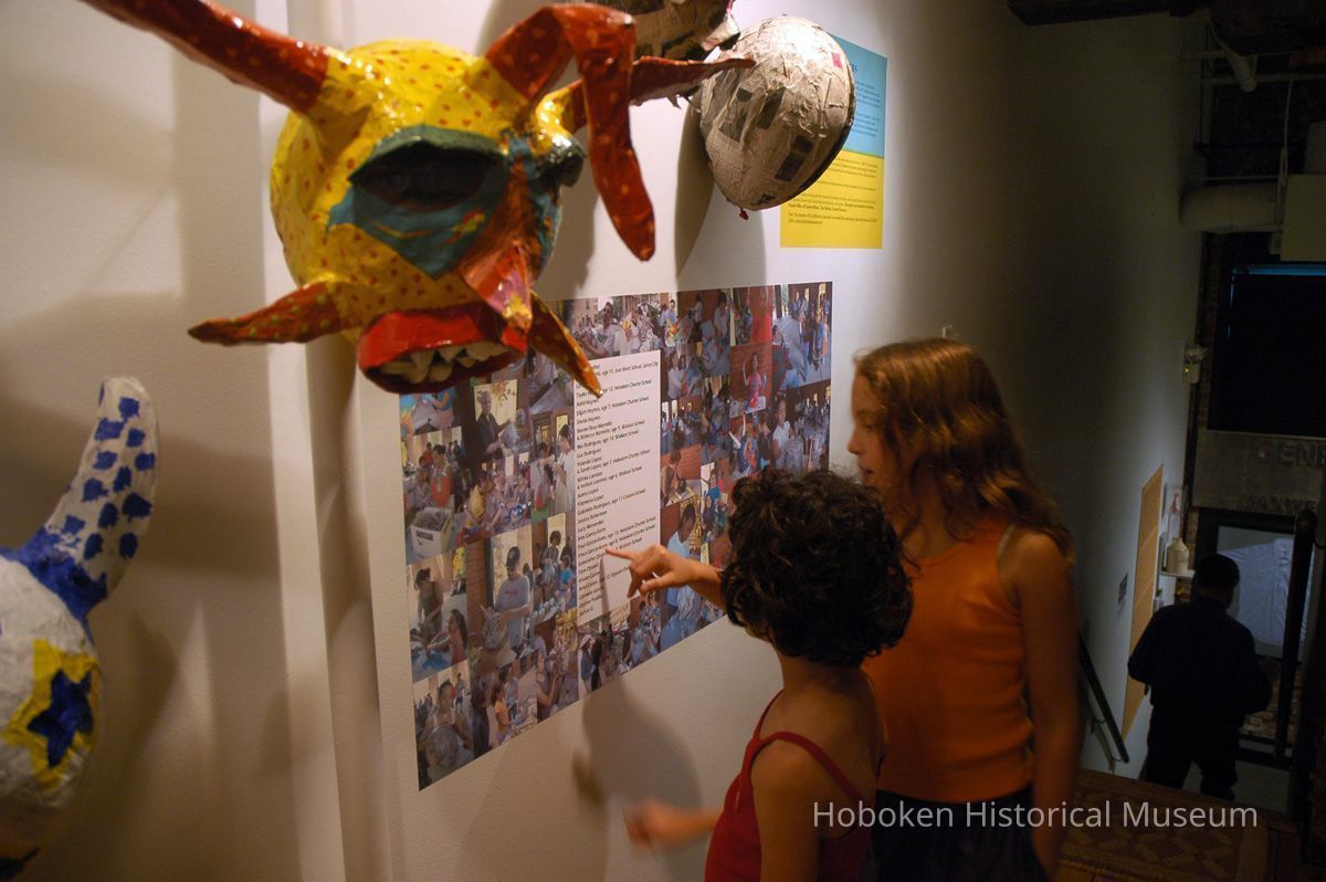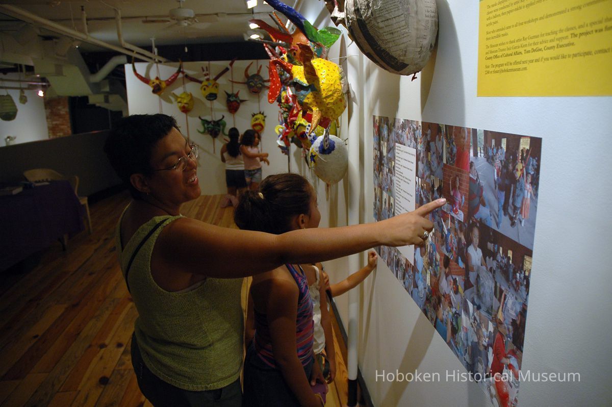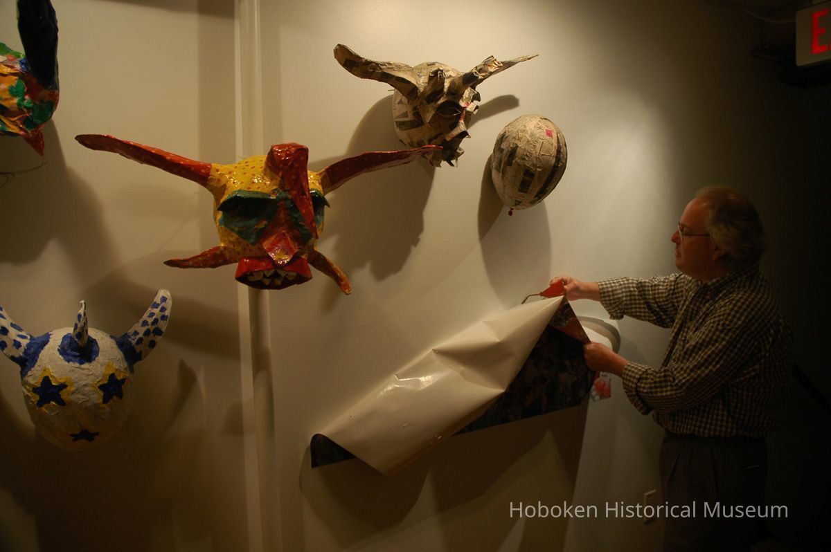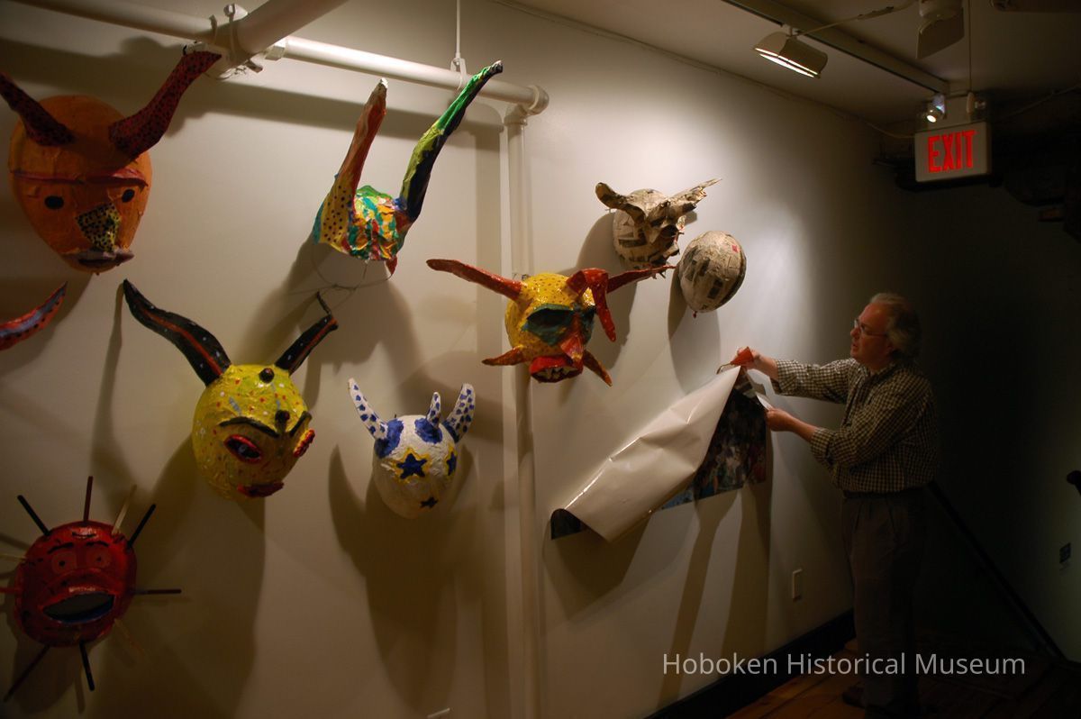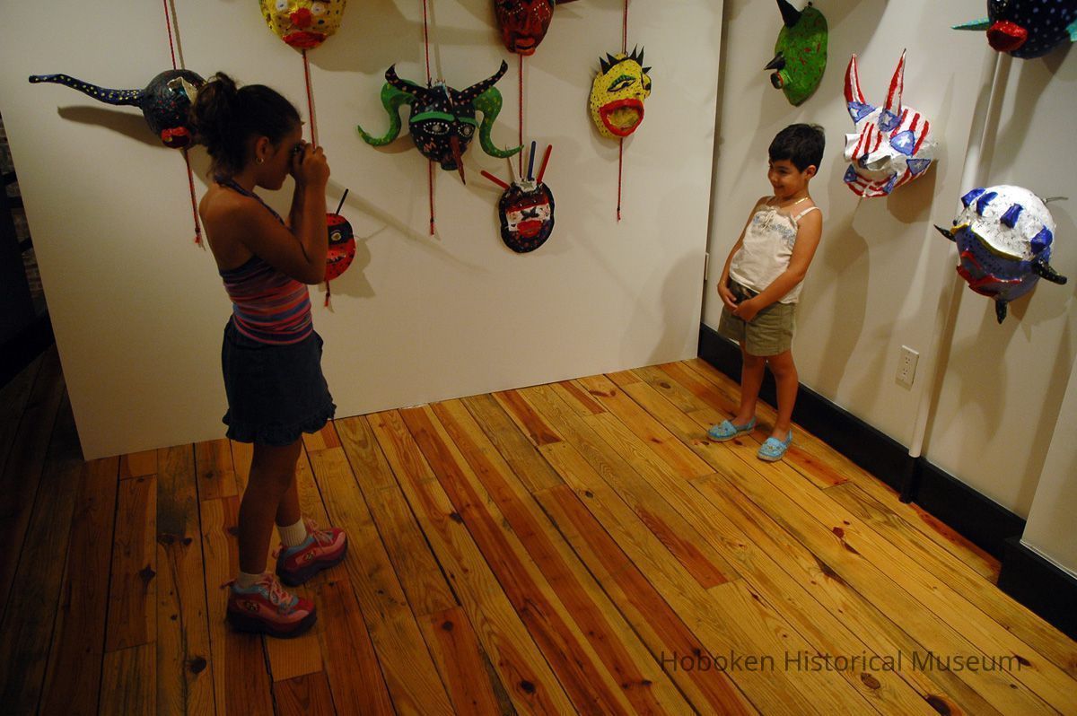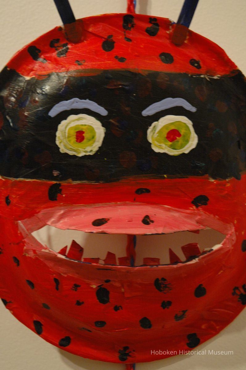 Notes: From The Vejigante and the Folk Festivals of Puerto Rico By Edwin Fontánez © 1996. Text below from exhibit of the masks in August-September 2006. ________________ The Vejigante (bay-he-GAHN-tay) is a fantastic, colorful character introduced into carnival celebrations hundreds of years ago. He is a classic example of the blending of African, Spanish, and Caribbean influences in Puerto Rican culture. During the carnival celebrations in Loiza Aldea and Ponce, the Vejigantes roam the streets in groups and chase children with their vejigas. The Vejigante is such an old character that he is even mentioned in the classic novel Don Quixote, written in 1605. Carnival in Ponce (pawn-say), a major city in the south, begins February 2 on "Dia de la Candelaria" (Day of the Bonfire). The masks are are characterized by their elaborate construction. Most are made of papier-mâché (shredded newspapers) and adorned with many horns and bells. The masks can be as big and elaborate as the artist's imagination. Commonly, they have a demonic or devilish appearance, but others resemble fantastic animals. __________________ The masks were made at the Hoboken Historical Museum during May and June of 2006. The mask-making classes were conducted by artist Ray Guzman with more than 25 children and parents participating. The mask starts with a balloon, then papier-mâché is applied over it along with horns and facial features before a final application of acrylic paint. Most who attended came to all four workshops and demonstrated a strong commitment to the project and created these incredible masks. The Museum wishes to thank artist Ray Guzman for teaching the classes, and a special thanks to both Tom Olivieri and Museum Trustee Inéz Garcia-Kiem for their advice and support. The project was funded by the Hudson County Office of Cultural Affairs, Tom DeGise, County Executive. Original or Copy: Digital copy Status: OK Status By: dw Status Date: 2006-11-28