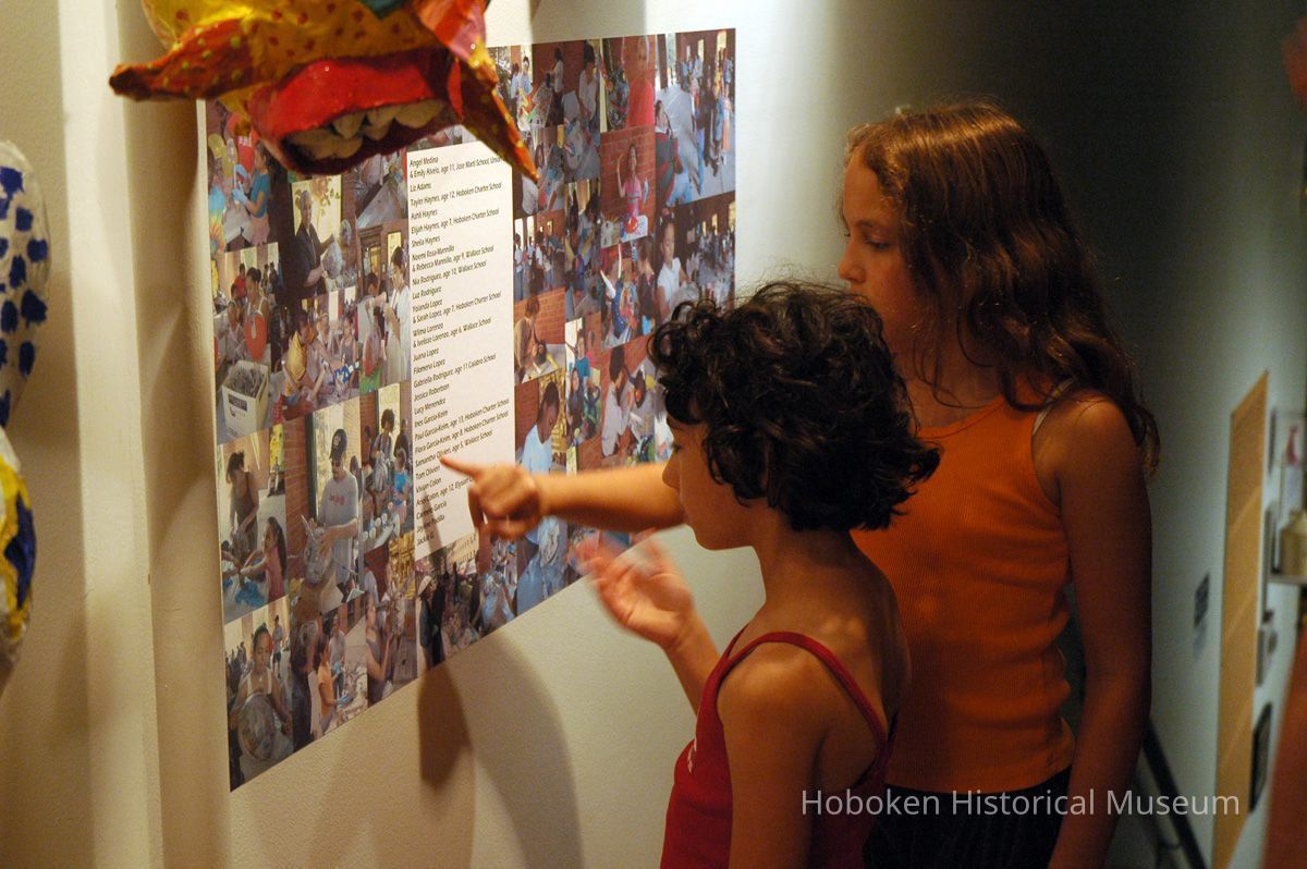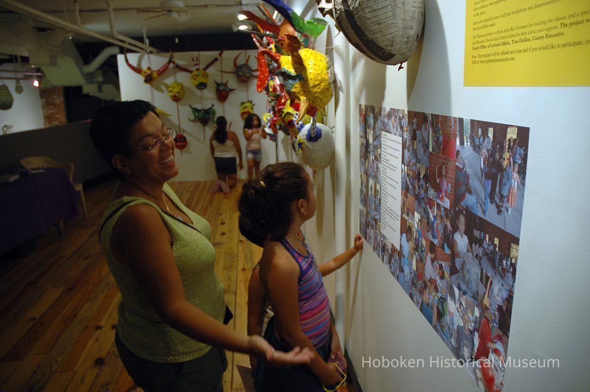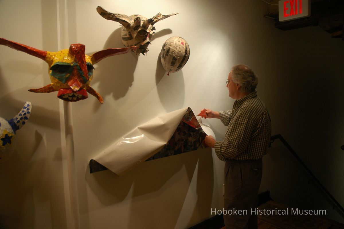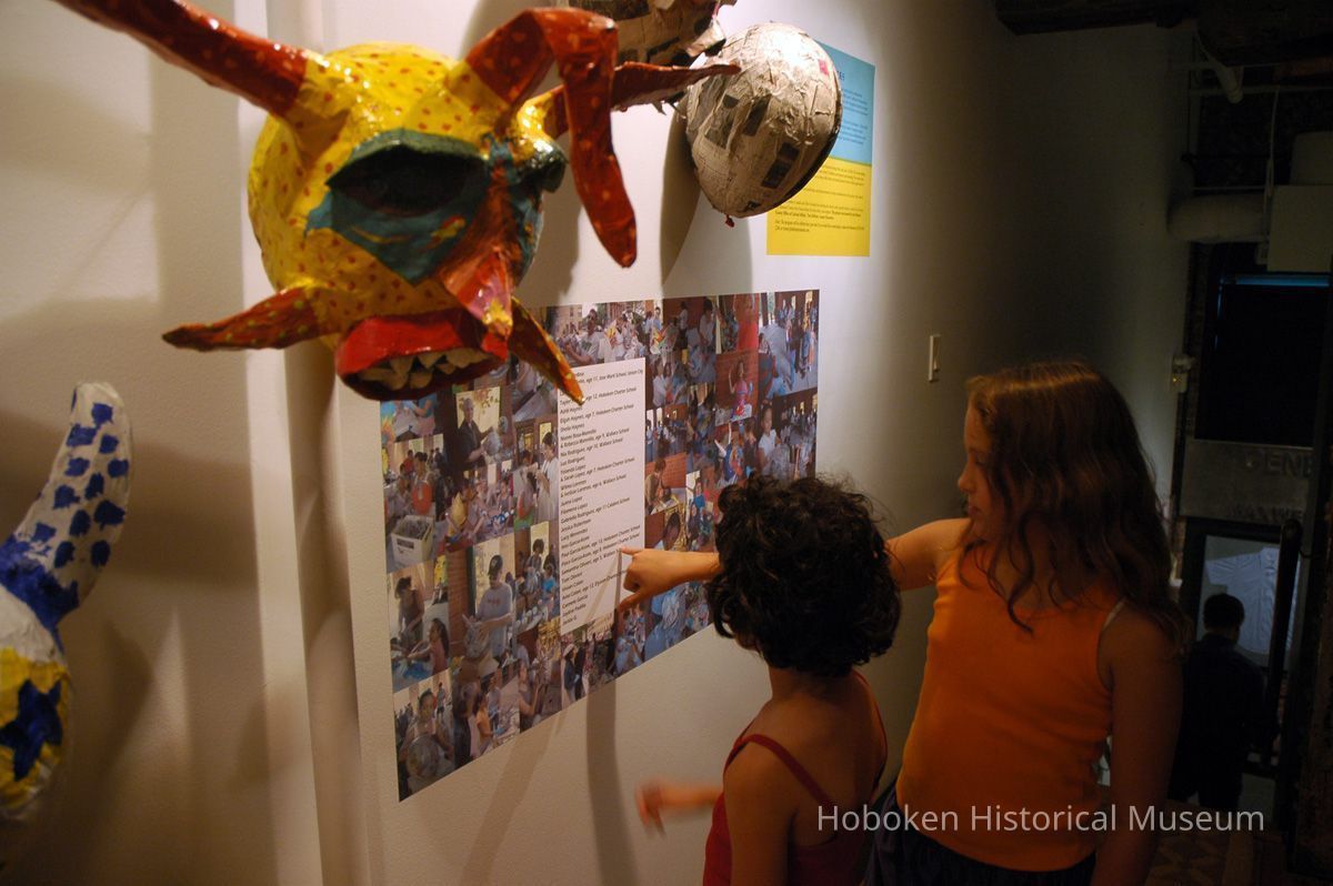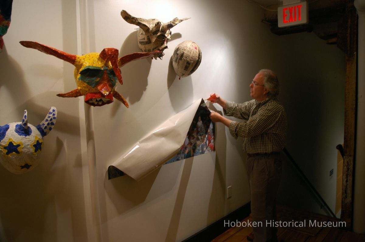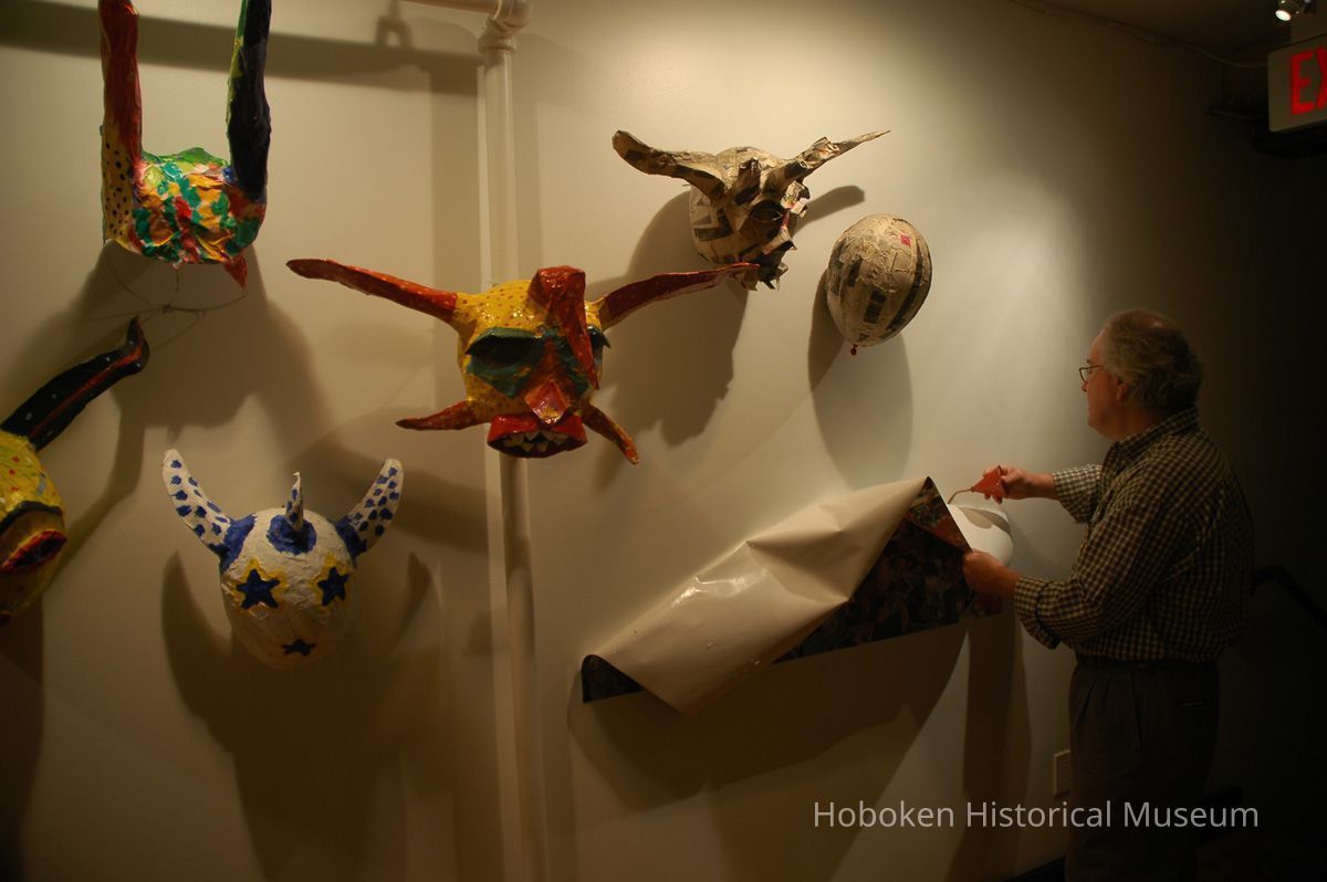 Notes: From The Vejigante and the Folk Festivals of Puerto Rico By Edwin Fontánez © 1996. Text below from exhibit of the masks in August-September 2006. ________________ The Vejigante (bay-he-GAHN-tay) is a fantastic, colorful character introduced into carnival celebrations hundreds of years ago. He is a classic example of the blending of African, Spanish, and Caribbean influences in Puerto Rican culture. During the carnival celebrations in Loiza Aldea and Ponce, the Vejigantes roam the streets in groups and chase children with their vejigas. The Vejigante is such an old character that he is even mentioned in the classic novel Don Quixote, written in 1605. Carnival in Ponce (pawn-say), a major city in the south, begins February 2 on "Dia de la Candelaria" (Day of the Bonfire). The masks are are characterized by their elaborate construction. Most are made of papier-mâché (shredded newspapers) and adorned with many horns and bells. The masks can be as big and elaborate as the artist's imagination. Commonly, they have a demonic or devilish appearance, but others resemble fantastic animals. __________________ The masks were made at the Hoboken Historical Museum during May and June of 2006. The mask-making classes were conducted by artist Ray Guzman with more than 25 children and parents participating. The mask starts with a balloon, then papier-mâché is applied over it along with horns and facial features before a final application of acrylic paint. Most who attended came to all four workshops and demonstrated a strong commitment to the project and created these incredible masks. The Museum wishes to thank artist Ray Guzman for teaching the classes, and a special thanks to both Tom Olivieri and Museum Trustee Inéz Garcia-Kiem for their advice and support. The project was funded by the Hudson County Office of Cultural Affairs, Tom DeGise, County Executive. Original or Copy: Digital copy Status: OK Status By: dw Status Date: 2006-11-28