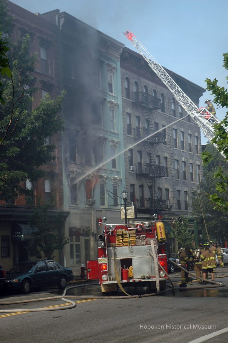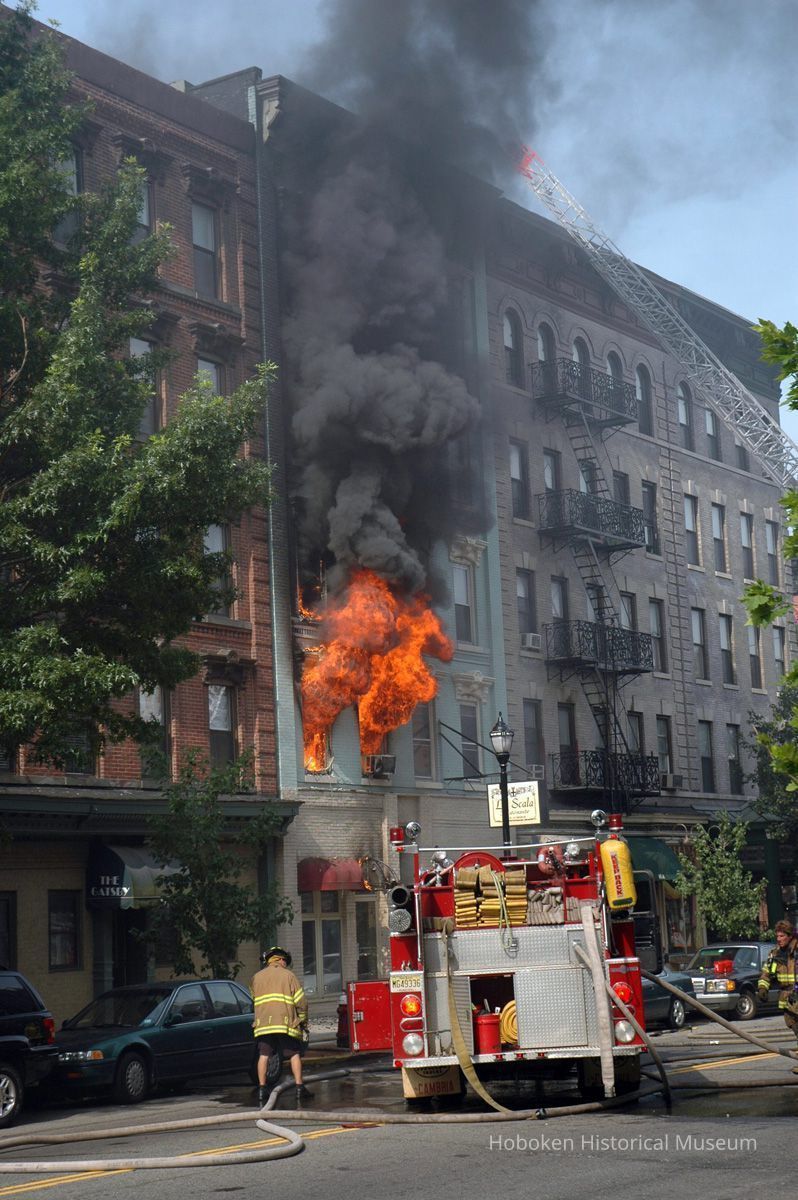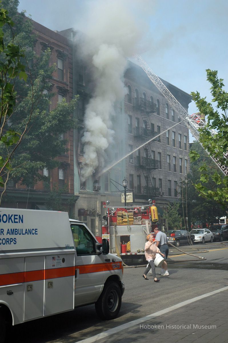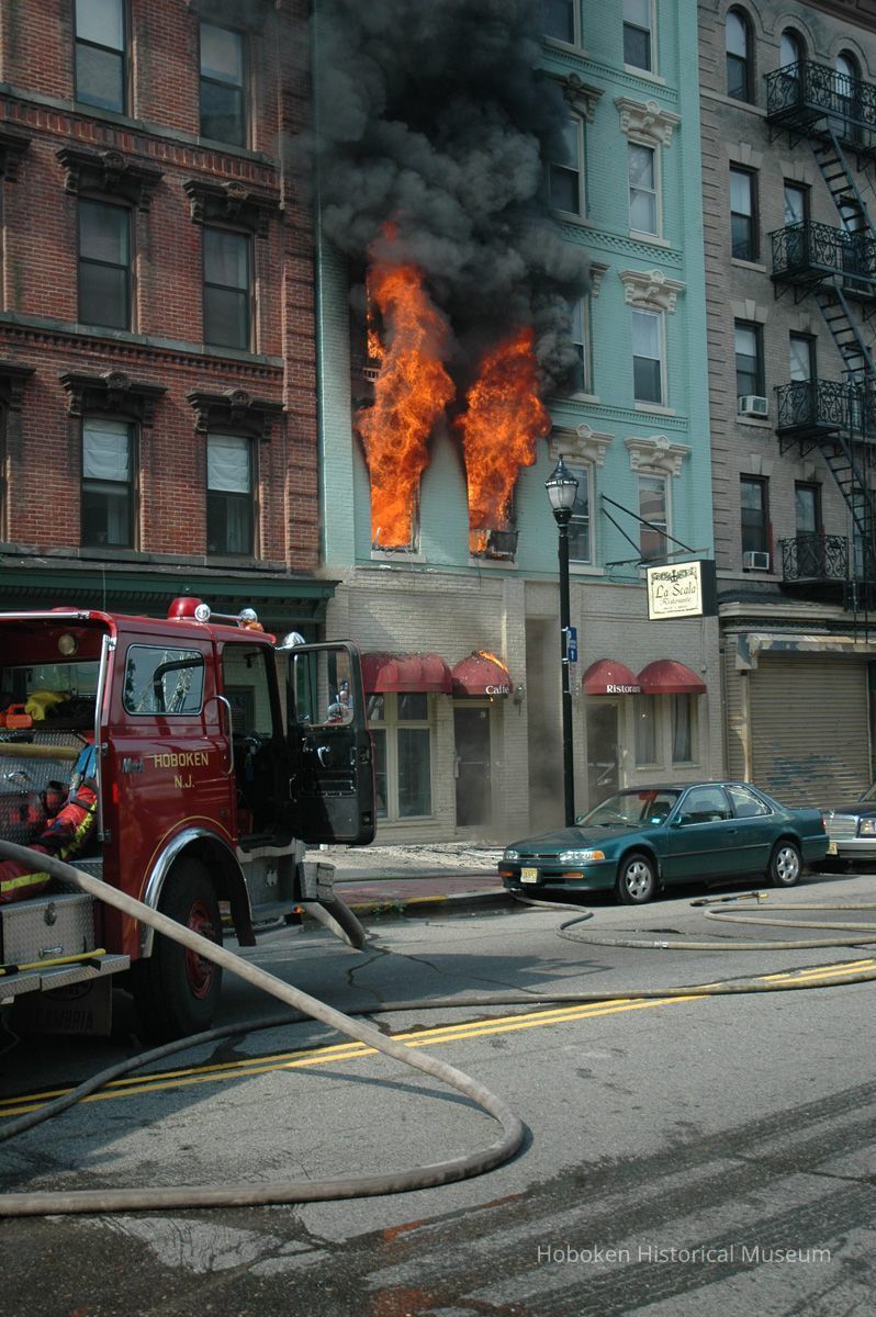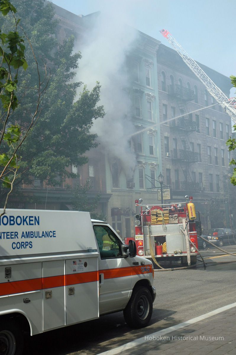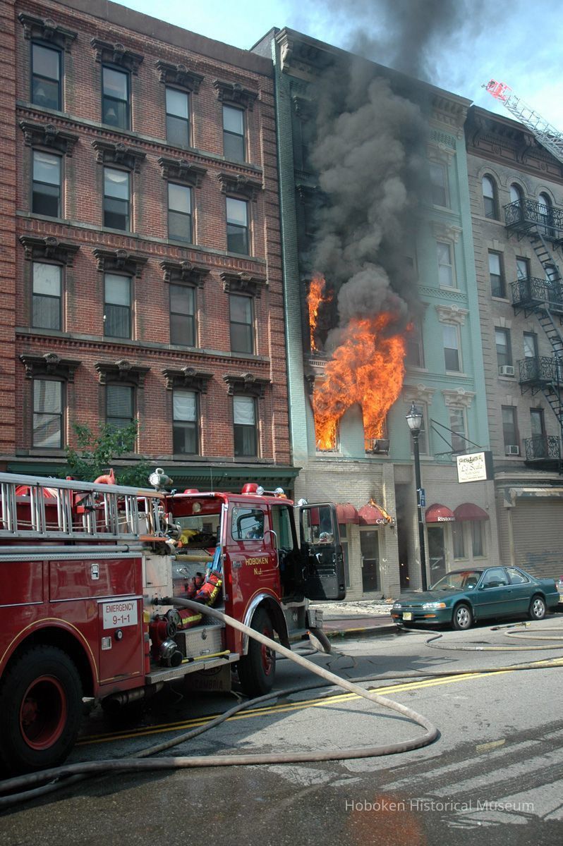 La Scala Ristorante was the former first floor tenant. Hoboken Fire Department, Police Department personnel and other people are not identified. A Hoboken Volunteer Ambulance Corps vehicle is seen.