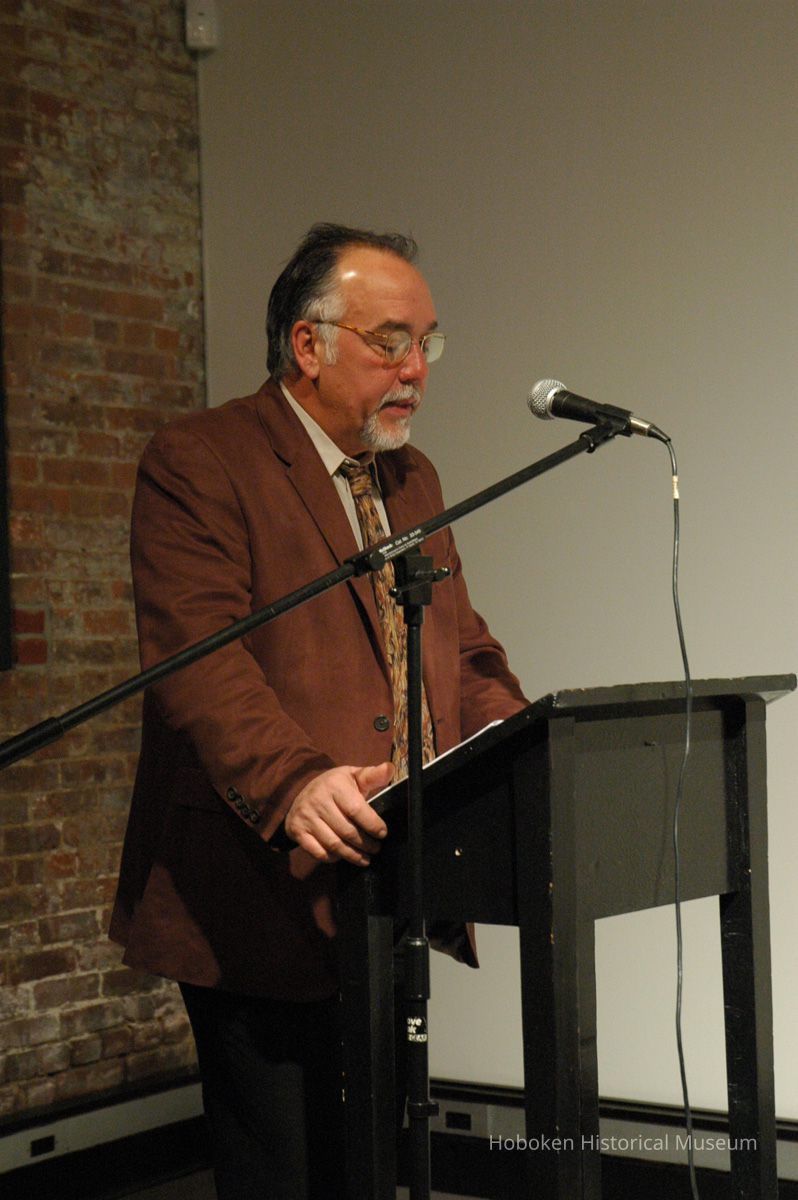 Color photographs, four, of Fred Gardaphe presenting lecture "Class Consequences: The Italian American Worker Writer" about Pietro di Donato at Museum, Feb. 26, 2006.