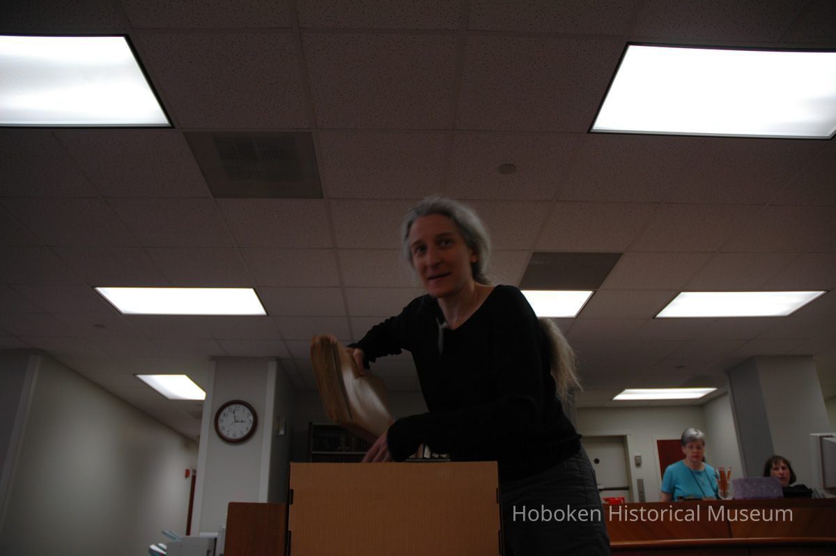 Color photos, 4, of Holly Metz doing research for Hoboken Historical Museum, Trenton, May 4, 2006.