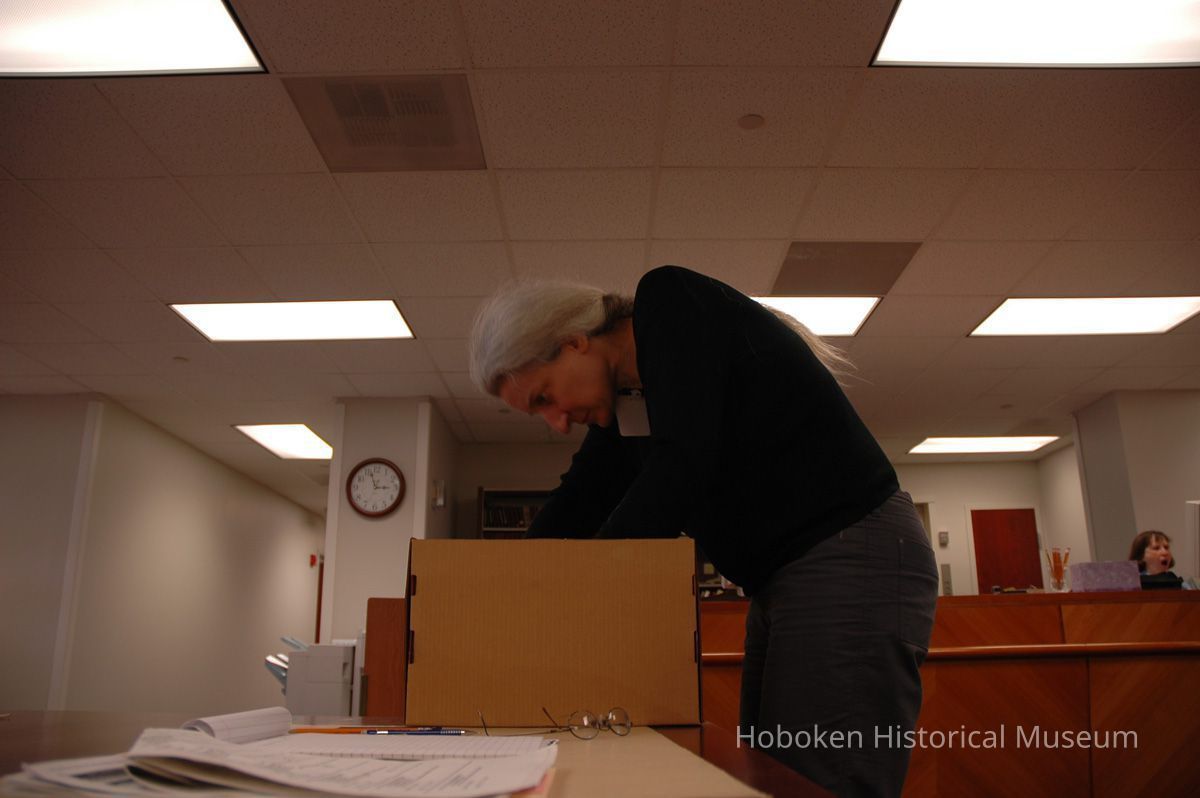 Color photographs, four, of Holly Metz doing research for Hoboken Historical Museum, Trenton, May 4, 2006.