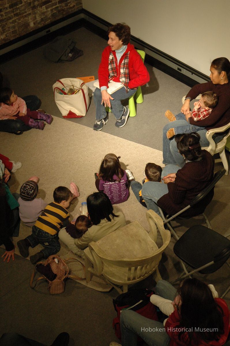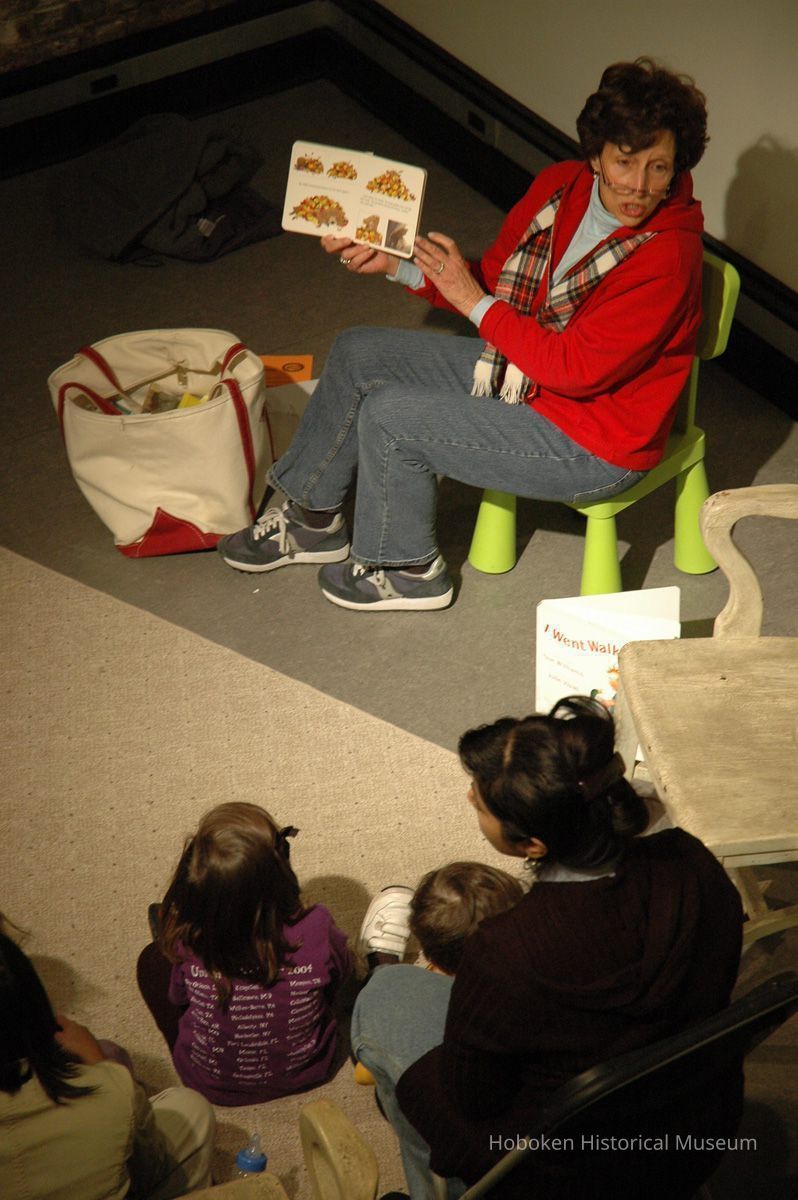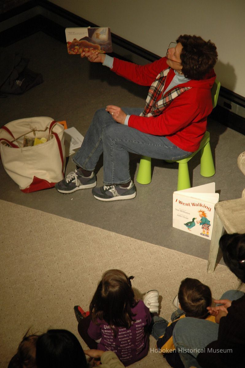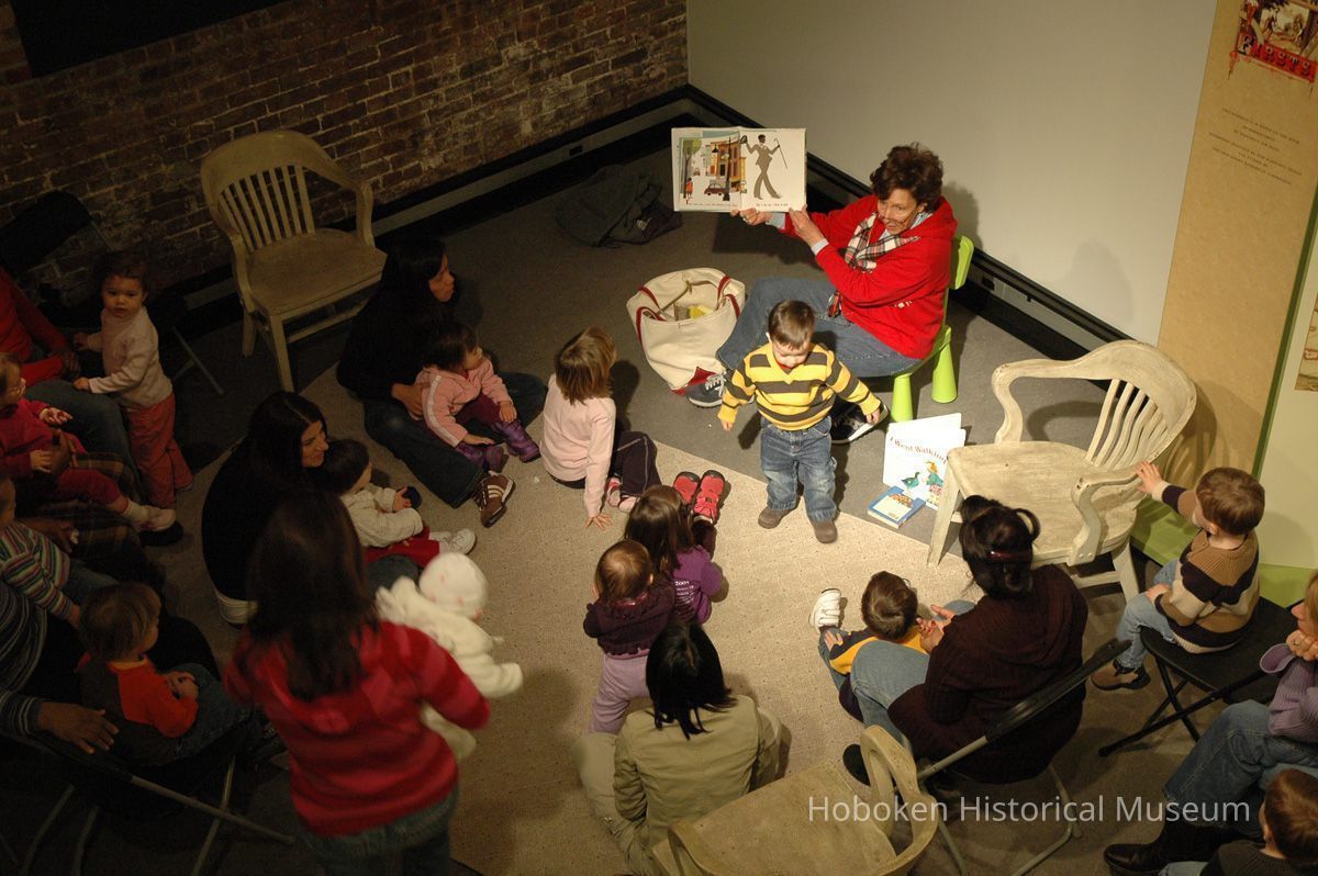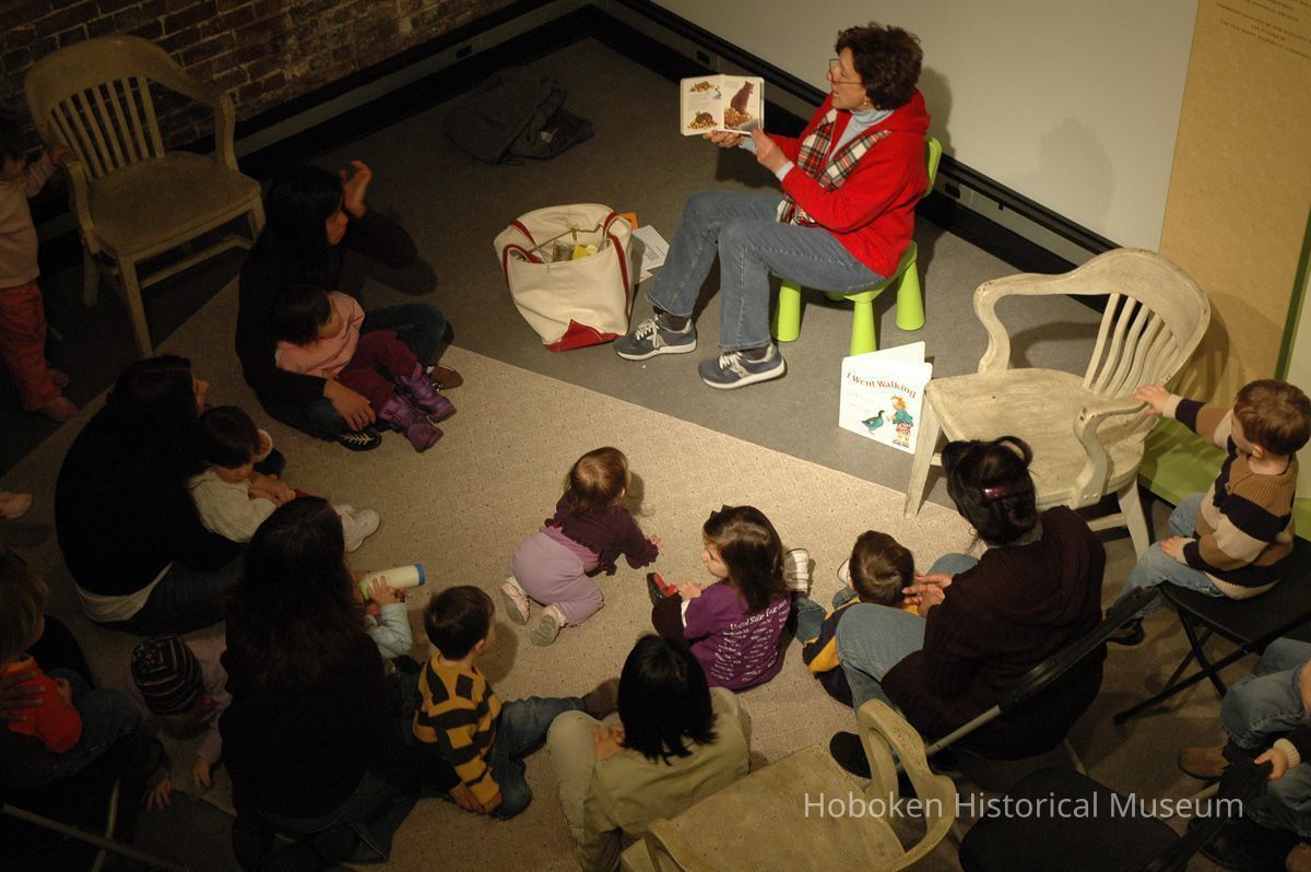 Color photos, 20, of Penny Metsch reading to a Story Time children's group, HHM, Hoboken, March 2, 2006.