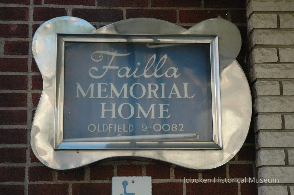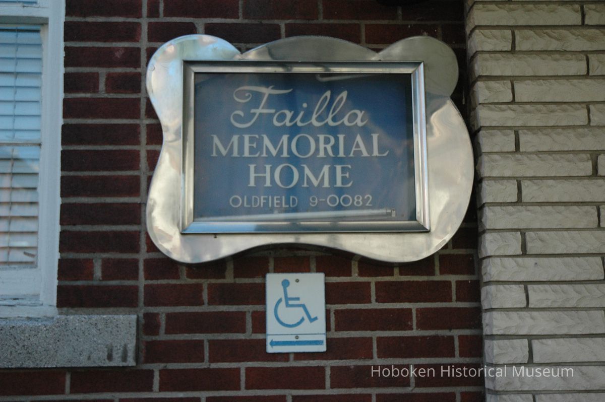 Color photos, 3, of sign for Failla Memorial Home, Hoboken, August 12, 2006.