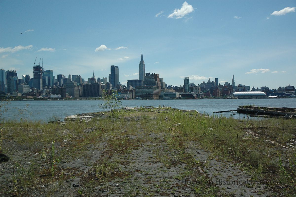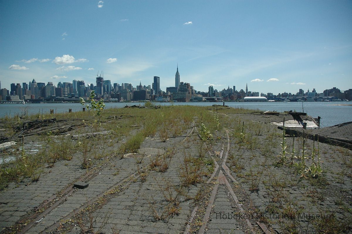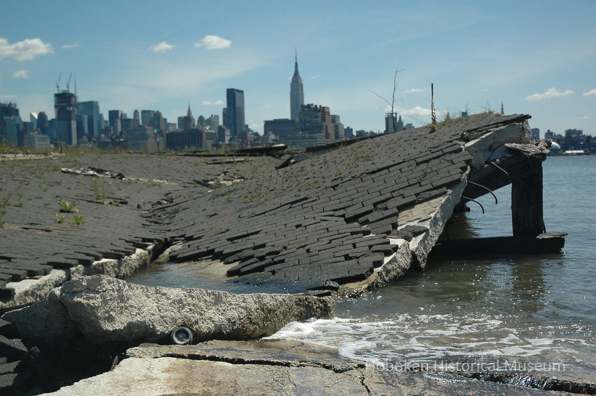 Color photographs, four, of views from Hoboken towards New York City with a crumbling pier, August 12, 2006.