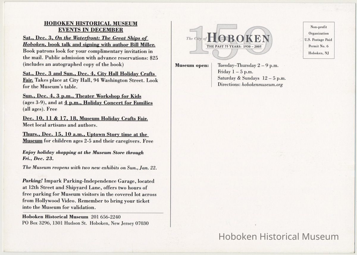Hoboken Historical Museum Events in December (2005.) Imprinted exhibit card.