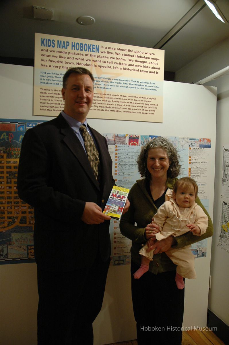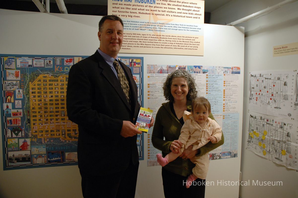 Color photographs, three, of Carol Losos with daughter Tessa and a PSE&G representative at Kids Map Hoboken exhibition, Hoboken Historical Museum, Hoboken, November 14, 2006.